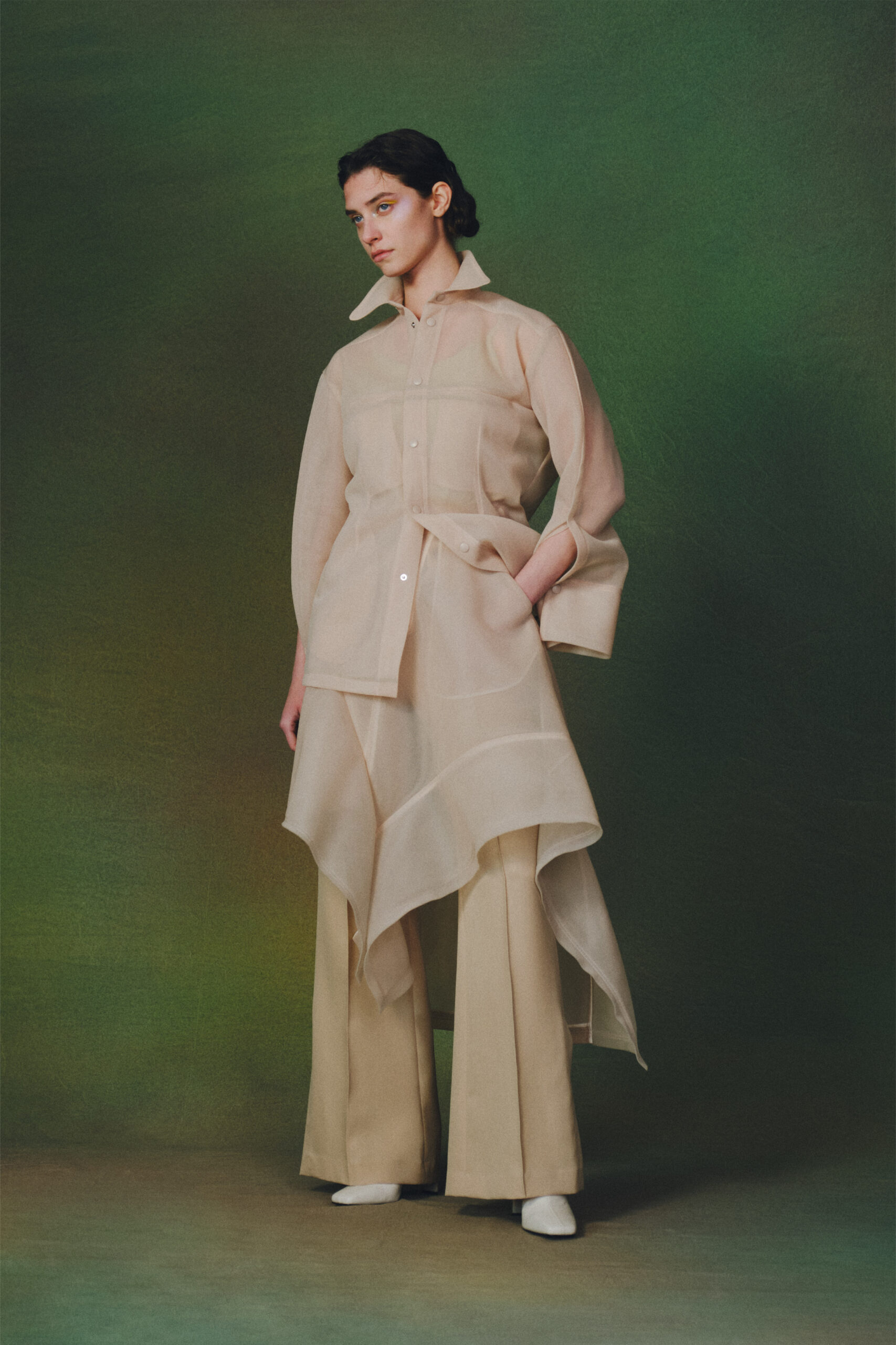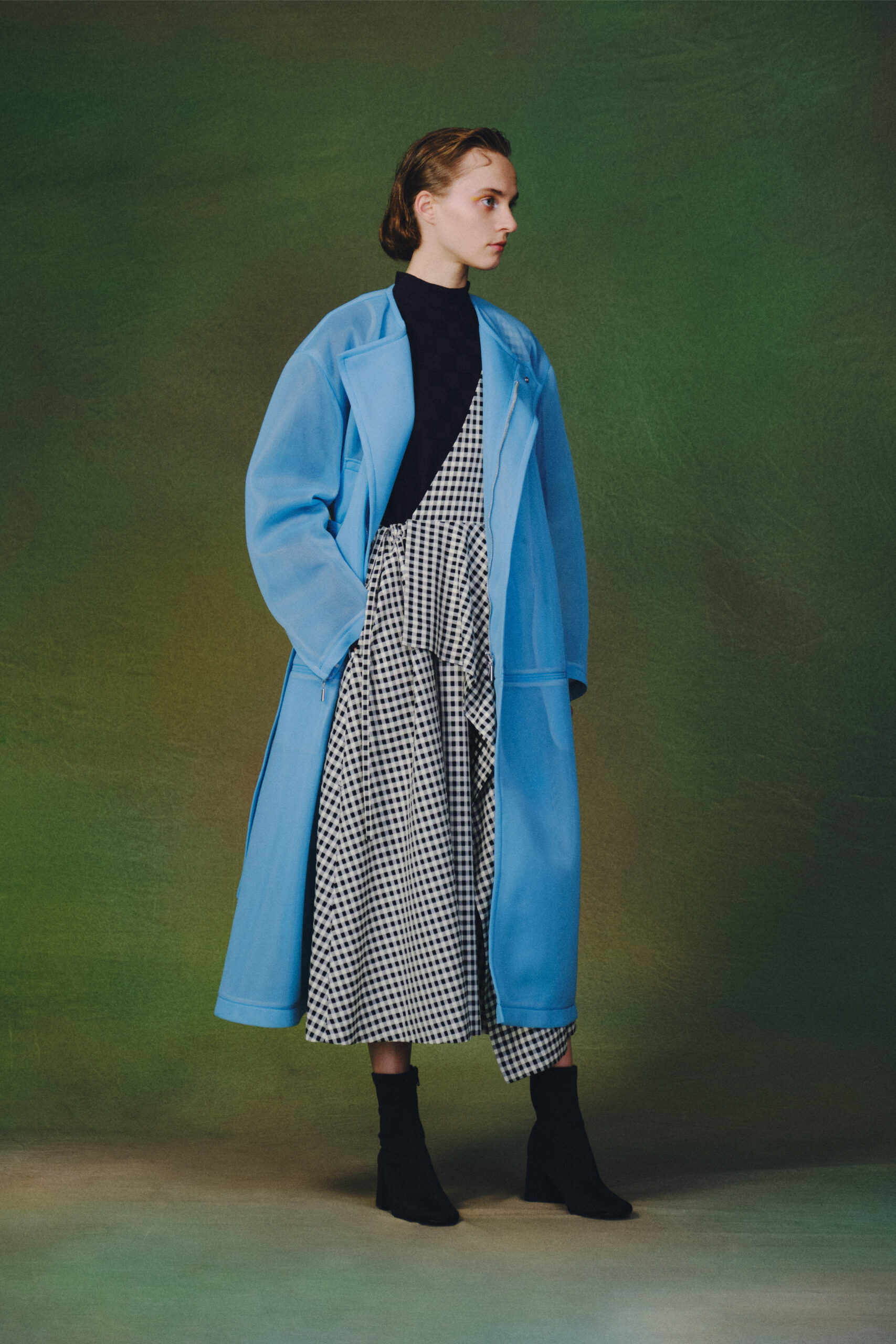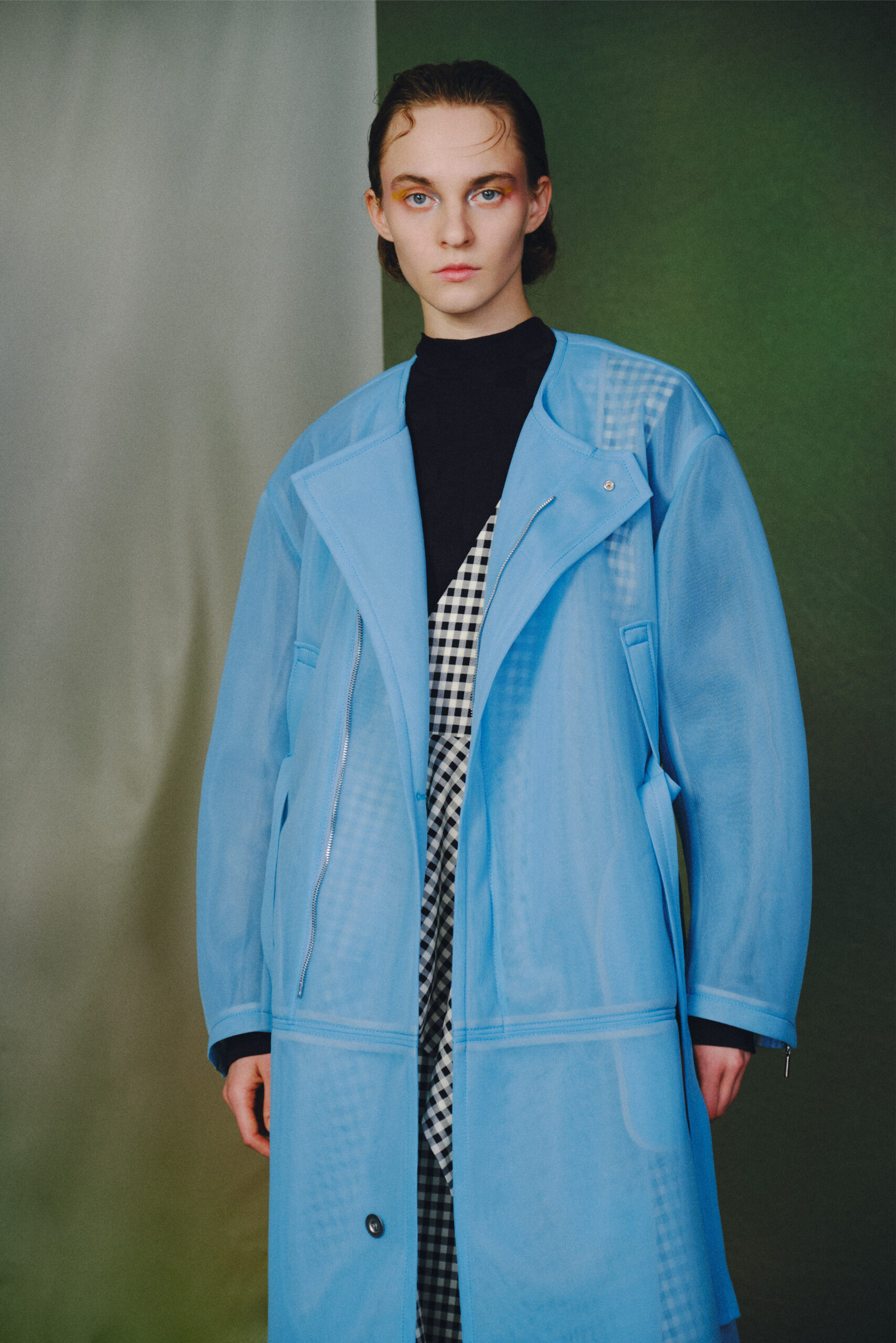 The transparent blue coat, inspired by frosted glass, creates a fresh look when layered with the gingham check inside. A nude beige top that looks like a shell is layered with pants for a unique and eye-catching finish. Micro cross-stitched floral embroidery and Double Russell material bring a rich variety to the collection.