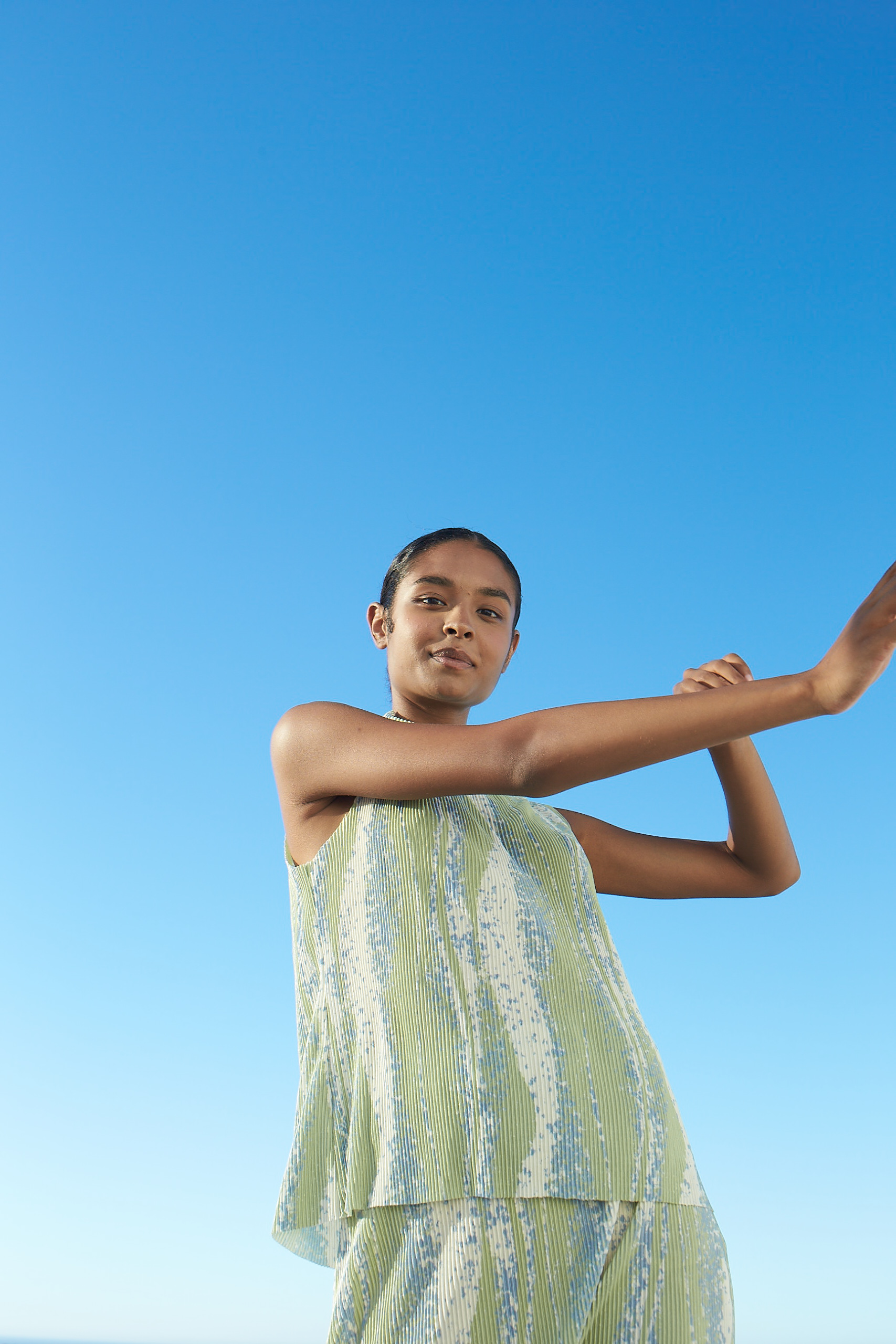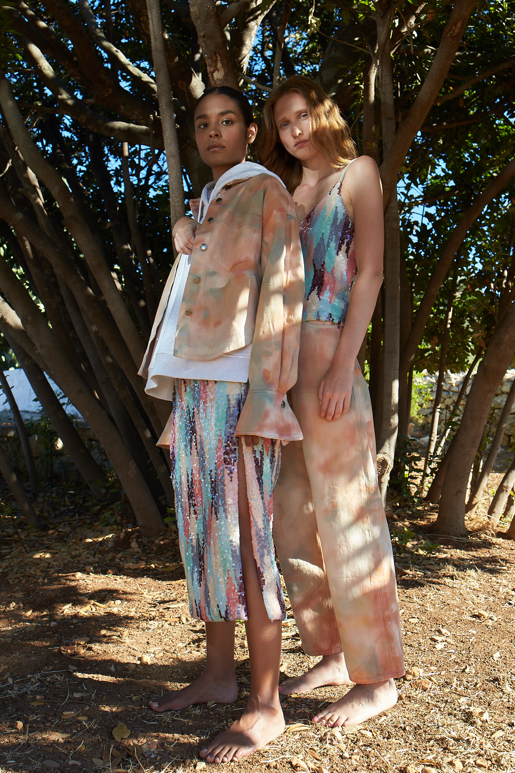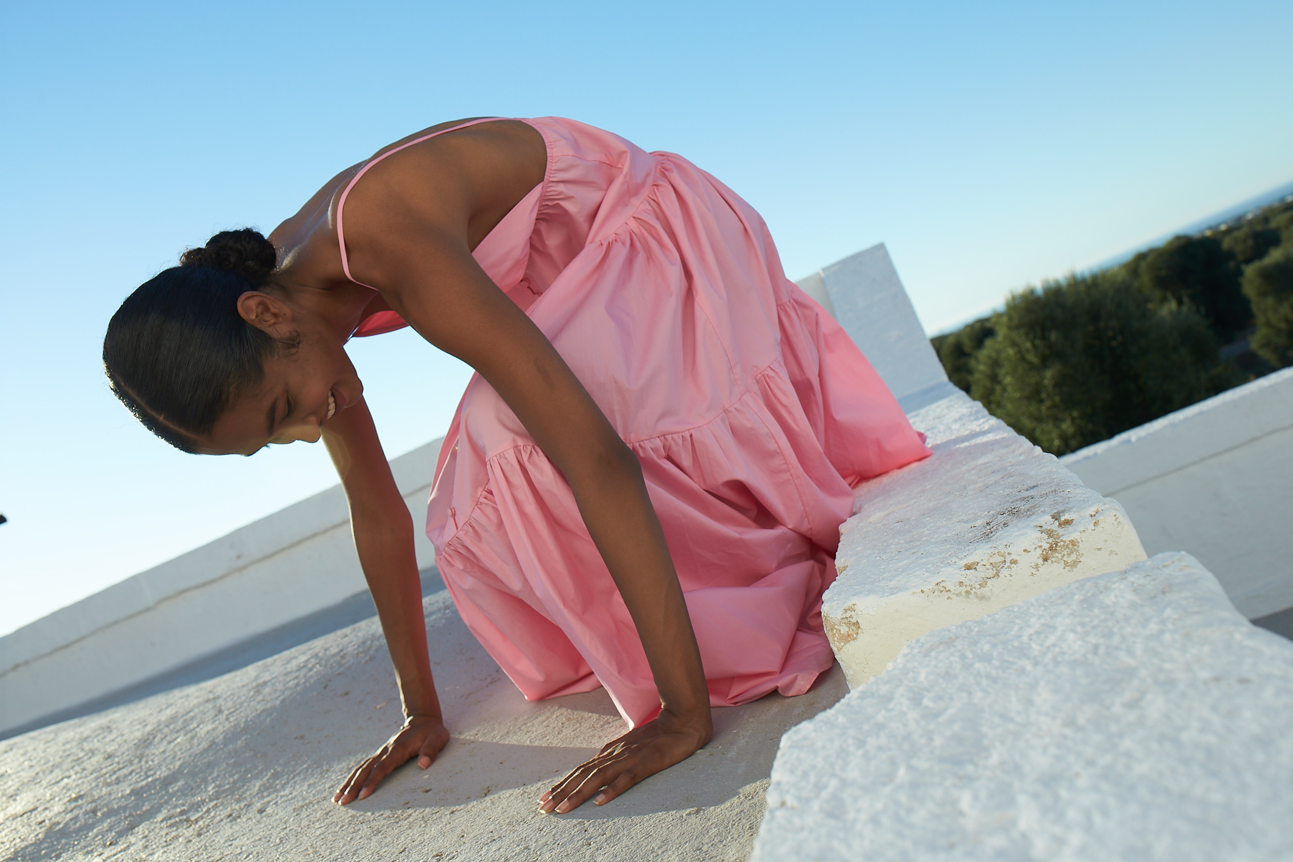 The fabrics find new identity and character with exclusive selections of chiffon, linen, damask, multicolor paillettes, sangallo lace and cupro. Soft and light textures are used to make « divine leaders » with volumes and cadences reminiscent of the movements of the underwater flora, enhancing the beauty and femininity of the woman.