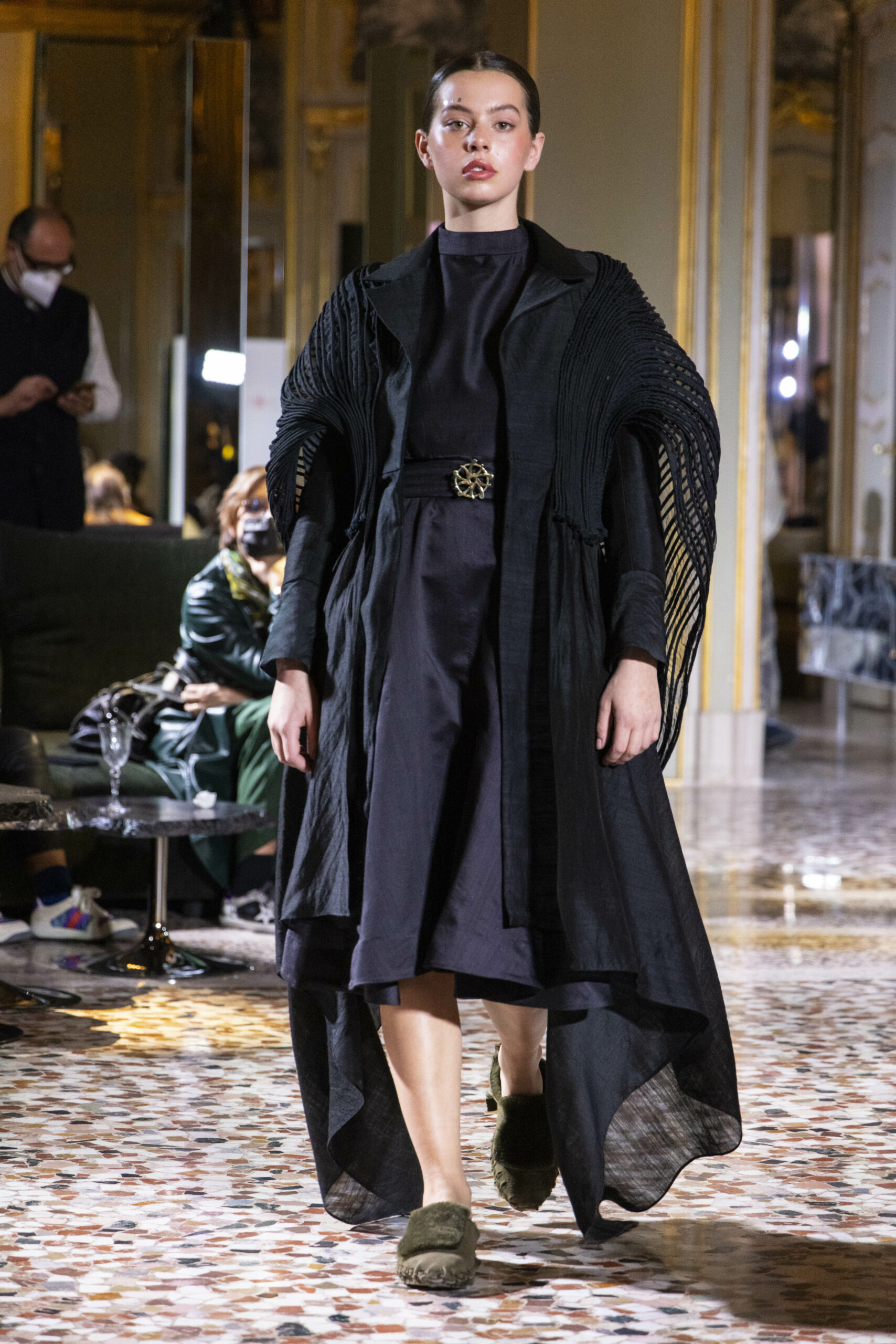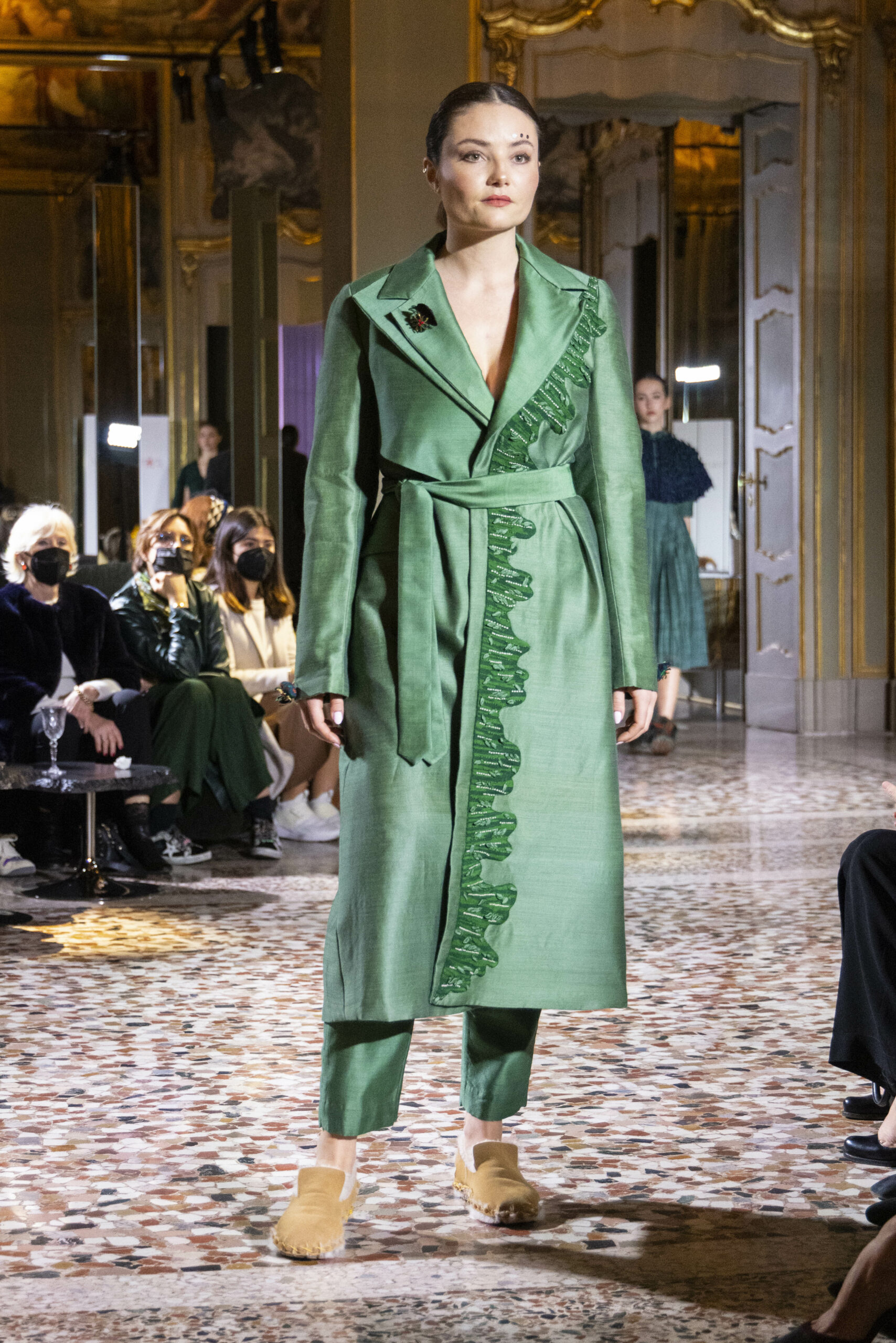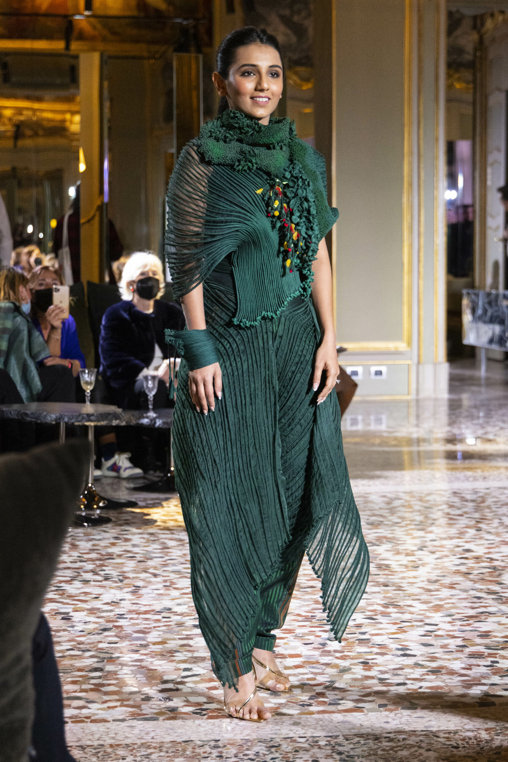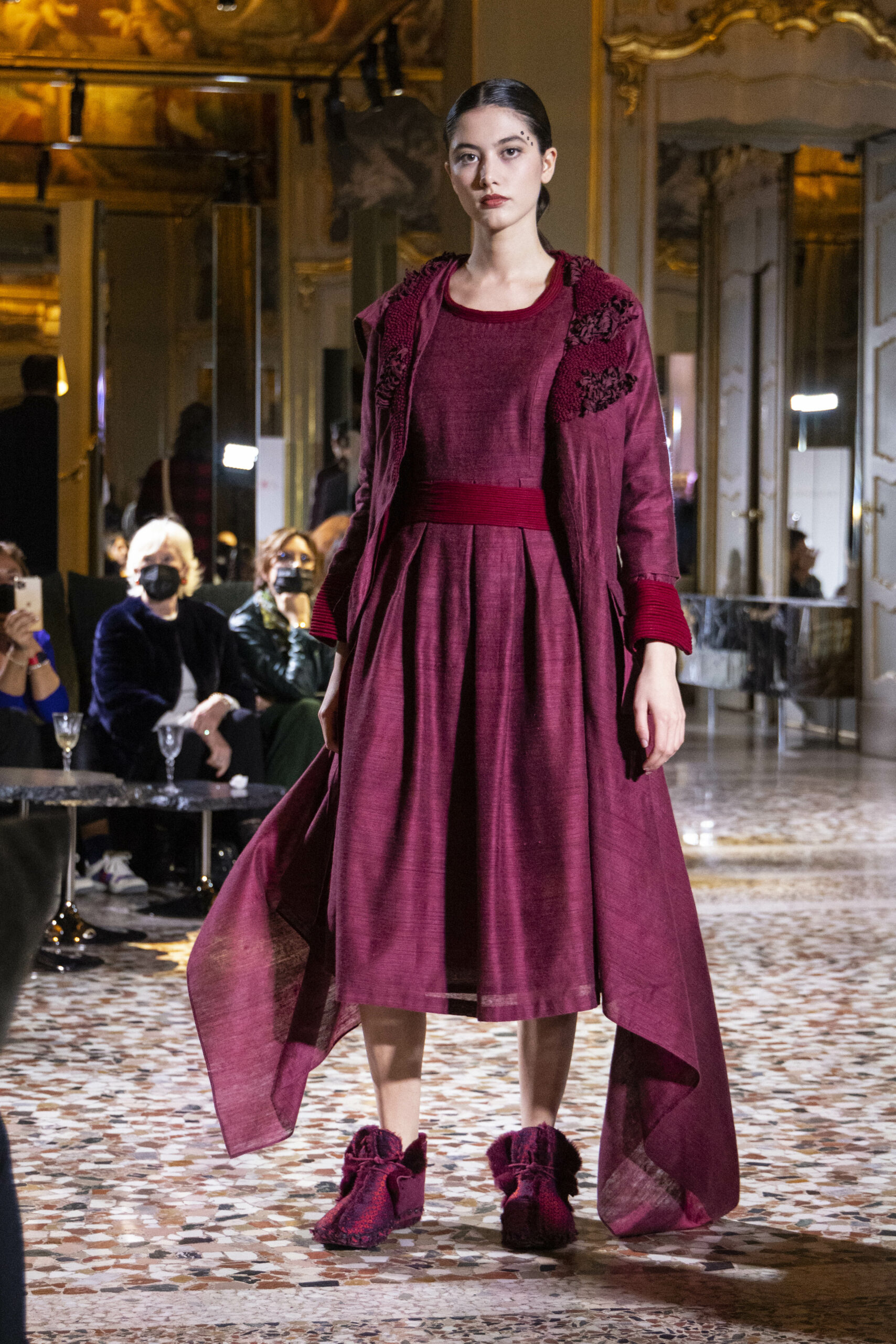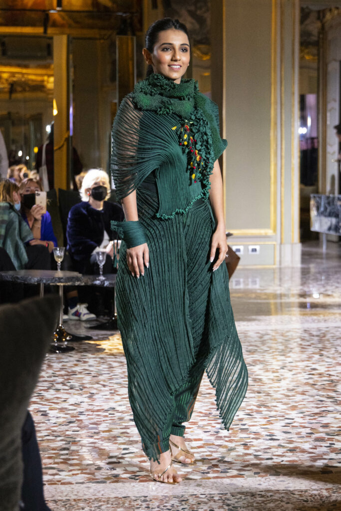 Vaishali Shadangule’s Autumn Winter 2022 collection is named Srauta, a word taken from ancient Vedic Sanskrit texts and meaning ‘sacrifice’ as an act by which we surrender something for the sake of the gods. It represents the flow of energy that connects everything in nature and how it sacrifices itself in one form to come to life into another form in a seamless flow that is the secret of life. A demonstration of this flow is the metamorphosis that a strand of hair or fur from an animal goes through in its journey, the hair becomes part of a thread, which gives life to a fabric, which is finally transformed apparel, to ultimately being a part of a garment in Vaishali’s Srauta collection. The designer has studied this flow of energy carefully to ensure that the flow is as seamless and sustainable as possible, ensuring the message of love is carried forward. This Milan Fashion Week also marks the global launch of Vaishali S’ prêt-à-porter line and with this launch, the designer continues to position Indian hand weaves at the top of international luxury, through unique global silhouettes. The collection features not only embroideries but full-fledged haute couture design and fabrics in a fresh prêt avatar, that shines the spotlight on hand-woven Indian textiles. As with all Vaishali’s collections, the Srauta collection too emphasises excellence in workmanship, with sustainability, zero waste and has circularity at its core. To ensure continued support and positive social impact on craft clusters, Vaishali has employed weaves used in the past in this collection as well. With the aim of pushing the boundaries of her commitment to sustainability, Vaishali has used blockchain technology for this collection, which will guarantee the technical traceability of garments’ history, thereby ensuring not only that sustainability is the focus throughout all processes, but also guaranteeing that clients can trace the journey of the hair fibres of the goat, in case of Pashmina, to the final garment, with a quick scan of a QR code. Employing her unique flair for effortlessly blending traditional weaves and techniques with dramatic silhouettes, Vaishali’s Srauta collection, amongst other fabrics, extensively explores the use of hand-woven Merino wool from Bengal, and Pashmina from Ladhak, both of which will keep the wearer warm in colder seasons and surprising cool in the warmer months. The palette is comprised of jewel tones such as deep aquamarines, ruby reds, shimmering amethysts, pearly whites, jade greens, and slate greys. The continued partnership with VIBRAM has also brought a winter collection of sustainable products. VIBRAM, the Italian world leader in soles manufacturing, has taken serious commitment to sustainability. By cooperating on their project “Component, the innovative sole system by VIBRAM”, the shoes for the collection have been developed with the leftover fabrics of the prêt-à-porter collection on a 96% recycled sole. Furthermore, the easiness of detaching the upper part of the shoe and creating your own new one with old clothes really takes circularity to a deeper level. The inception of the partnership was during the Paris Haute Couture Week and has been continuing to flourish.