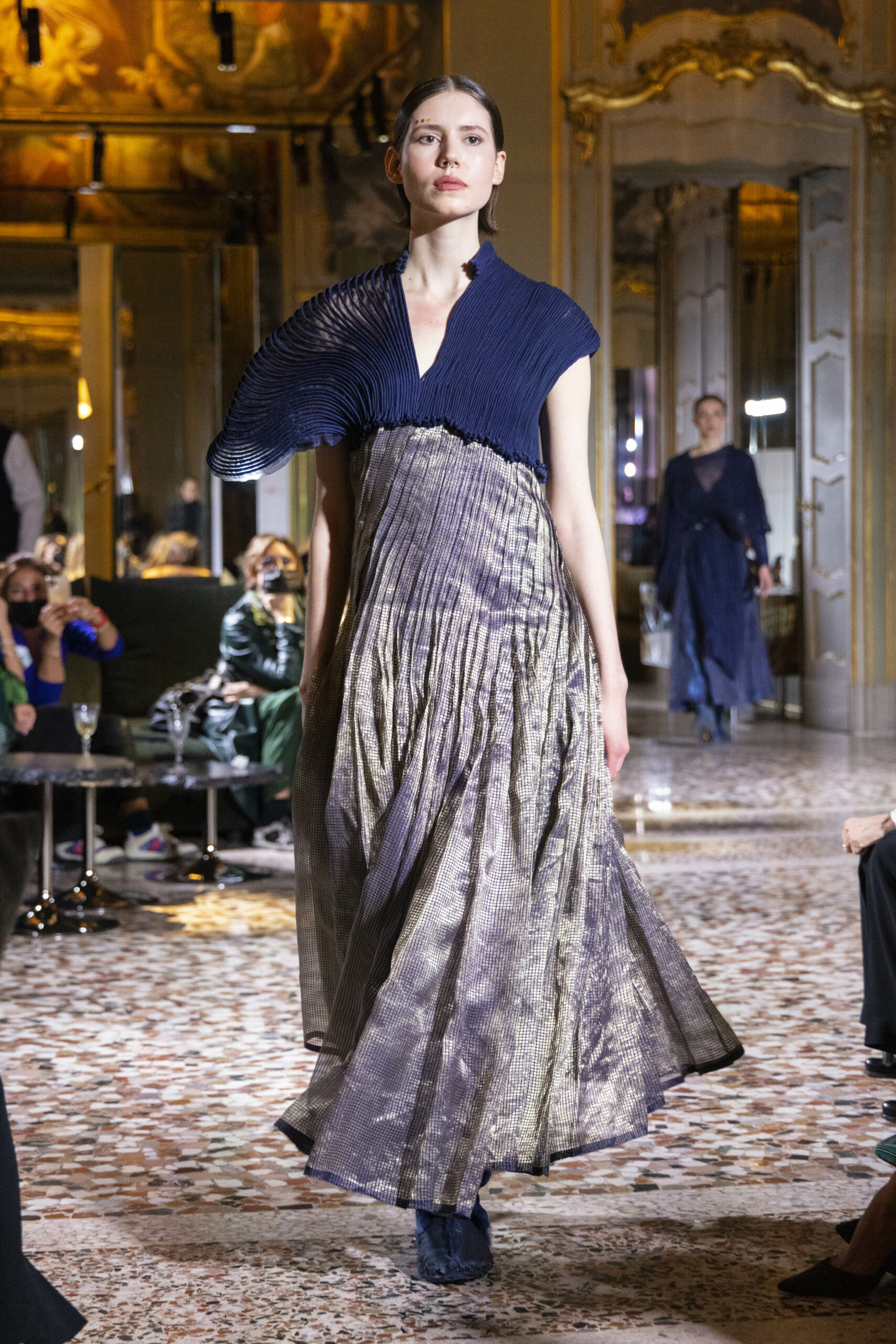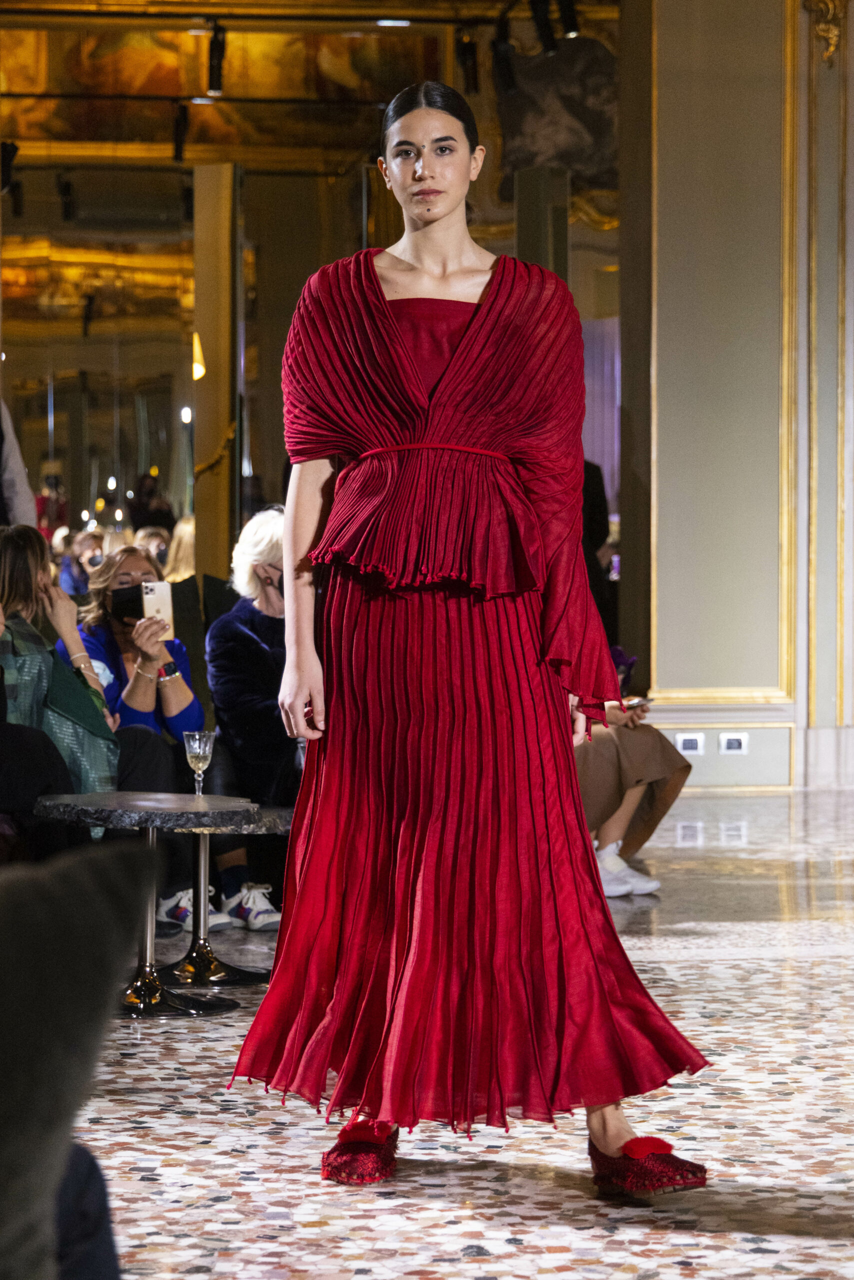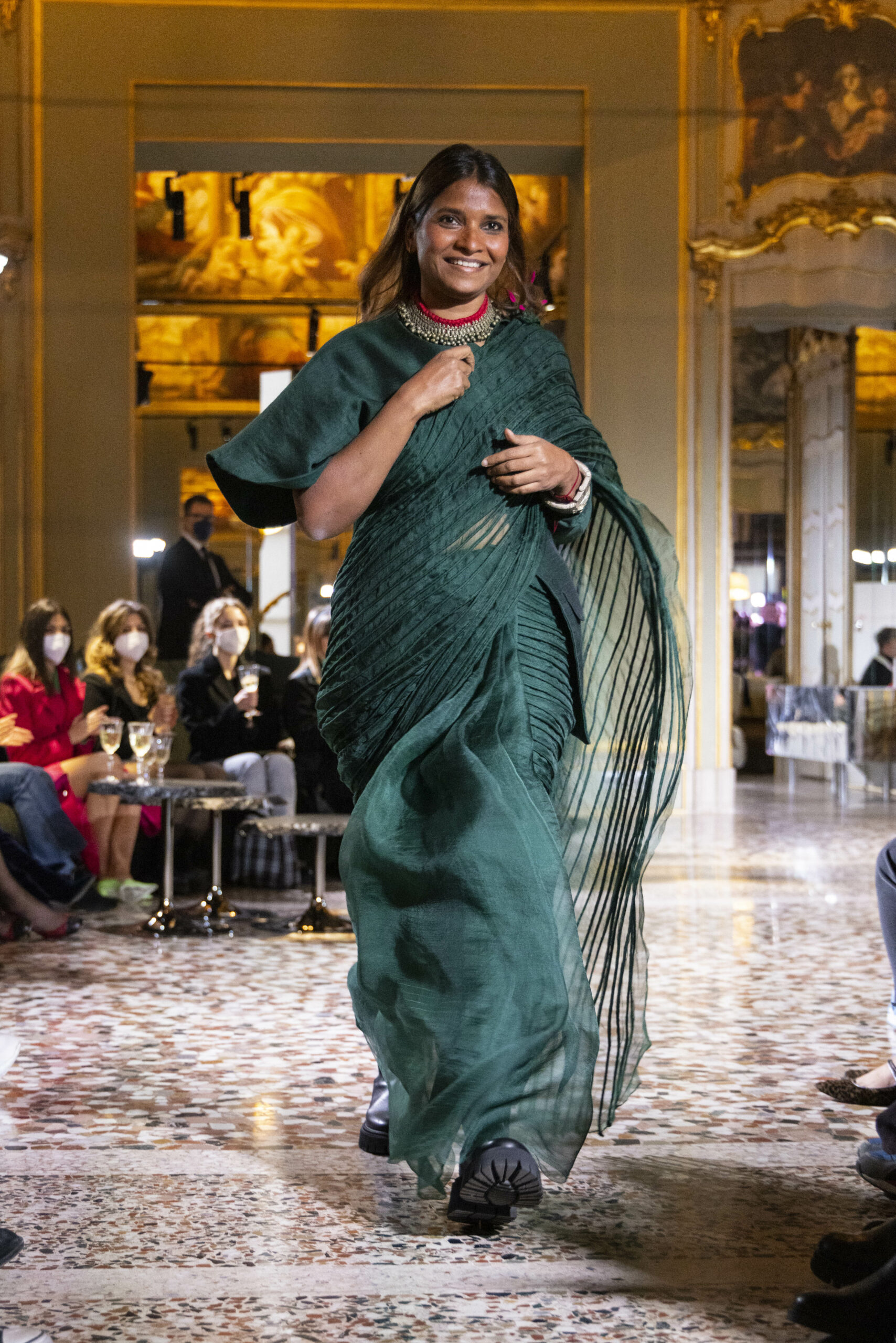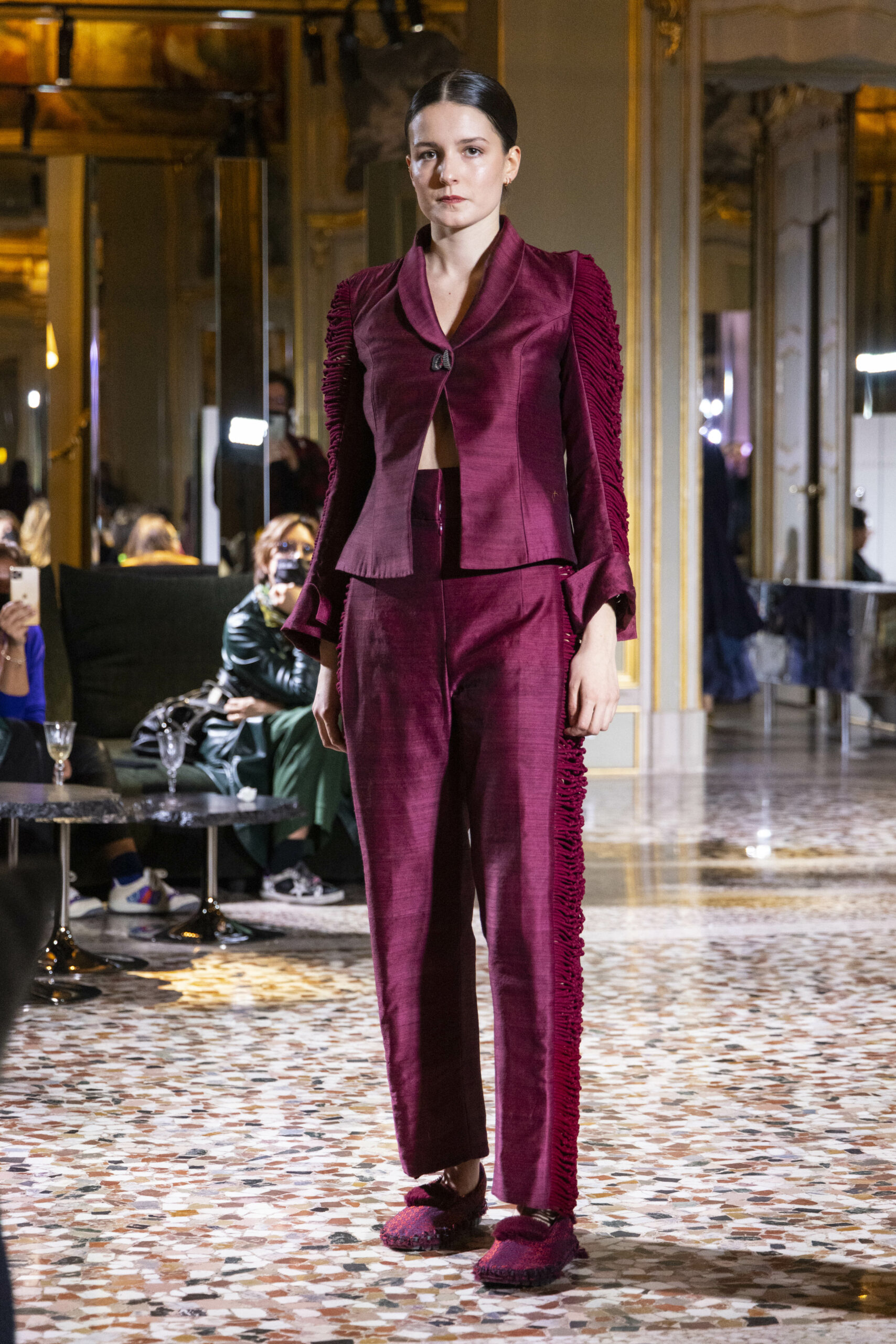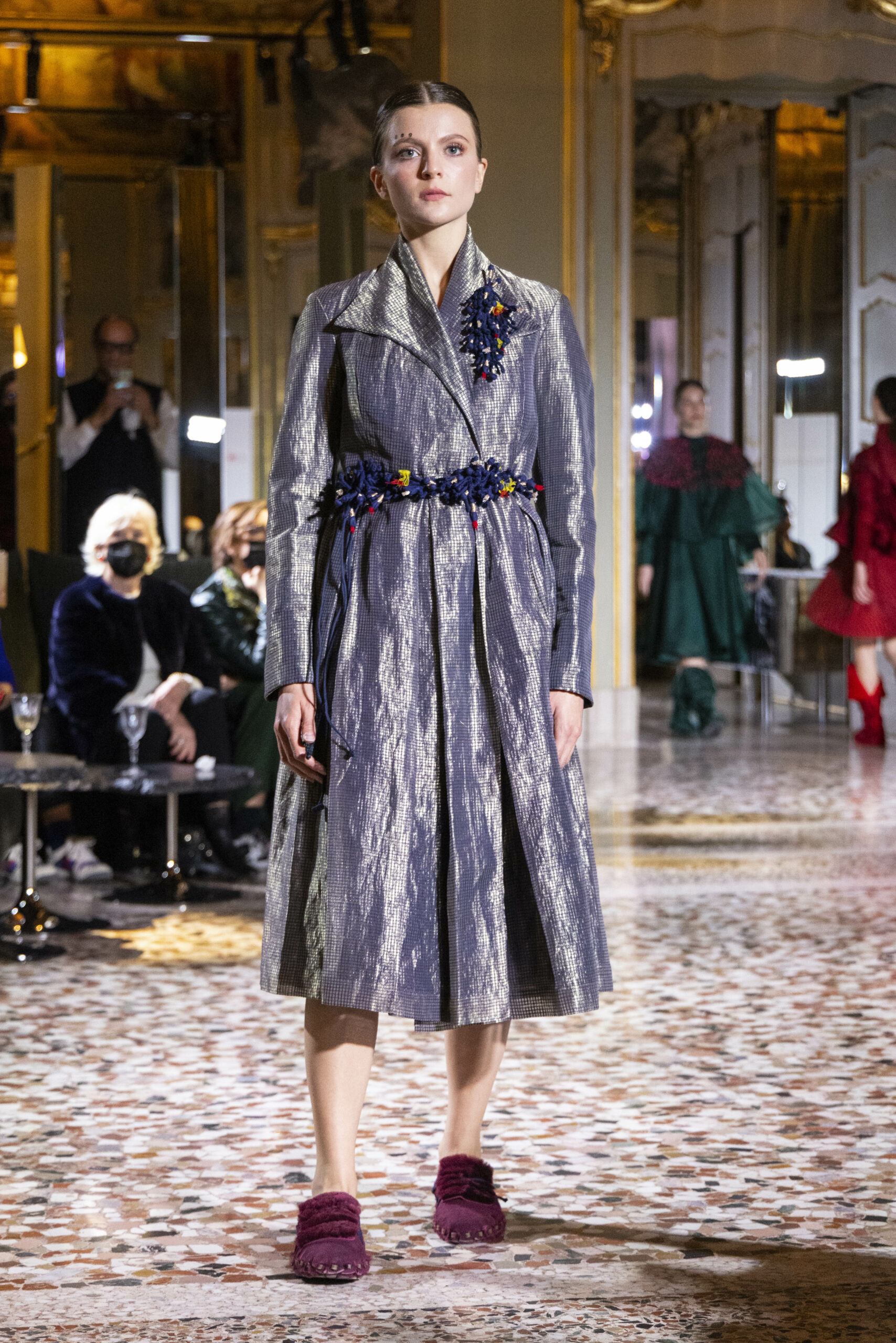 Vaishali Shadangule’s Autumn Winter 2022 collection is named Srauta, a word taken from ancient Vedic Sanskrit texts and meaning ‘sacrifice’ as an act by which we surrender something for the sake of the gods. It represents the flow of energy that connects everything in nature and how it sacrifices itself in one form to come to life into another form in a seamless flow that is the secret of life. A demonstration of this flow is the metamorphosis that a strand of hair or fur from an animal goes through in its journey, the hair becomes part of a thread, which gives life to a fabric, which is finally transformed apparel, to ultimately being a part of a garment in Vaishali’s Srauta collection. The designer has studied this flow of energy carefully to ensure that the flow is as seamless and sustainable as possible, ensuring the message of love is carried forward. This Milan Fashion Week also marks the global launch of Vaishali S’ prêt-à-porter line and with this launch, the designer continues to position Indian hand weaves at the top of international luxury, through unique global silhouettes. The collection features not only embroideries but full-fledged haute couture design and fabrics in a fresh prêt avatar, that shines the spotlight on hand-woven Indian textiles. As with all Vaishali’s collections, the Srauta collection too emphasises excellence in workmanship, with sustainability, zero waste and has circularity at its core. To ensure continued support and positive social impact on craft clusters, Vaishali has employed weaves used in the past in this collection as well. With the aim of pushing the boundaries of her commitment to sustainability, Vaishali has used blockchain technology for this collection, which will guarantee the technical traceability of garments’ history, thereby ensuring not only that sustainability is the focus throughout all processes, but also guaranteeing that clients can trace the journey of the hair fibres of the goat, in case of Pashmina, to the final garment, with a quick scan of a QR code. Employing her unique flair for effortlessly blending traditional weaves and techniques with dramatic silhouettes, Vaishali’s Srauta collection, amongst other fabrics, extensively explores the use of hand-woven Merino wool from Bengal, and Pashmina from Ladhak, both of which will keep the wearer warm in colder seasons and surprising cool in the warmer months. The palette is comprised of jewel tones such as deep aquamarines, ruby reds, shimmering amethysts, pearly whites, jade greens, and slate greys. The continued partnership with VIBRAM has also brought a winter collection of sustainable products. VIBRAM, the Italian world leader in soles manufacturing, has taken serious commitment to sustainability. By cooperating on their project “Component, the innovative sole system by VIBRAM”, the shoes for the collection have been developed with the leftover fabrics of the prêt-à-porter collection on a 96% recycled sole. Furthermore, the easiness of detaching the upper part of the shoe and creating your own new one with old clothes really takes circularity to a deeper level. The inception of the partnership was during the Paris Haute Couture Week and has been continuing to flourish.