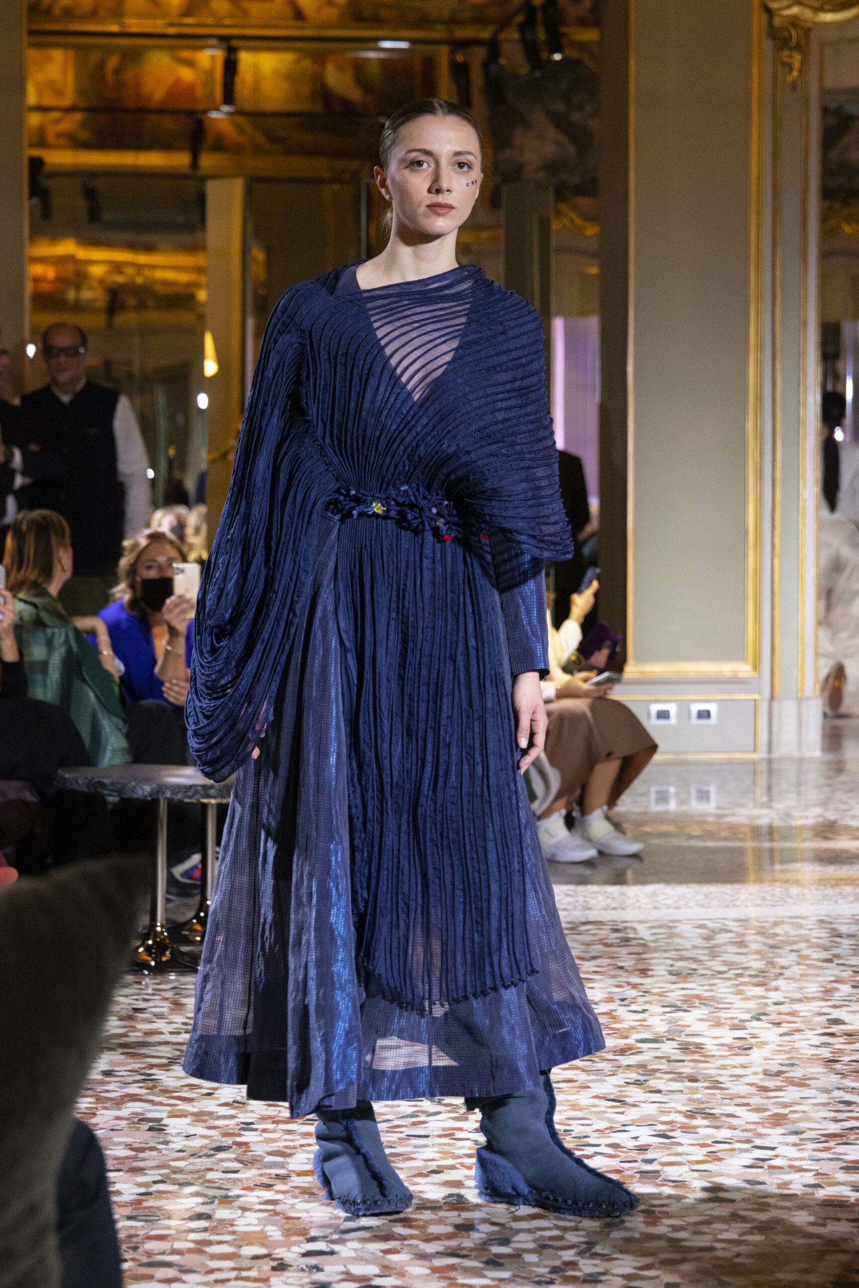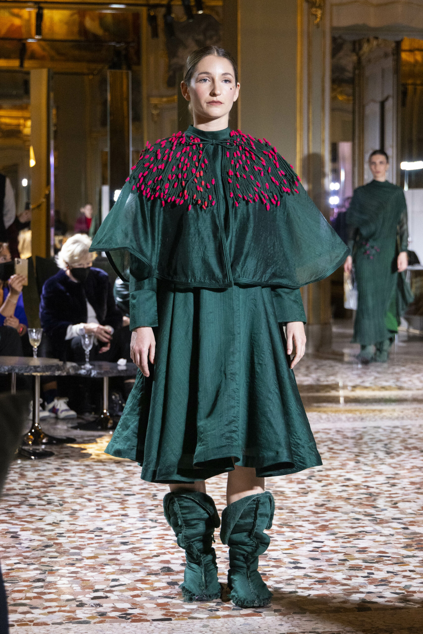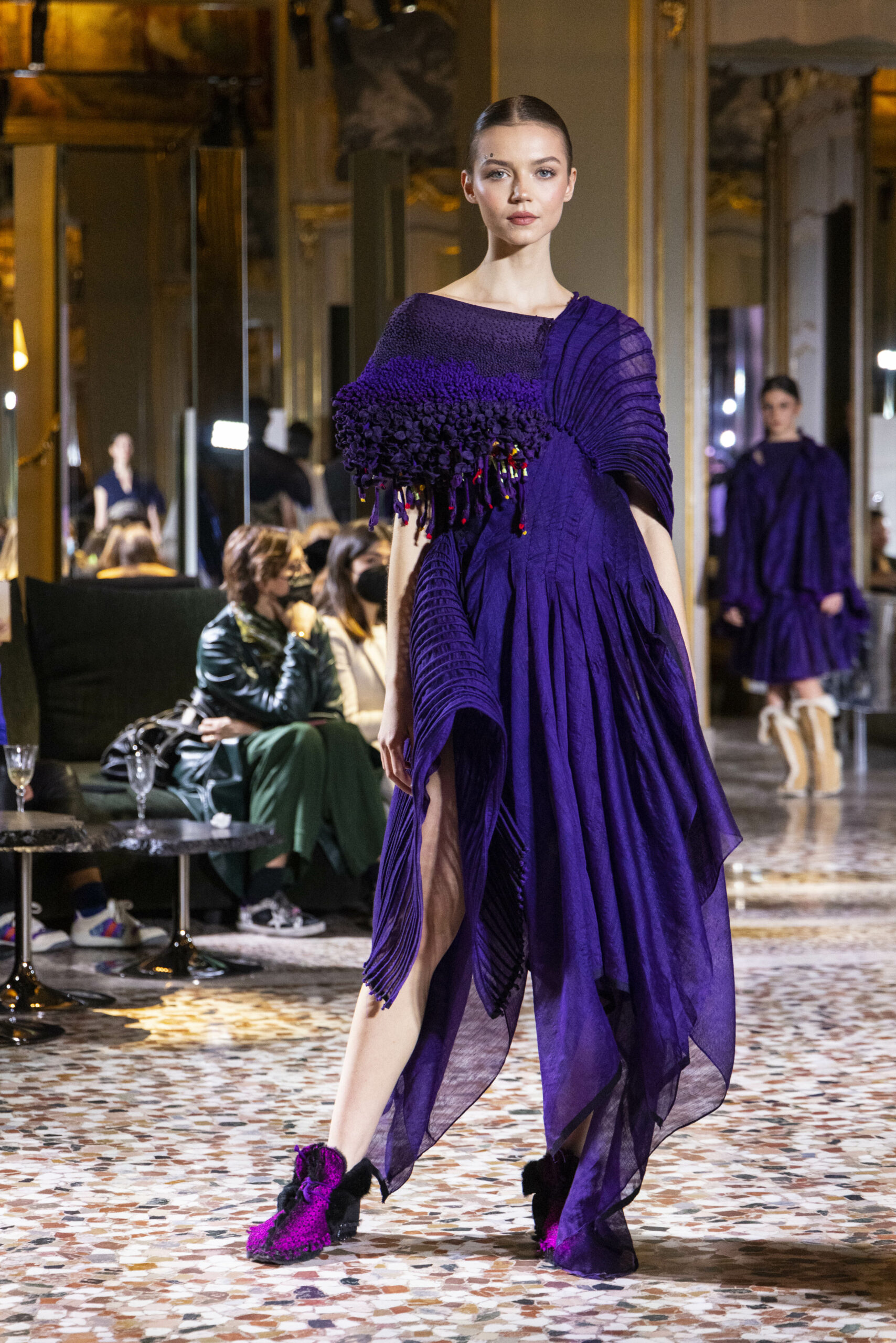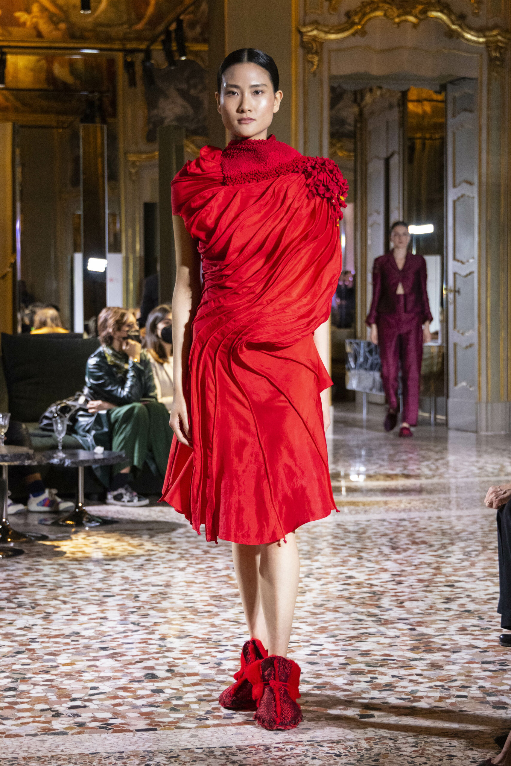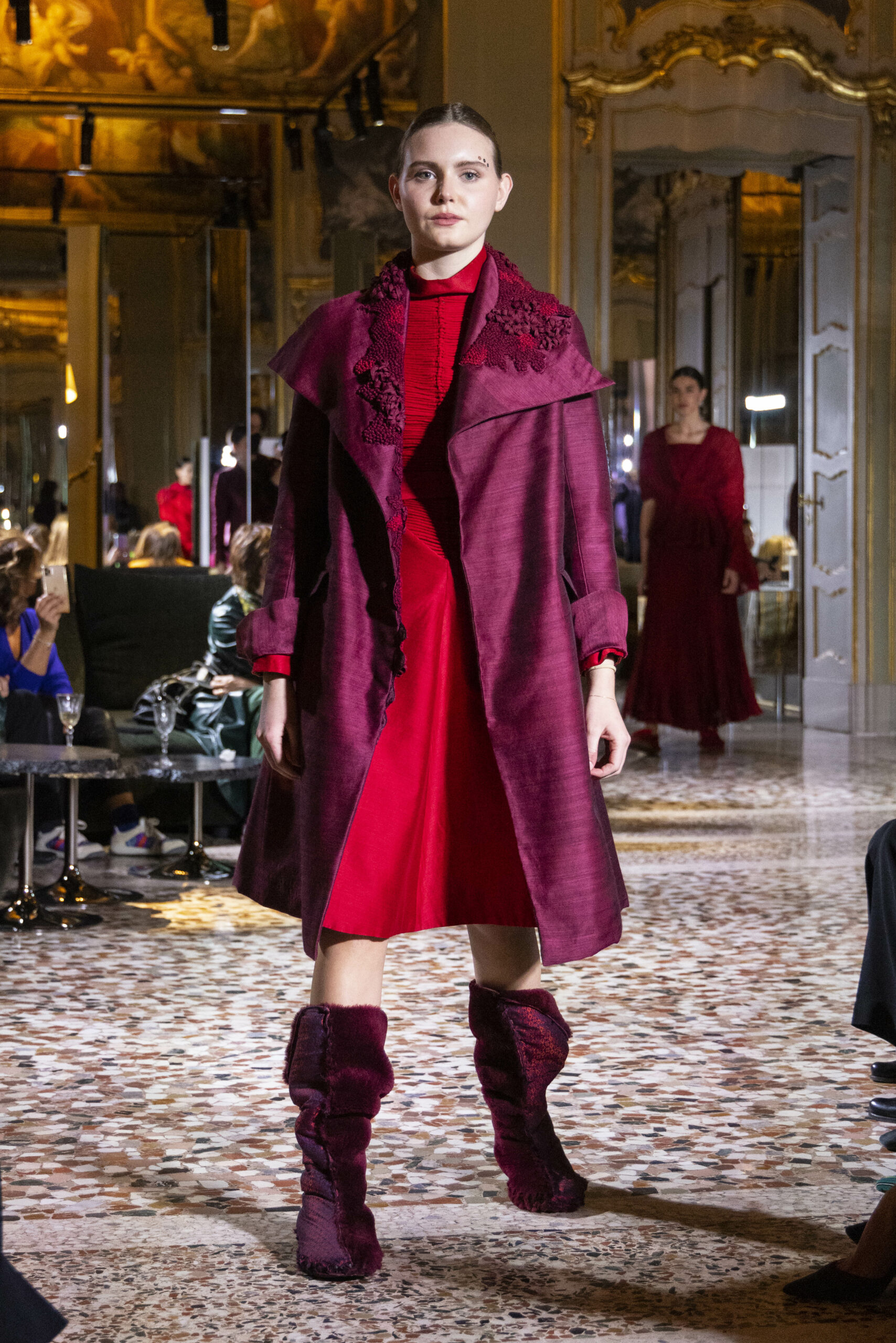 Vaishali Shadangule’s Autumn Winter 2022 collection is named Srauta, a word taken from ancient Vedic Sanskrit texts and meaning ‘sacrifice’ as an act by which we surrender something for the sake of the gods. It represents the flow of energy that connects everything in nature and how it sacrifices itself in one form to come to life into another form in a seamless flow that is the secret of life. A demonstration of this flow is the metamorphosis that a strand of hair or fur from an animal goes through in its journey, the hair becomes part of a thread, which gives life to a fabric, which is finally transformed apparel, to ultimately being a part of a garment in Vaishali’s Srauta collection. The designer has studied this flow of energy carefully to ensure that the flow is as seamless and sustainable as possible, ensuring the message of love is carried forward. This Milan Fashion Week also marks the global launch of Vaishali S’ prêt-à-porter line and with this launch, the designer continues to position Indian hand weaves at the top of international luxury, through unique global silhouettes. The collection features not only embroideries but full-fledged haute couture design and fabrics in a fresh prêt avatar, that shines the spotlight on hand-woven Indian textiles. As with all Vaishali’s collections, the Srauta collection too emphasises excellence in workmanship, with sustainability, zero waste and has circularity at its core. To ensure continued support and positive social impact on craft clusters, Vaishali has employed weaves used in the past in this collection as well. With the aim of pushing the boundaries of her commitment to sustainability, Vaishali has used blockchain technology for this collection, which will guarantee the technical traceability of garments’ history, thereby ensuring not only that sustainability is the focus throughout all processes, but also guaranteeing that clients can trace the journey of the hair fibres of the goat, in case of Pashmina, to the final garment, with a quick scan of a QR code. Employing her unique flair for effortlessly blending traditional weaves and techniques with dramatic silhouettes, Vaishali’s Srauta collection, amongst other fabrics, extensively explores the use of hand-woven Merino wool from Bengal, and Pashmina from Ladhak, both of which will keep the wearer warm in colder seasons and surprising cool in the warmer months. The palette is comprised of jewel tones such as deep aquamarines, ruby reds, shimmering amethysts, pearly whites, jade greens, and slate greys. The continued partnership with VIBRAM has also brought a winter collection of sustainable products. VIBRAM, the Italian world leader in soles manufacturing, has taken serious commitment to sustainability. By cooperating on their project “Component, the innovative sole system by VIBRAM”, the shoes for the collection have been developed with the leftover fabrics of the prêt-à-porter collection on a 96% recycled sole. Furthermore, the easiness of detaching the upper part of the shoe and creating your own new one with old clothes really takes circularity to a deeper level. The inception of the partnership was during the Paris Haute Couture Week and has been continuing to flourish.