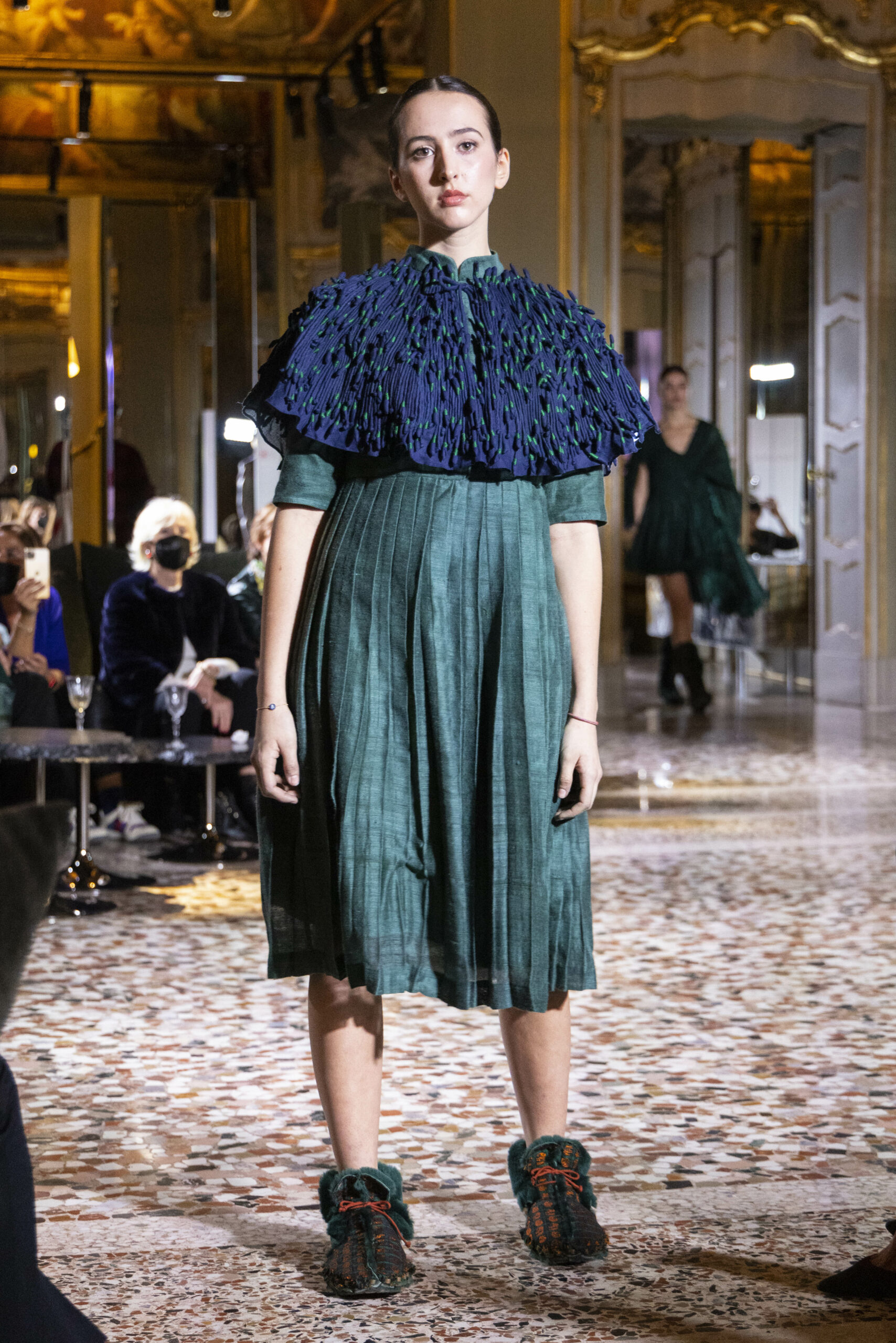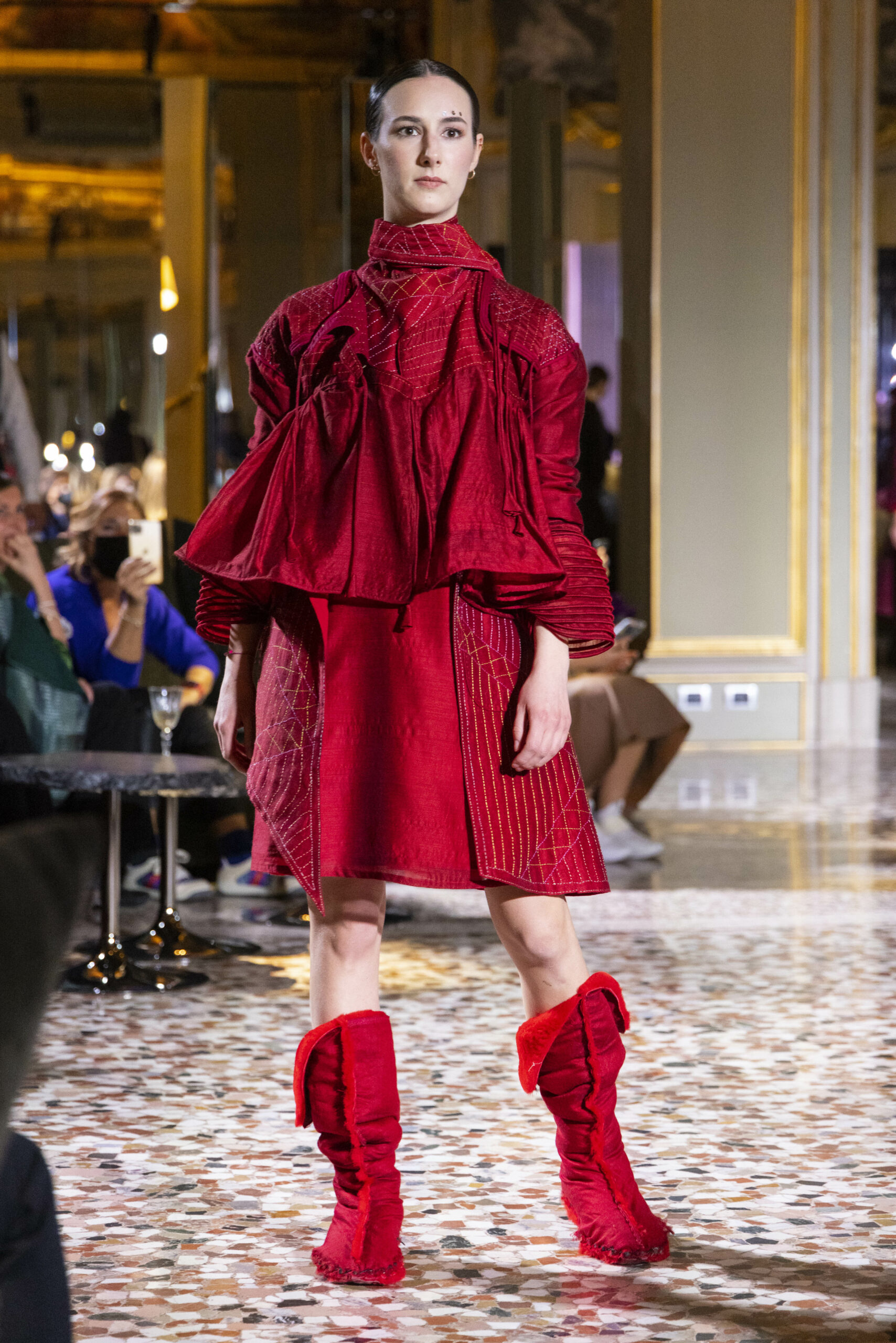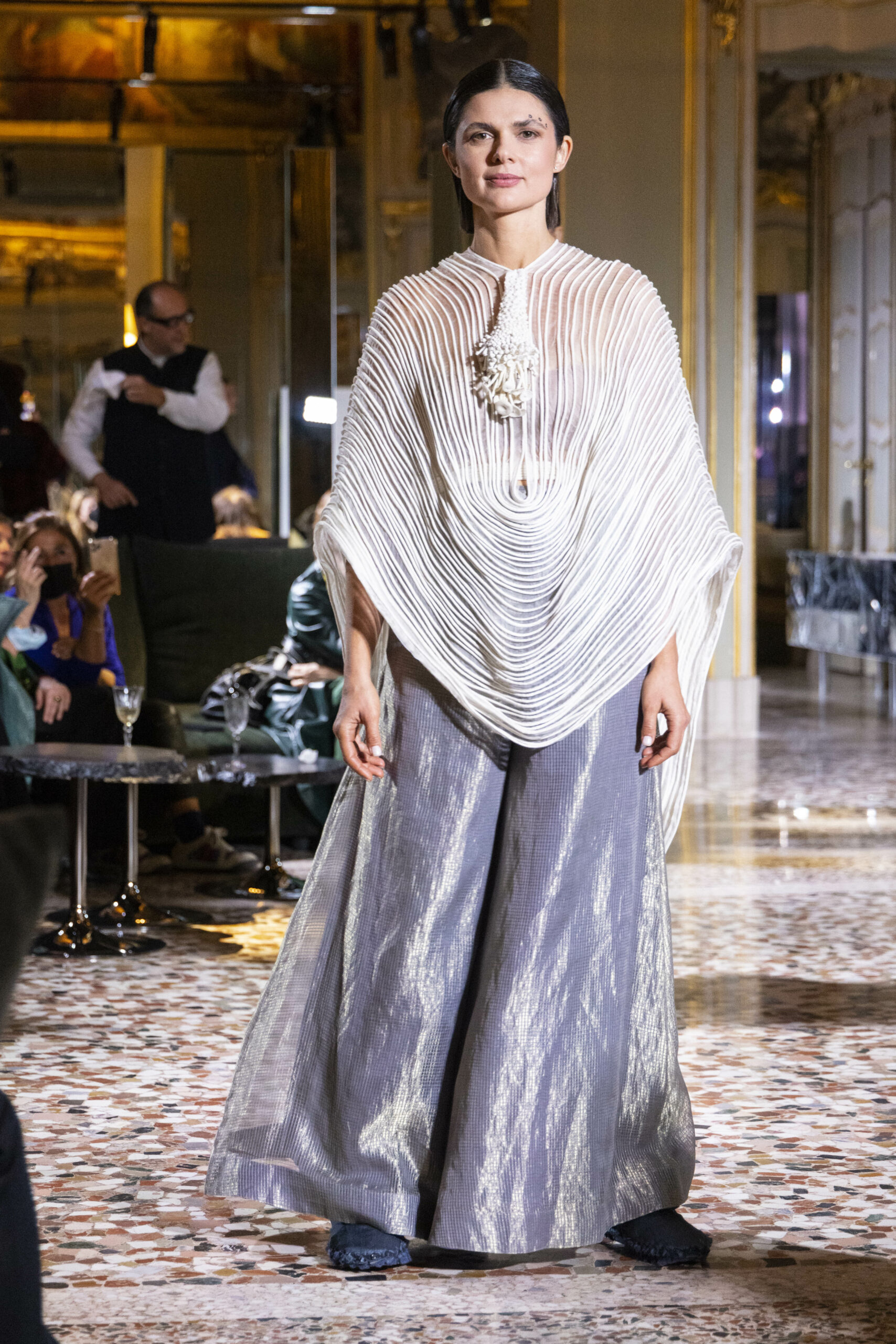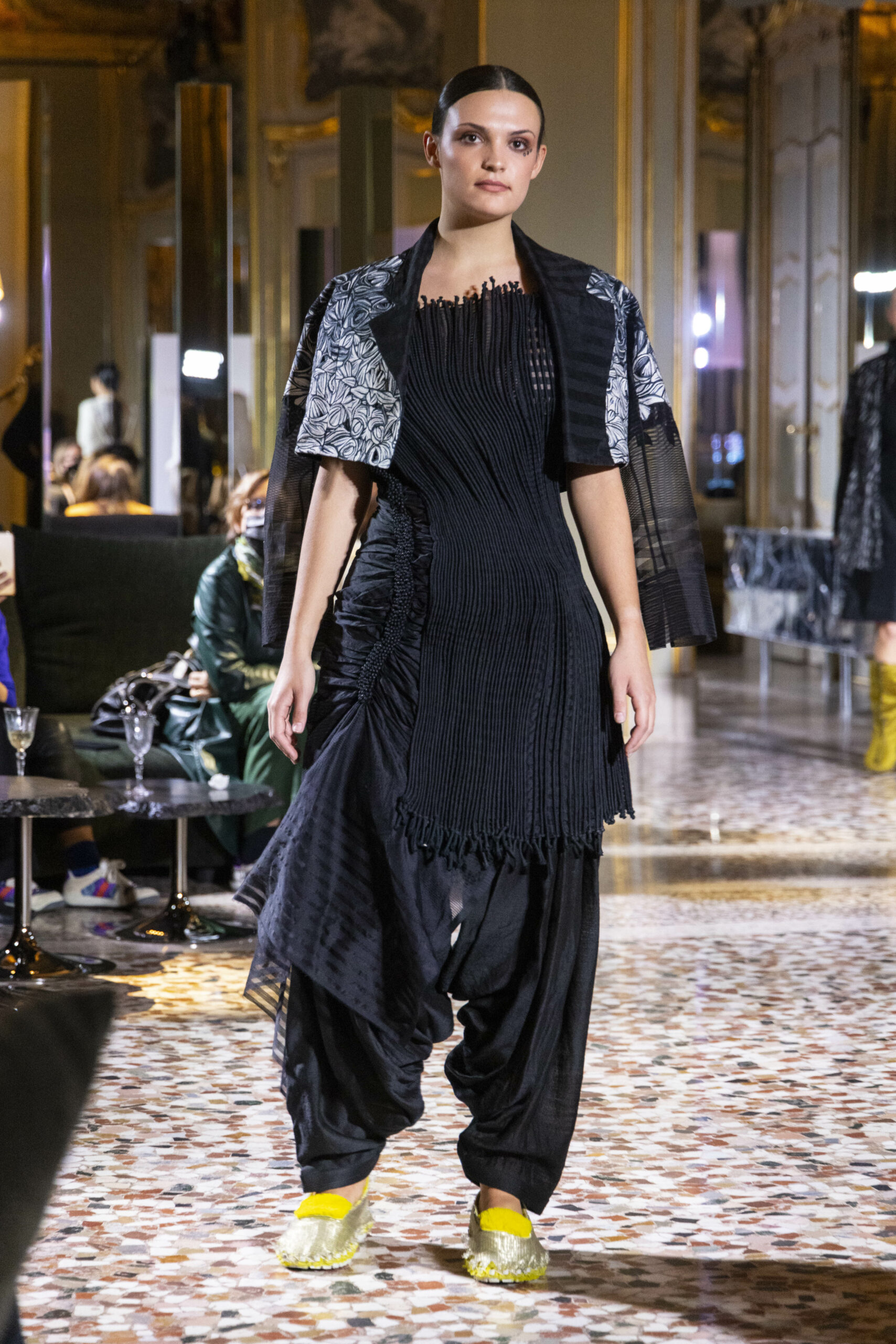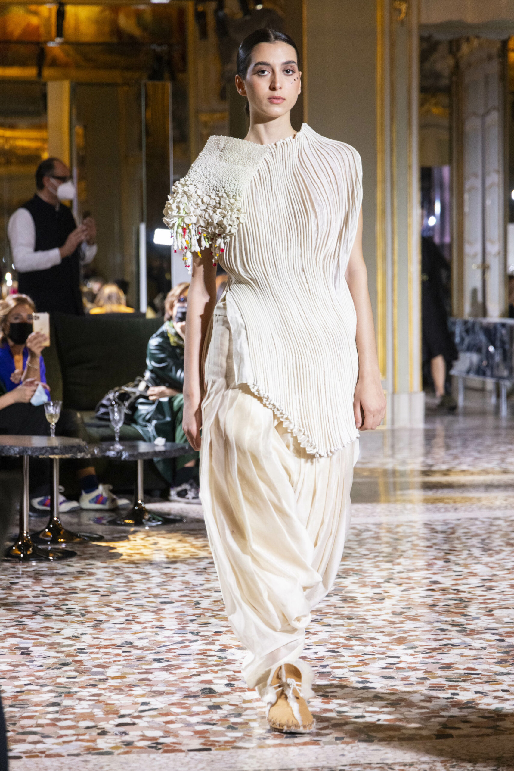 Vaishali Shadangule’s Autumn Winter 2022 collection is named Srauta, a word taken from ancient Vedic Sanskrit texts and meaning ‘sacrifice’ as an act by which we surrender something for the sake of the gods. It represents the flow of energy that connects everything in nature and how it sacrifices itself in one form to come to life into another form in a seamless flow that is the secret of life. A demonstration of this flow is the metamorphosis that a strand of hair or fur from an animal goes through in its journey, the hair becomes part of a thread, which gives life to a fabric, which is finally transformed apparel, to ultimately being a part of a garment in Vaishali’s Srauta collection. The designer has studied this flow of energy carefully to ensure that the flow is as seamless and sustainable as possible, ensuring the message of love is carried forward. This Milan Fashion Week also marks the global launch of Vaishali S’ prêt-à-porter line and with this launch, the designer continues to position Indian hand weaves at the top of international luxury, through unique global silhouettes. The collection features not only embroideries but full-fledged haute couture design and fabrics in a fresh prêt avatar, that shines the spotlight on hand-woven Indian textiles. As with all Vaishali’s collections, the Srauta collection too emphasises excellence in workmanship, with sustainability, zero waste and has circularity at its core. To ensure continued support and positive social impact on craft clusters, Vaishali has employed weaves used in the past in this collection as well. With the aim of pushing the boundaries of her commitment to sustainability, Vaishali has used blockchain technology for this collection, which will guarantee the technical traceability of garments’ history, thereby ensuring not only that sustainability is the focus throughout all processes, but also guaranteeing that clients can trace the journey of the hair fibres of the goat, in case of Pashmina, to the final garment, with a quick scan of a QR code. Employing her unique flair for effortlessly blending traditional weaves and techniques with dramatic silhouettes, Vaishali’s Srauta collection, amongst other fabrics, extensively explores the use of hand-woven Merino wool from Bengal, and Pashmina from Ladhak, both of which will keep the wearer warm in colder seasons and surprising cool in the warmer months. The palette is comprised of jewel tones such as deep aquamarines, ruby reds, shimmering amethysts, pearly whites, jade greens, and slate greys. The continued partnership with VIBRAM has also brought a winter collection of sustainable products. VIBRAM, the Italian world leader in soles manufacturing, has taken serious commitment to sustainability. By cooperating on their project “Component, the innovative sole system by VIBRAM”, the shoes for the collection have been developed with the leftover fabrics of the prêt-à-porter collection on a 96% recycled sole. Furthermore, the easiness of detaching the upper part of the shoe and creating your own new one with old clothes really takes circularity to a deeper level. The inception of the partnership was during the Paris Haute Couture Week and has been continuing to flourish.