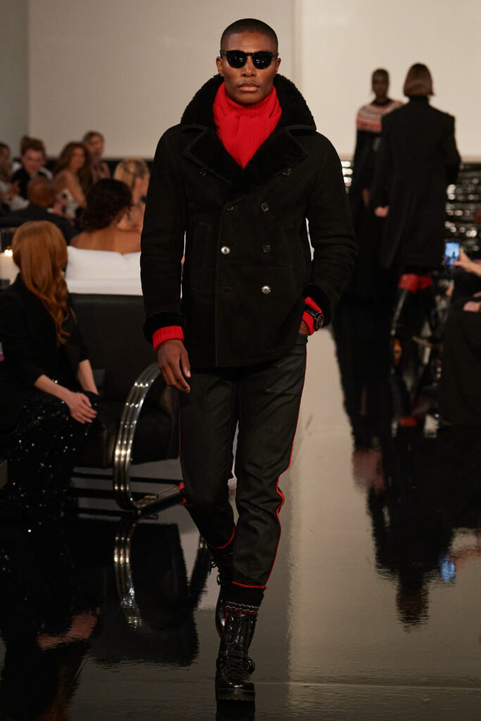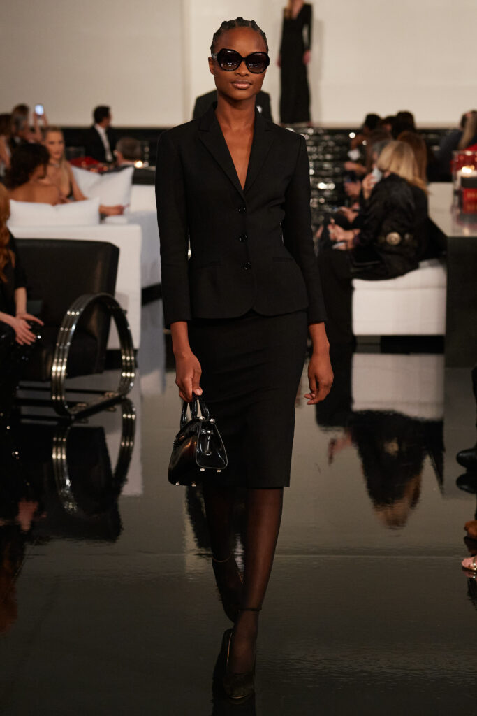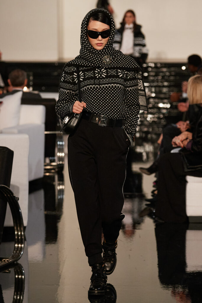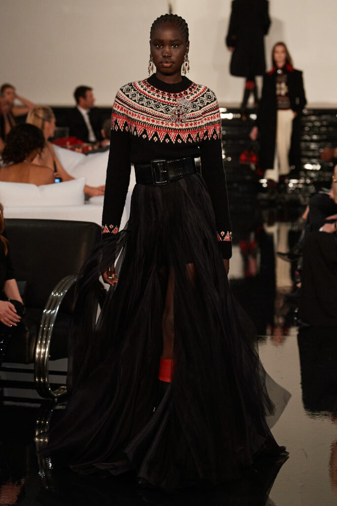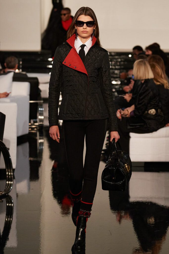 Des accessoires incarnant l’essence même de la saison viennent compléter la collection. Les sacs « Welington » font leur apparition sur le podium dans de nouvelles versions saisonnières, notamment un « Doctor bag », dernière édition de la collection, disponible en alligator. Pour le soir, Ralph Lauren propose le sac « Deco Frame », un tout nouveau style disponible en velours ou en cuir avec des finitions brodées. Les sacs « RL50 » sont également présents, tout comme l’emblématique « Ricky », réinventé sous la forme d’une pochette en velours avec des finitions en cuir et un monogramme brodé couleur or. Les souliers bicolores ont été pensés dans la continuité parfaite de la gamme de prêt-à-porter, où le noir contraste avec le blanc, mais aussi des escarpins et des sandales à rayures et en velours, ainsi que la botte d’équitation à talon et la bottine Chelsea avec sa touche de rouge. Les bijoux Art déco sont quant à eux inspirés des motifs des pulls nordiques, recréés à l’aide de cristaux pour une touche supplémentaire d’opulence.