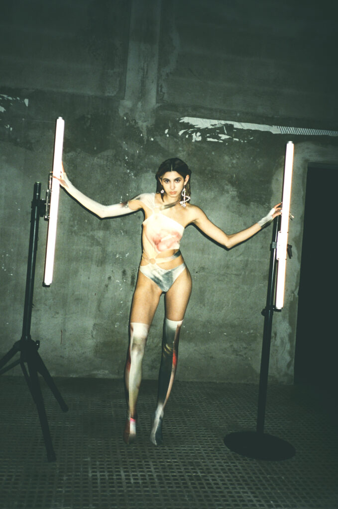The collection is made of seven looks: bodysuits, jumpsuits and dresses made out of stretched fabrics that enhance silhouettes and wrap the body and draw a second skin, creating an interplay between sensuality and femininity. It is proposed in total black, to underline the sexy approach to nightlife, or proposed with all-over photographic print, signed by Carolina herself.