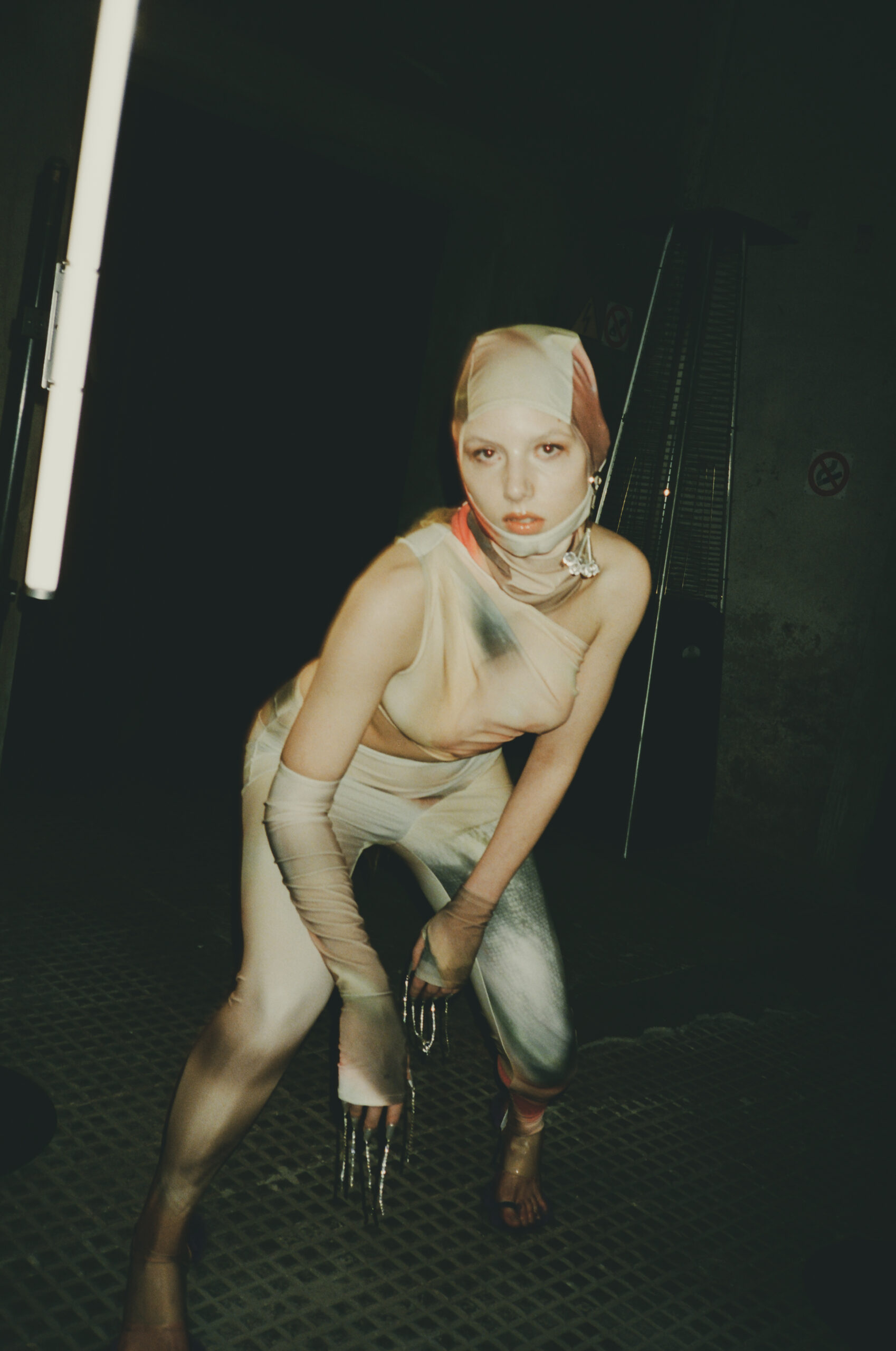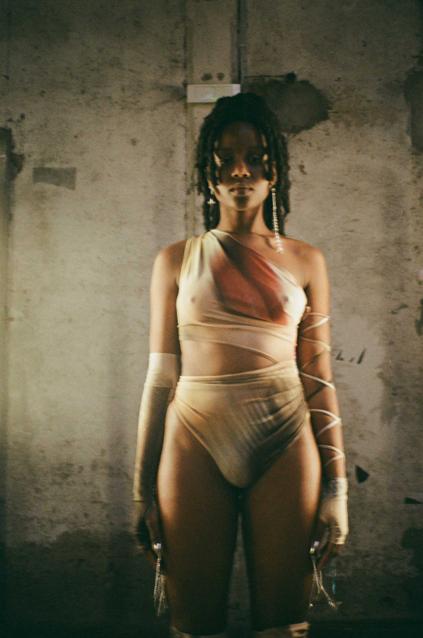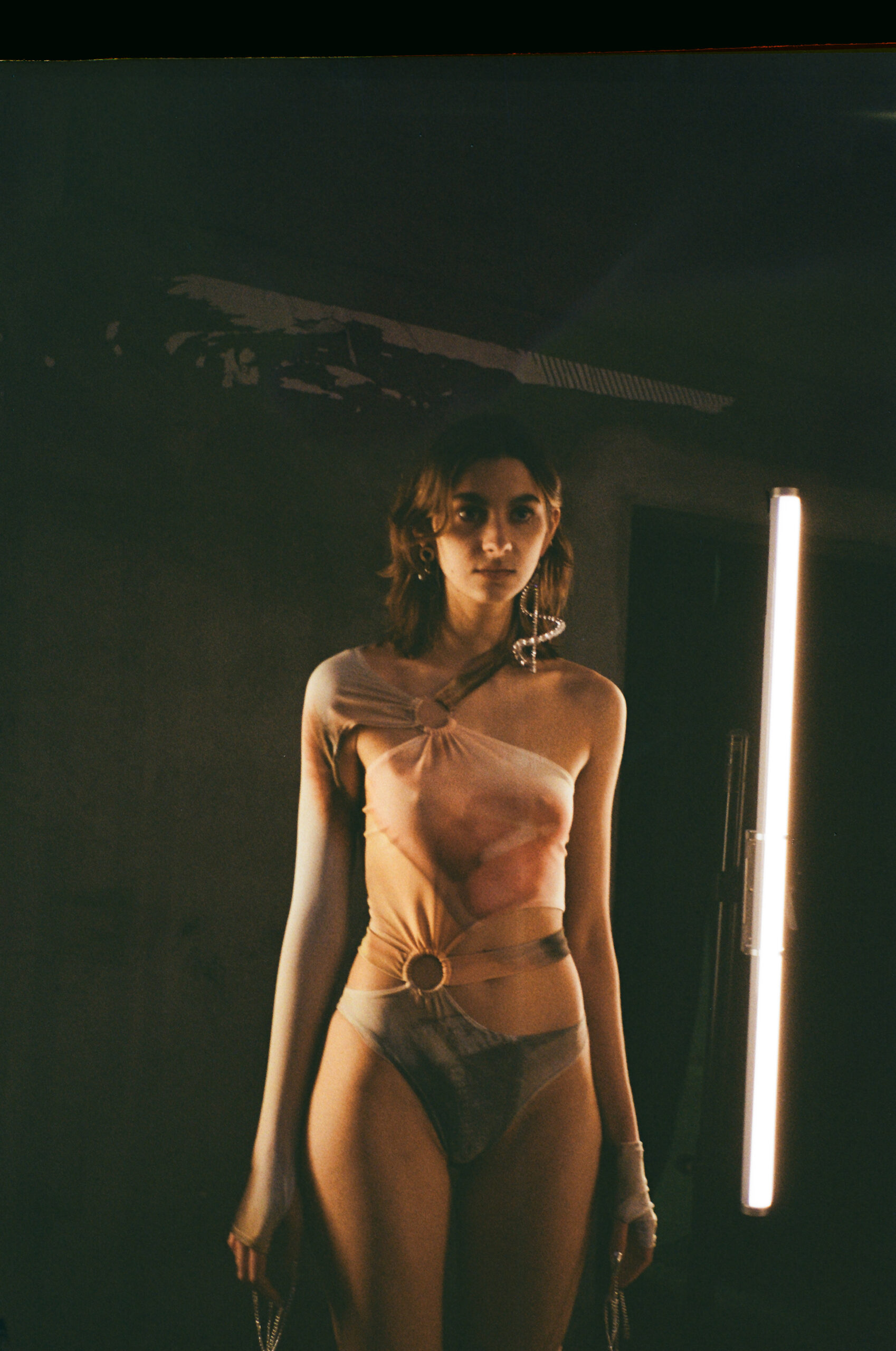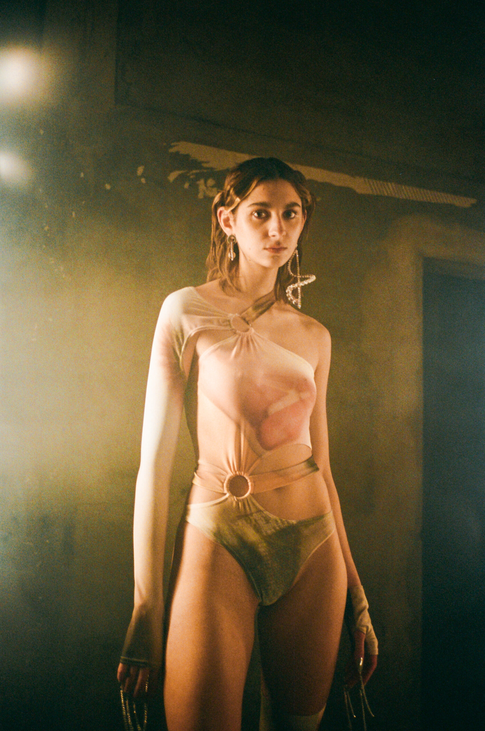 The collection is made of seven looks: bodysuits, jumpsuits and dresses made out of stretched fabrics that enhance silhouettes and wrap the body and draw a second skin, creating an interplay between sensuality and femininity. It is proposed in total black, to underline the sexy approach to nightlife, or proposed with all-over photographic print, signed by Carolina herself.