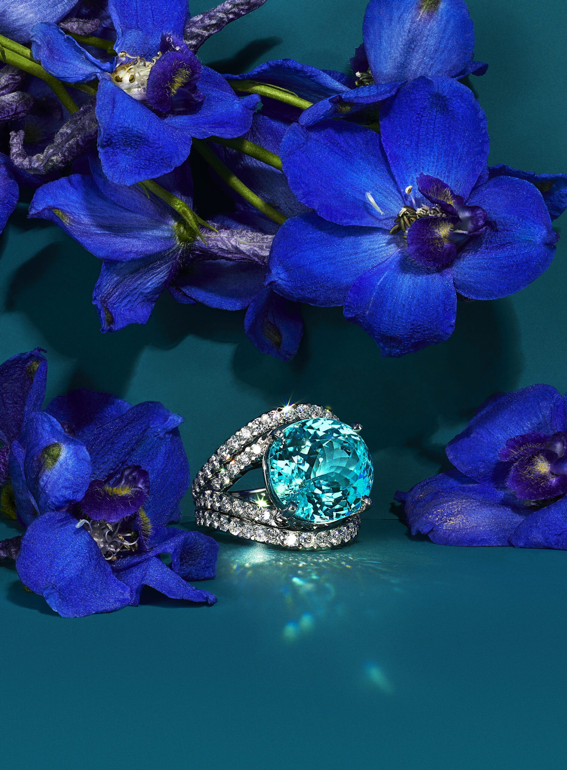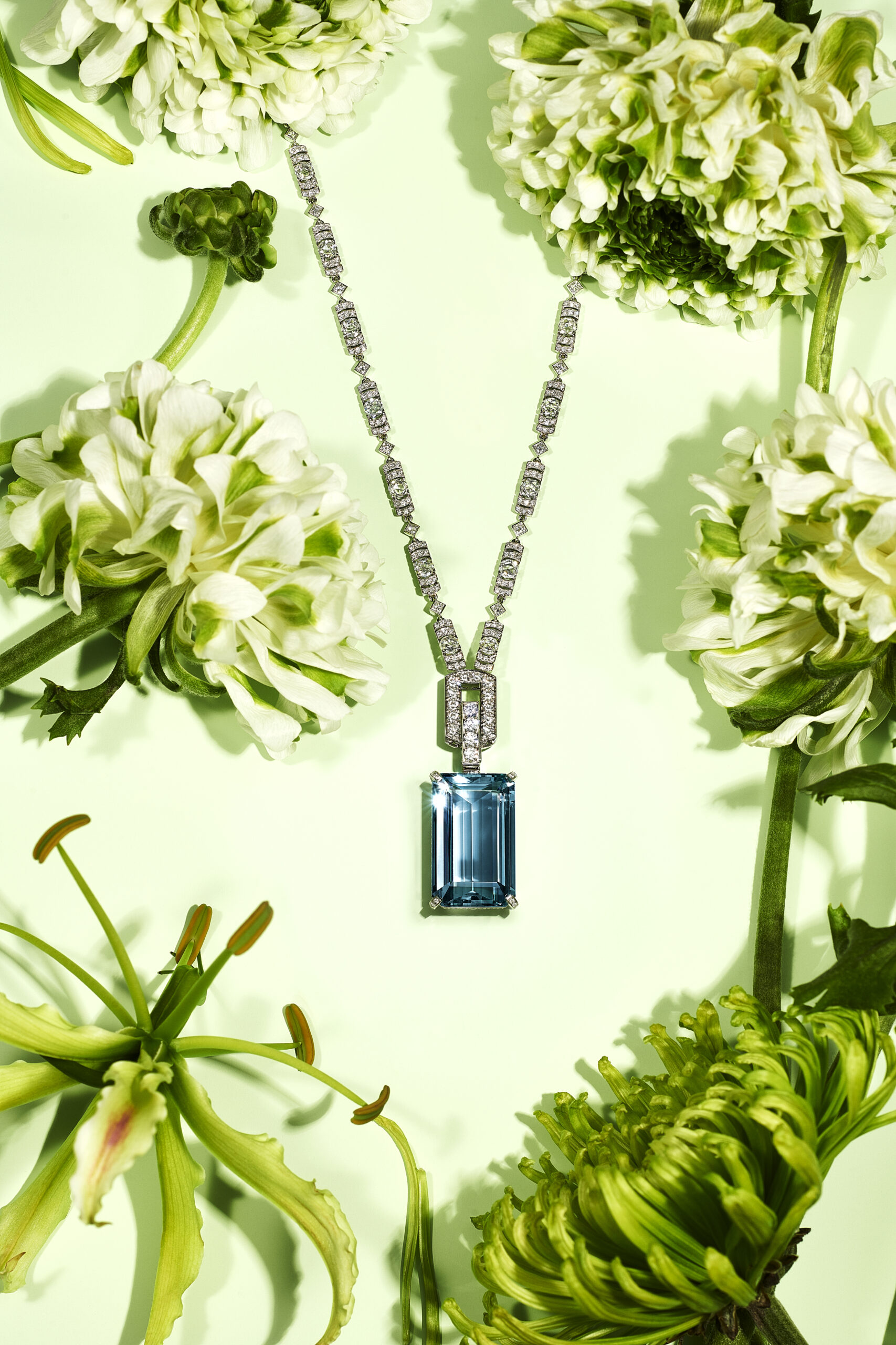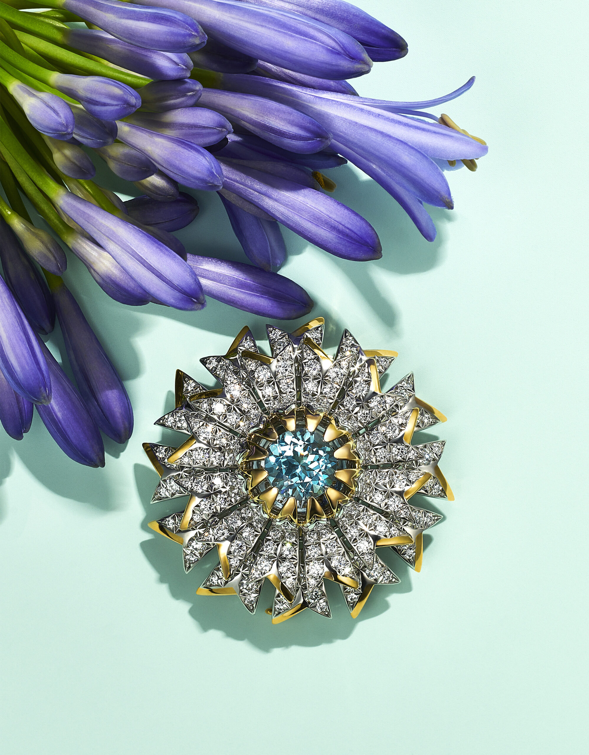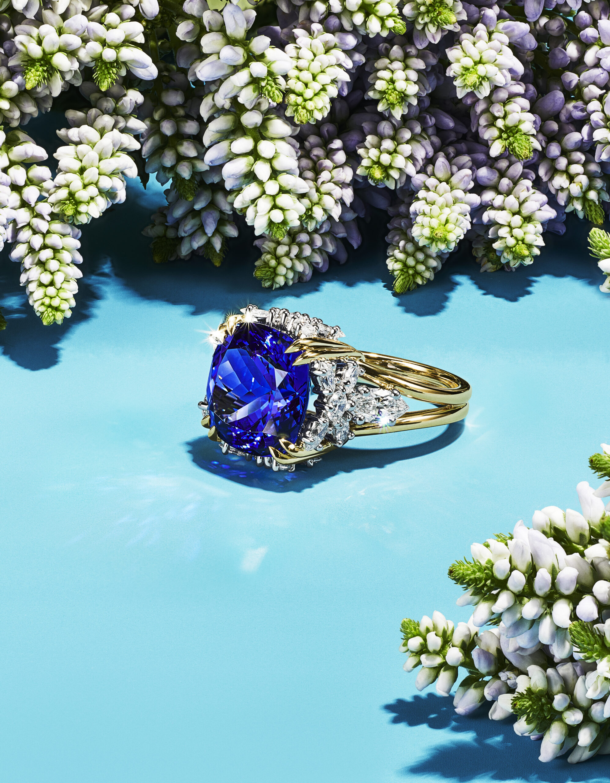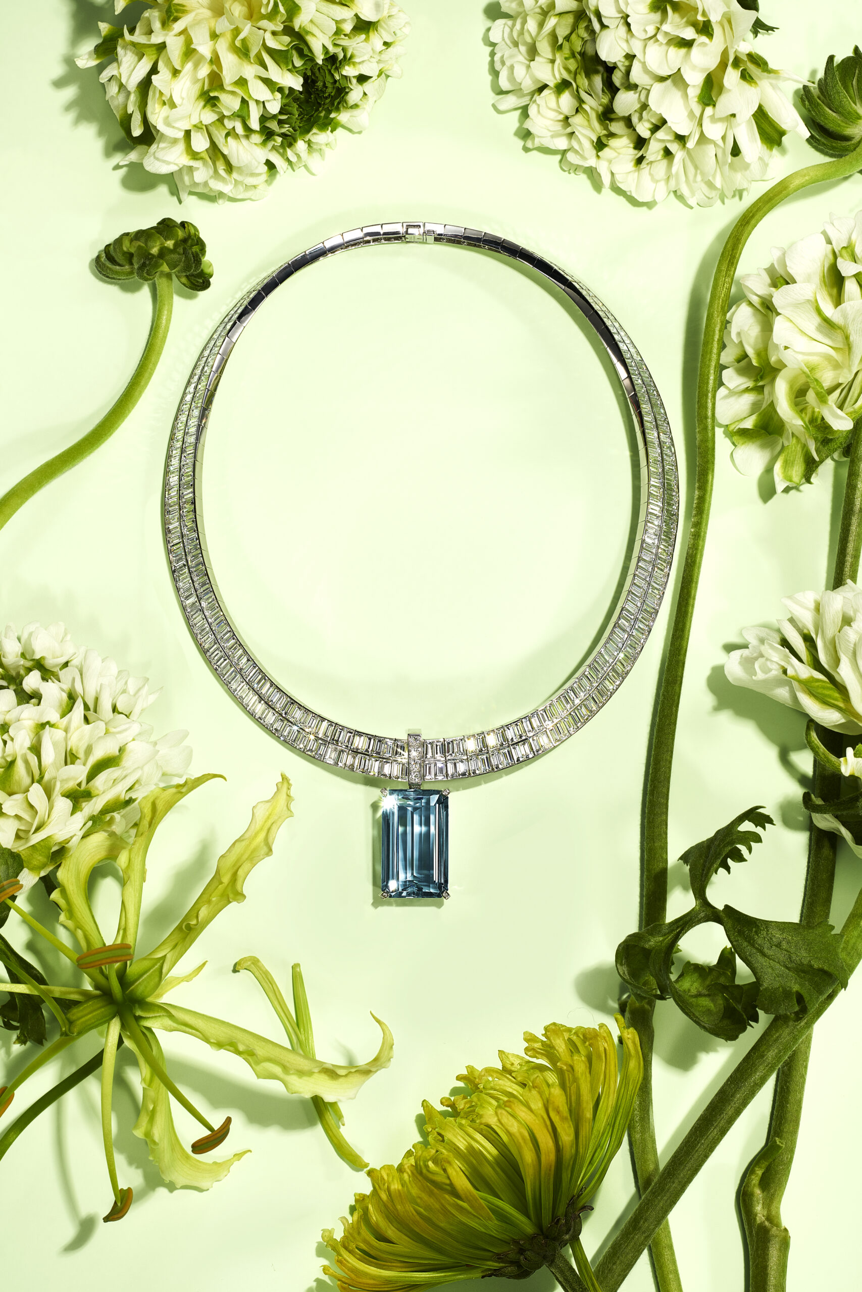 Les célèbres créations florales imaginées par Jean Schlumberger sont illuminées par des combinaisons de gemmes précieuses inattendues. Réalisé pour la première fois à partir d’un croquis que le créateur légendaire avait imaginé pour le Tiffany Diamond, le bracelet Fleurage fait rayonner une fascinante aigue-marine taille coussin de 48 carats, délicatement encadrée de pétales de fleurs en diamants. Parmi les autres créations enchanteresses de Jean Schlumberger mises à l’honneur dans la collection, figurent des déclinaisons des inoubliables colliers « Flowers and Leaves » ou Feuillage qui capturent la verve de la nature et ses voluptueux reliefs grâce aux pierres signatures de la Maison – les gemmes que Tiffany & Co. a découvert et rendu célèbre dans le monde entier – telles que la Tanzanite.