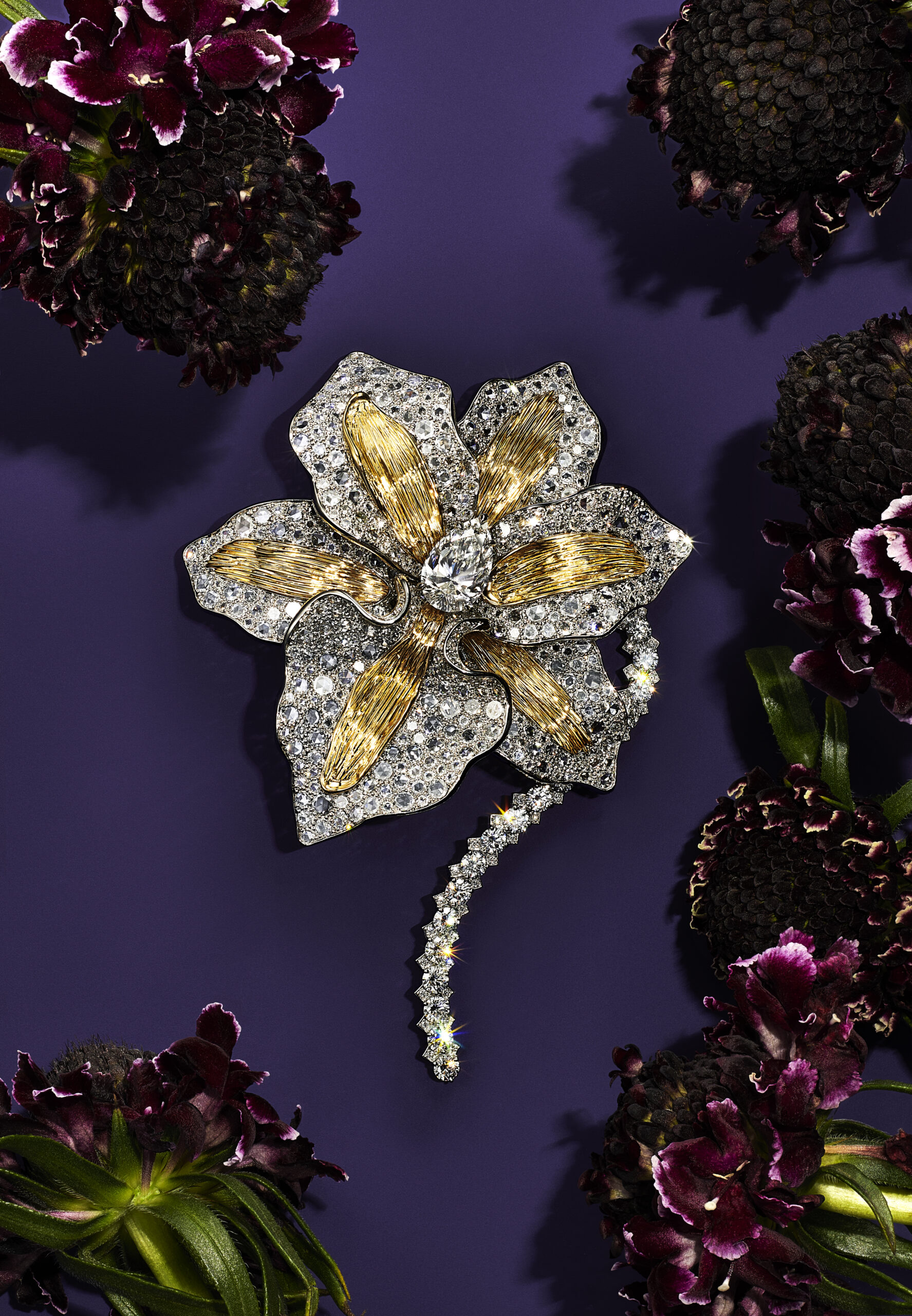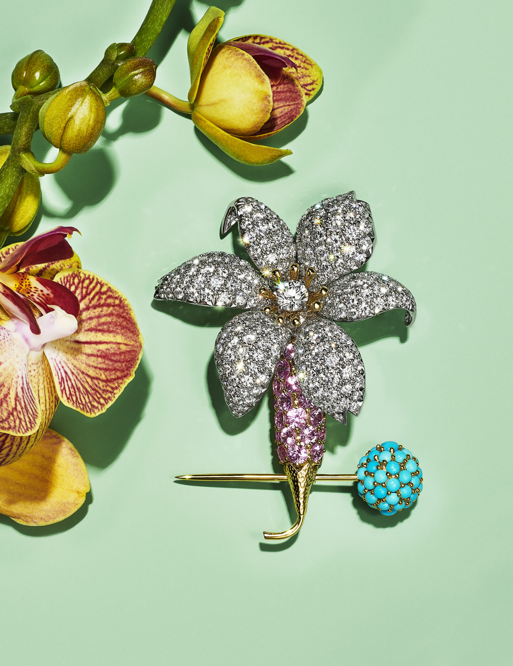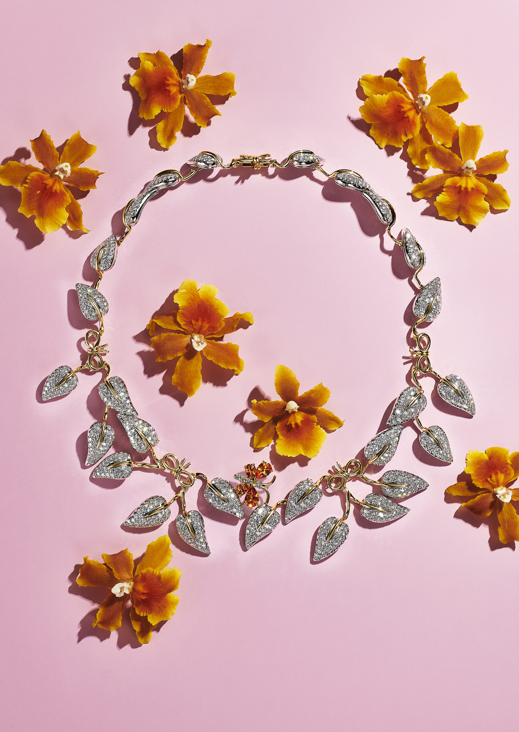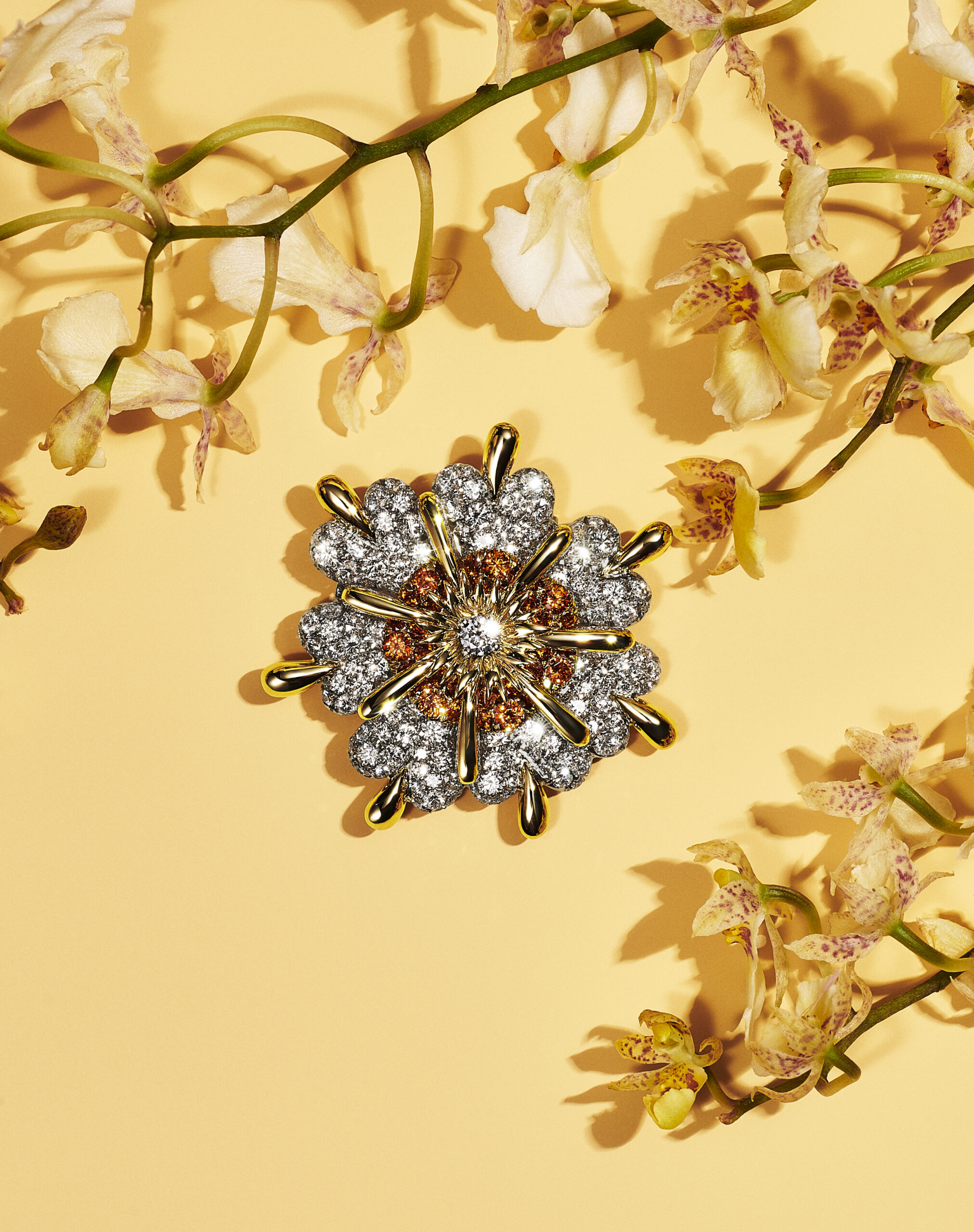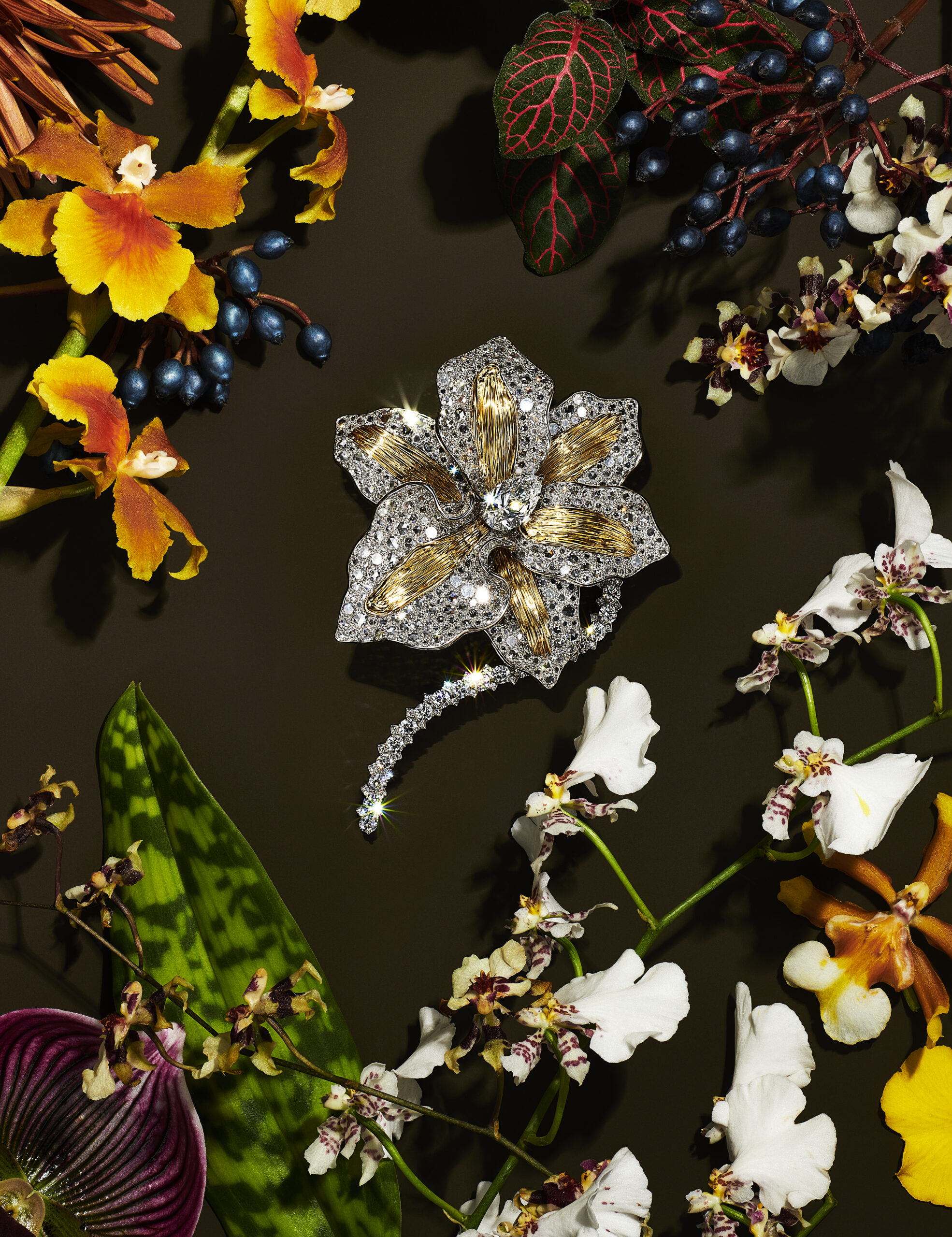 Motif de prédilection de cette collection qui juxtapose aux fleurs communes des espèces rares et exotique, l’orchidée inspire de nombreuses créations : les broches en email serties de diamants créées par le créateur joaillier, sculpteur et métallurgiste américain Georges Paulding Farnham pour Tiffany & Co. à l’occasion de l’exposition universelle de Paris en 1889 inspirent des nouvelles créations sculpturales et figuratives. Les courbes délicates des pétales d’orchidée éveillent une broche transformable de platine et or jaune 18 carats illuminée d’une myriade de diamants taille rose et taille brillant.