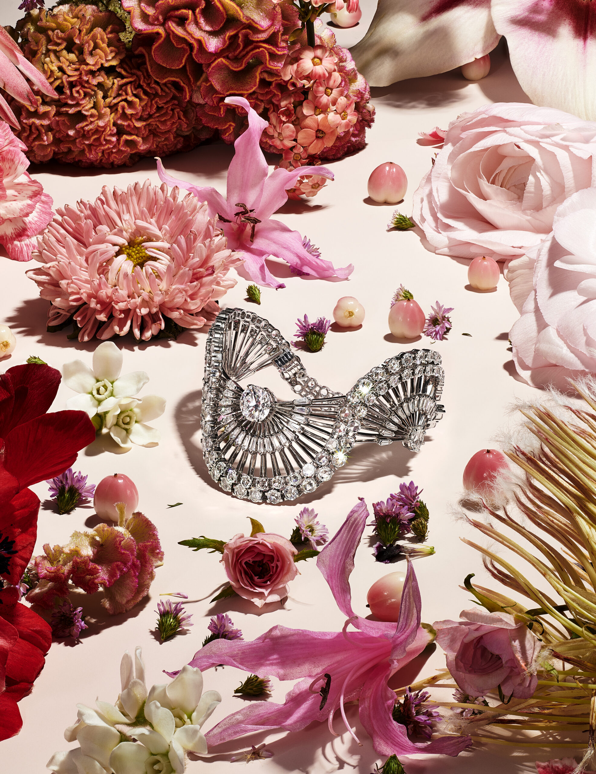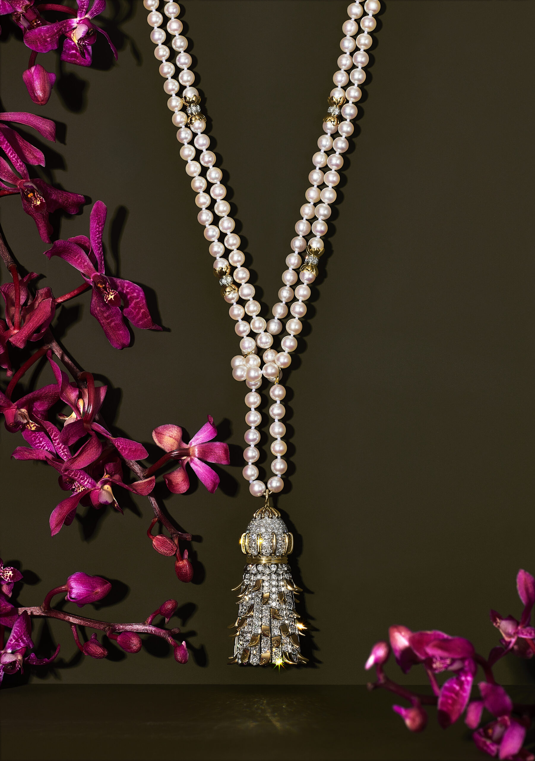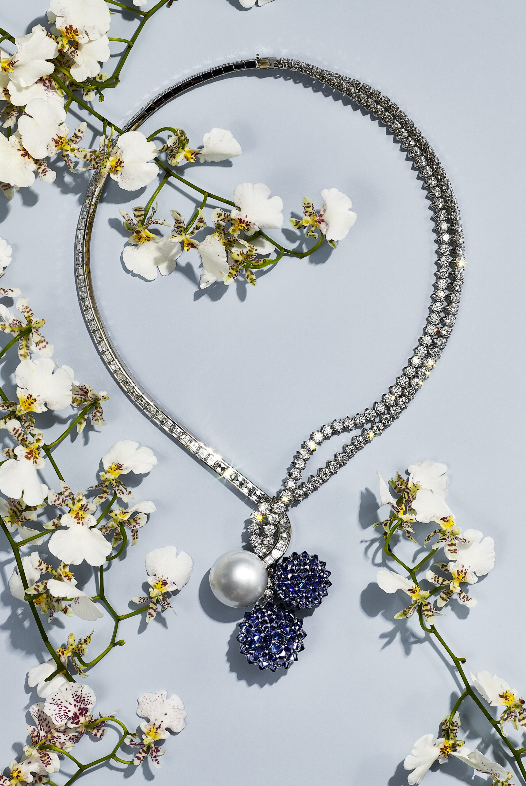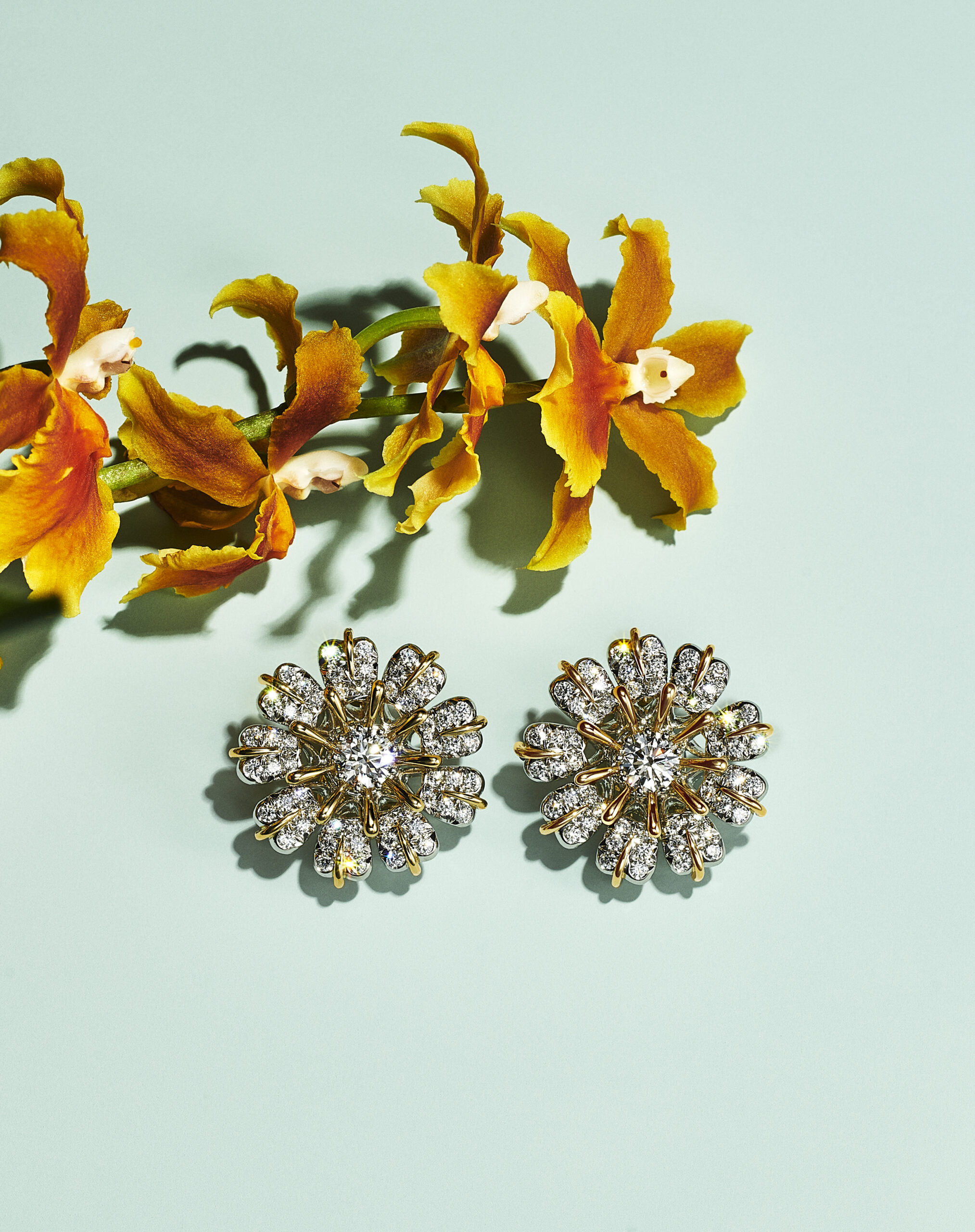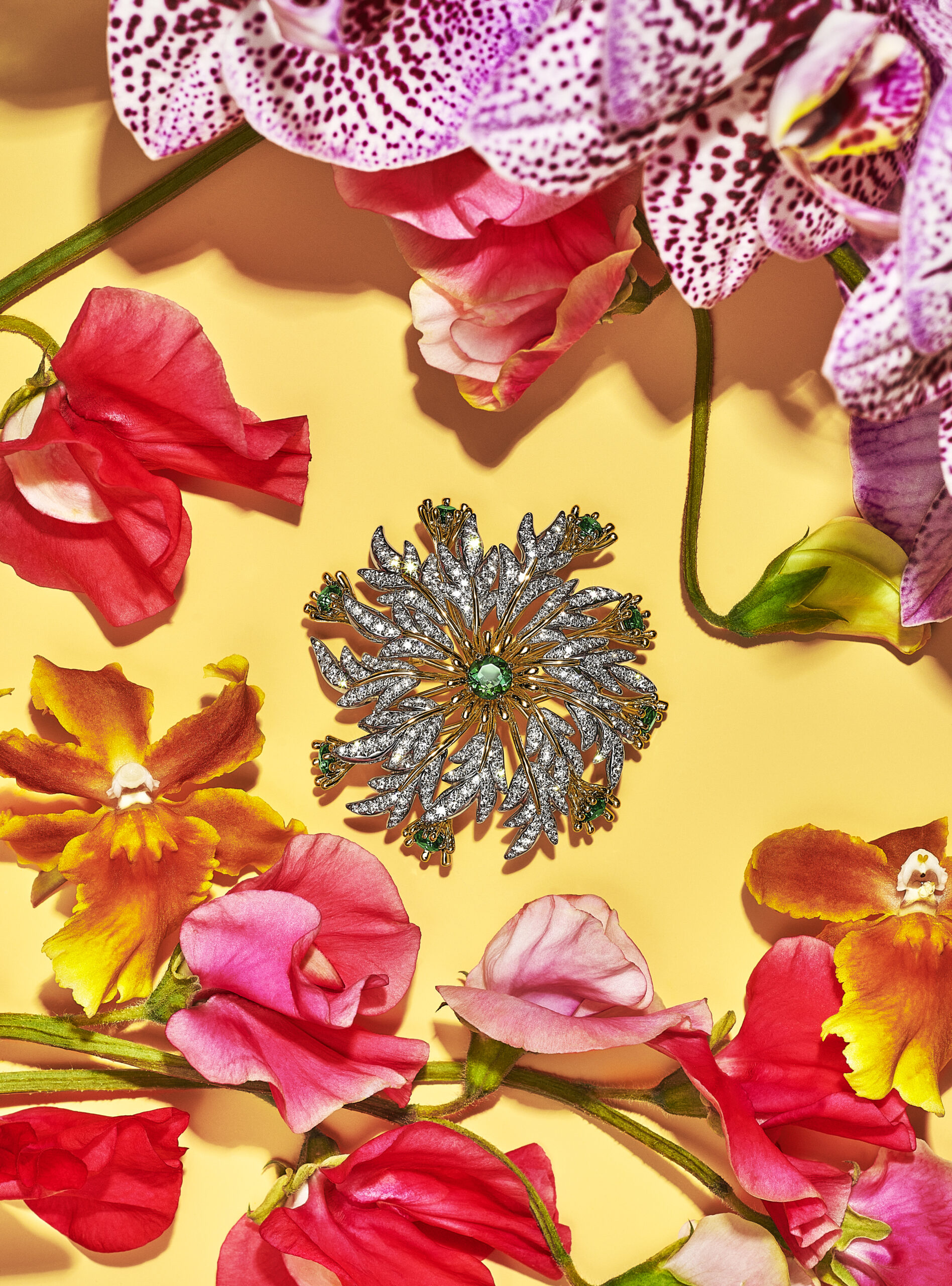 Motif de prédilection de cette collection qui juxtapose aux fleurs communes des espèces rares et exotique, l’orchidée inspire de nombreuses créations : les broches en email serties de diamants créées par le créateur joaillier, sculpteur et métallurgiste américain Georges Paulding Farnham pour Tiffany & Co. à l’occasion de l’exposition universelle de Paris en 1889 inspirent des nouvelles créations sculpturales et figuratives. Les courbes délicates des pétales d’orchidée éveillent une broche transformable de platine et or jaune 18 carats illuminée d’une myriade de diamants taille rose et taille brillant.