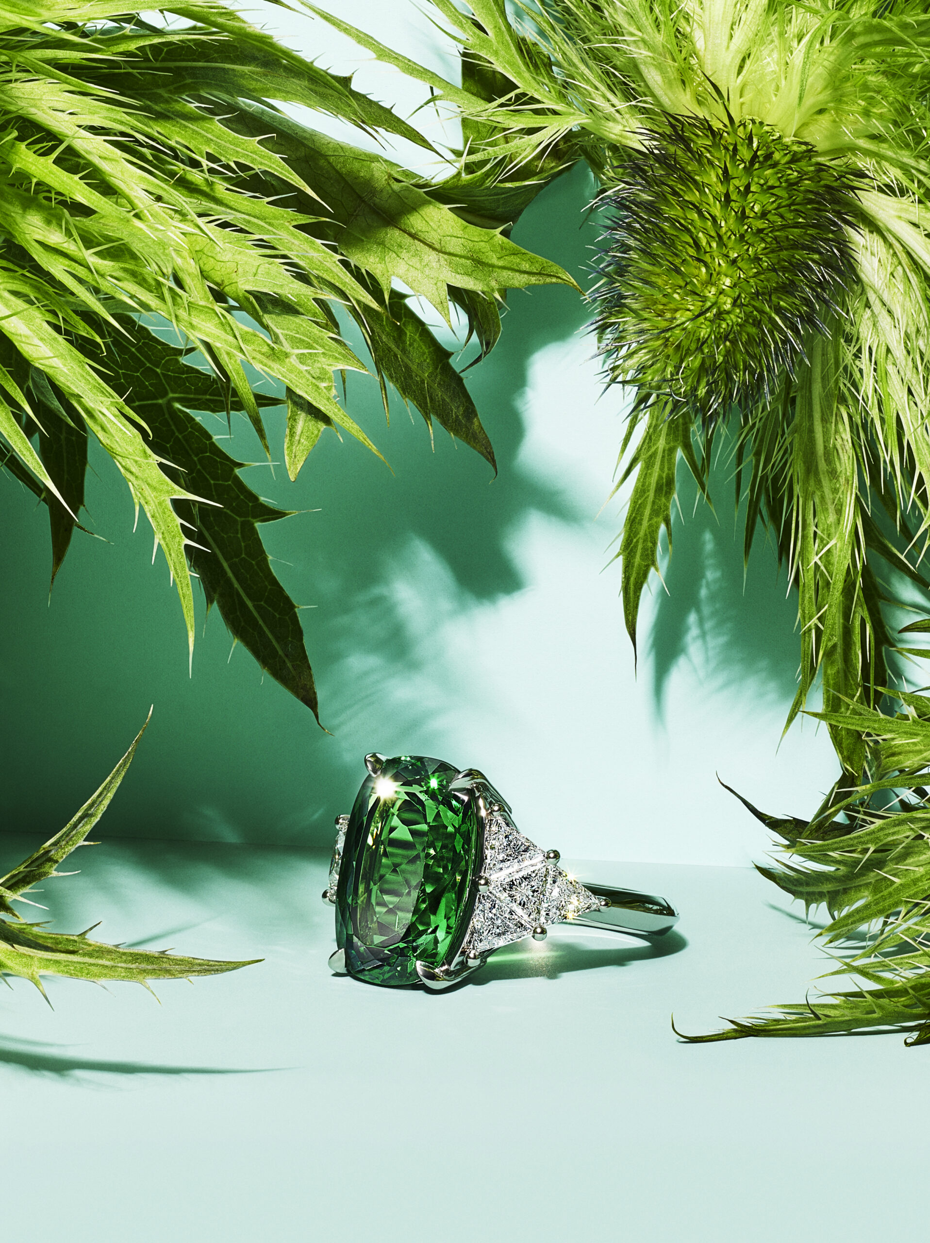 Un autre thème, le chardon, prend la forme de bijoux complexes à l’allure élégante. Un sertissage à la main en trillion pour donner vie à la texture hérissée du Chardon.