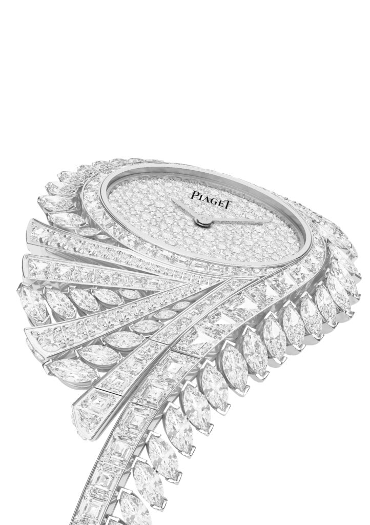 seconde peau. Les différentes coupes de diamants associées à la variété des sertis procurent une élégance résolument moderne au garde-temps. Plus de 250 diamants ont été agencés avec minutie : serti griffe pour la taille marquise, serti neige sur le cadran, serti rail pour la taille baguette, et serti grain pour les diamants ronds brillants qui ornent le bracelet.