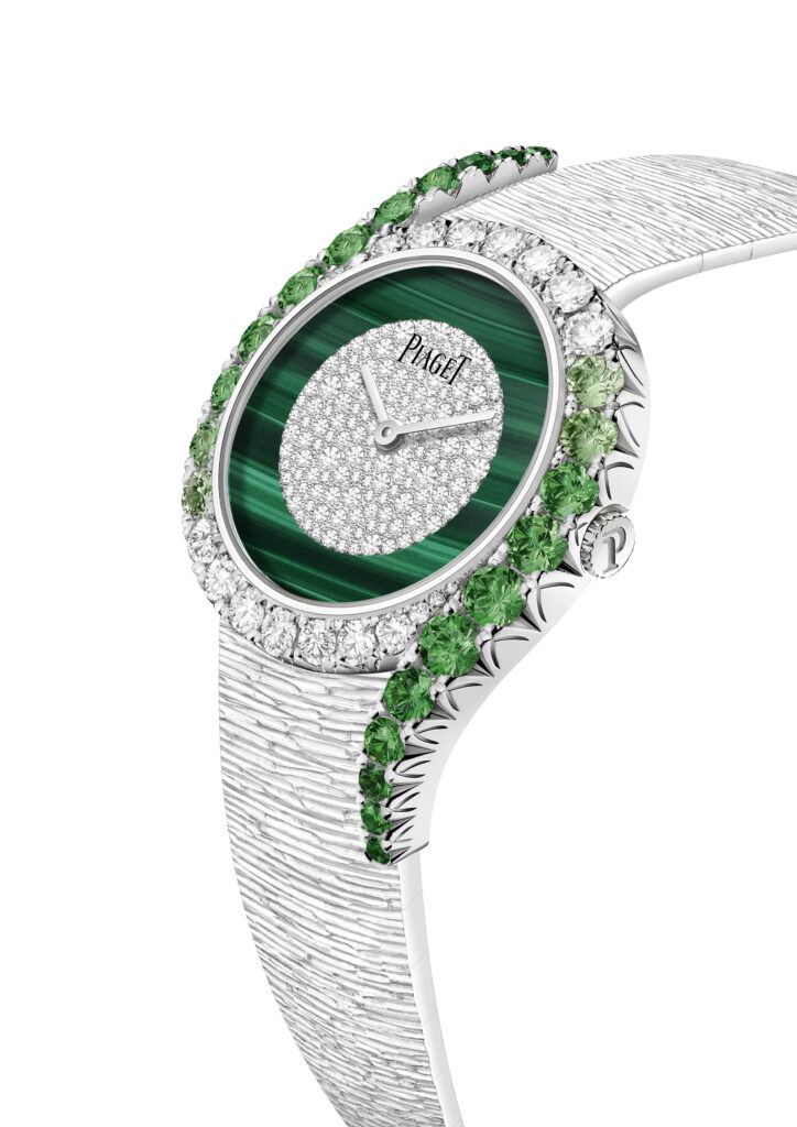 La Limelight Gala Precious est une création vibrante d’éclat et d’intensité. Son cadran en malachite est bordé d’une lunette asymétrique sertie de diamants et de tsavorites formant un somptueux dégradé de couleur. La malachite qui orne les cadrans répond aux critères d’exigence les plus rigoureux de Piaget. Chaque pierre semi-précieuse doit présenter une couleur intense et des veines régulières contrastées, des lignes incurvées, et sa structure doit être dénuée de tout élément cristallin. Le garde-temps est logé dans un boîtier en or blanc de 32 mm de diamètre, son cadran en malachite jouant les contrastes avec un disque central entièrement pavé de diamants sertis neige. La Limelight Gala Precious est ornée de 174 diamants et de 22 tsavorites. Son boîtier et le sertissage des pierres ont nécessité à eux seuls 22 heures de réalisation. Elle est alimentée par un mouvement automatique Manufacture 501P1 parfaitement visible à travers le fond saphir du boîtier. Les plus fins observateurs remarqueront que cette forme imbriquée dans une autre est un thème récurrent chez Piaget, puisque cette montre puise son inspiration dans les créations patrimoniales de la Maison.