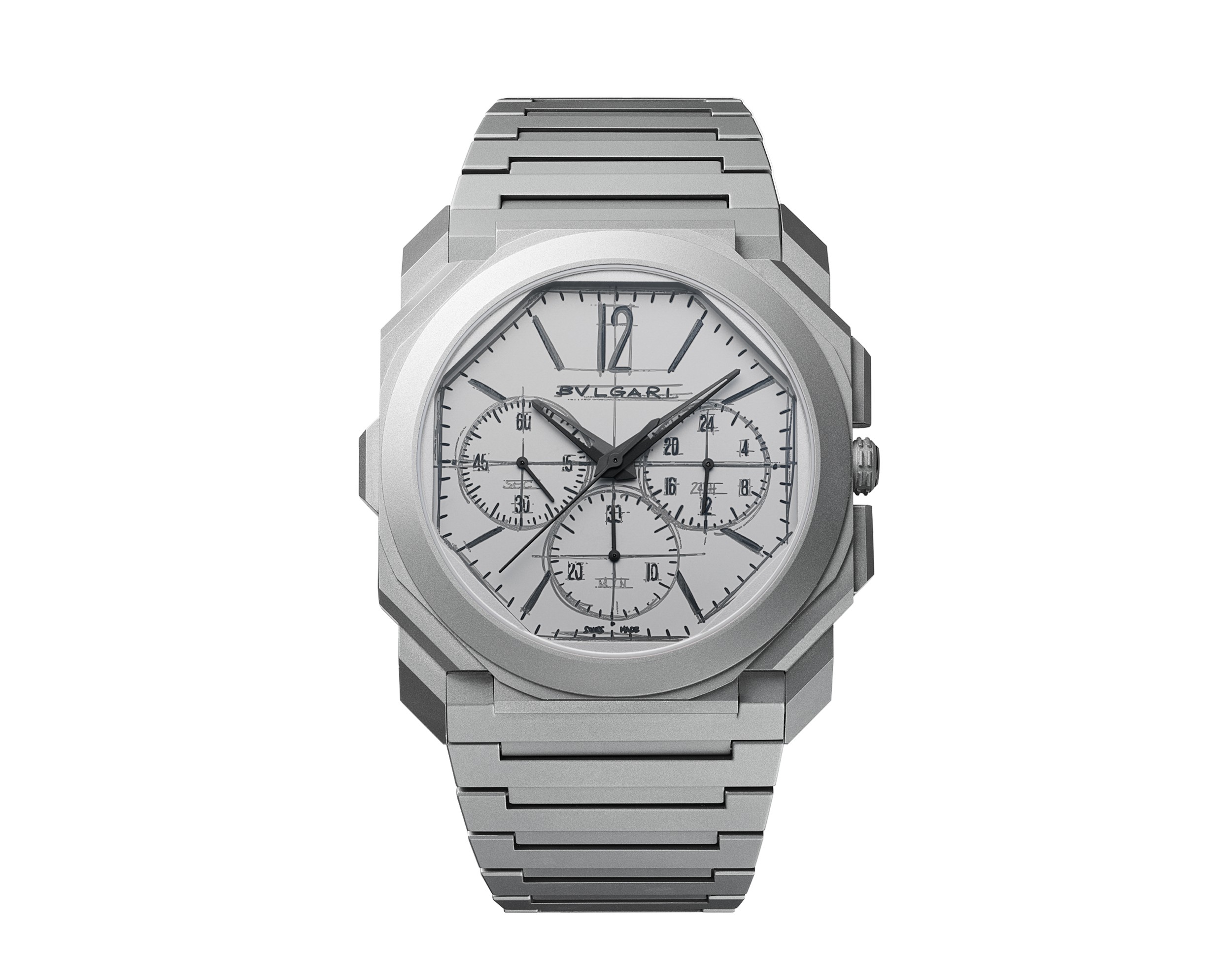 Boîtier en titane sablé, 40 mm, fond transparent avec personnalisation ; cadran en titane sablé gris mat avec index gravés, logo Bulgari et compteurs, reproduisant le premier dessin de Fabrizio Buonamassa Stigliani ; étanche à 1 ATM.