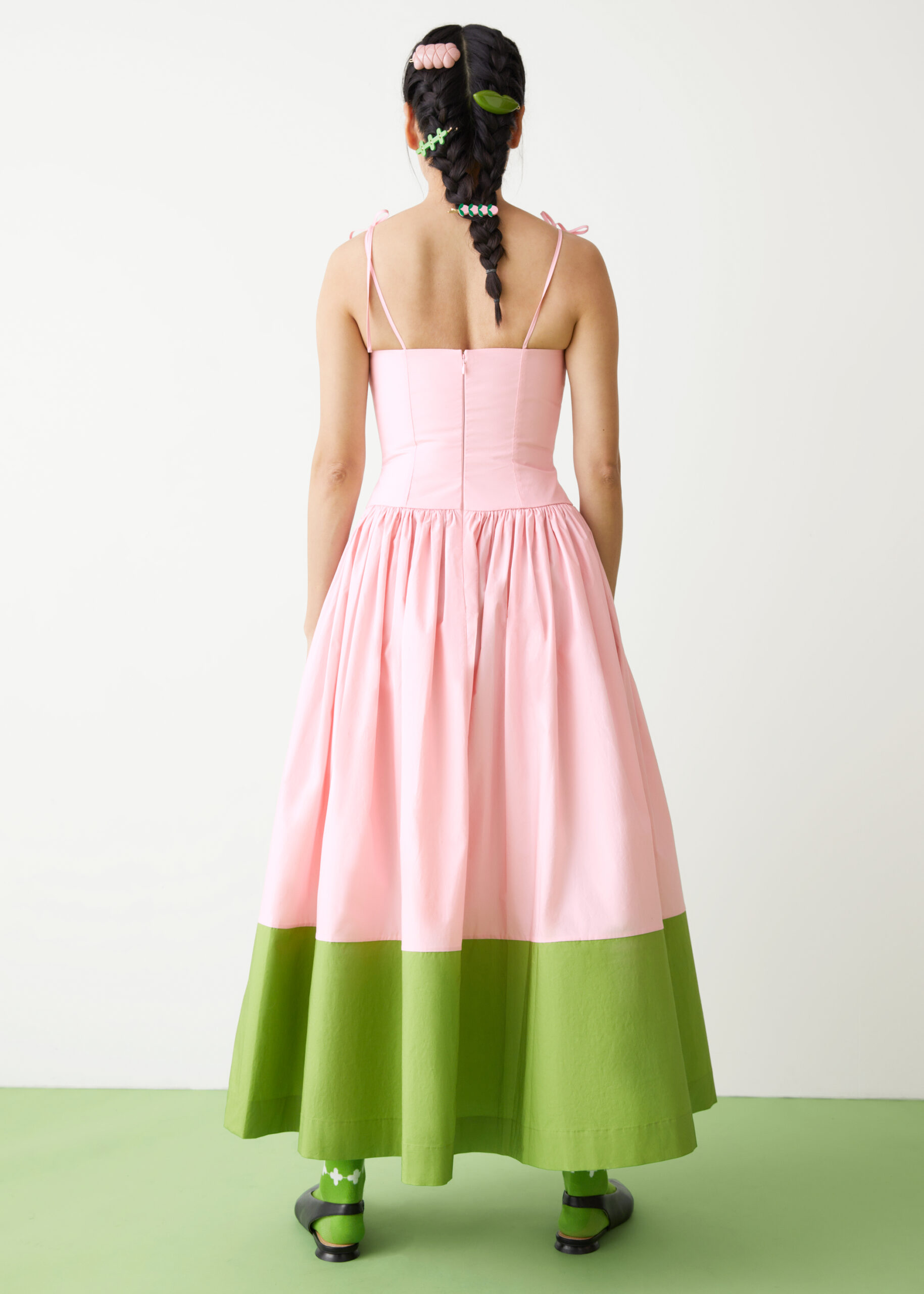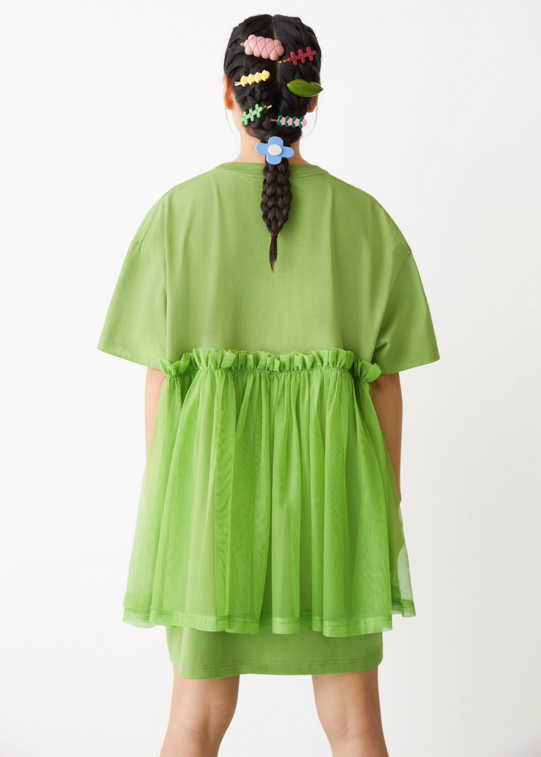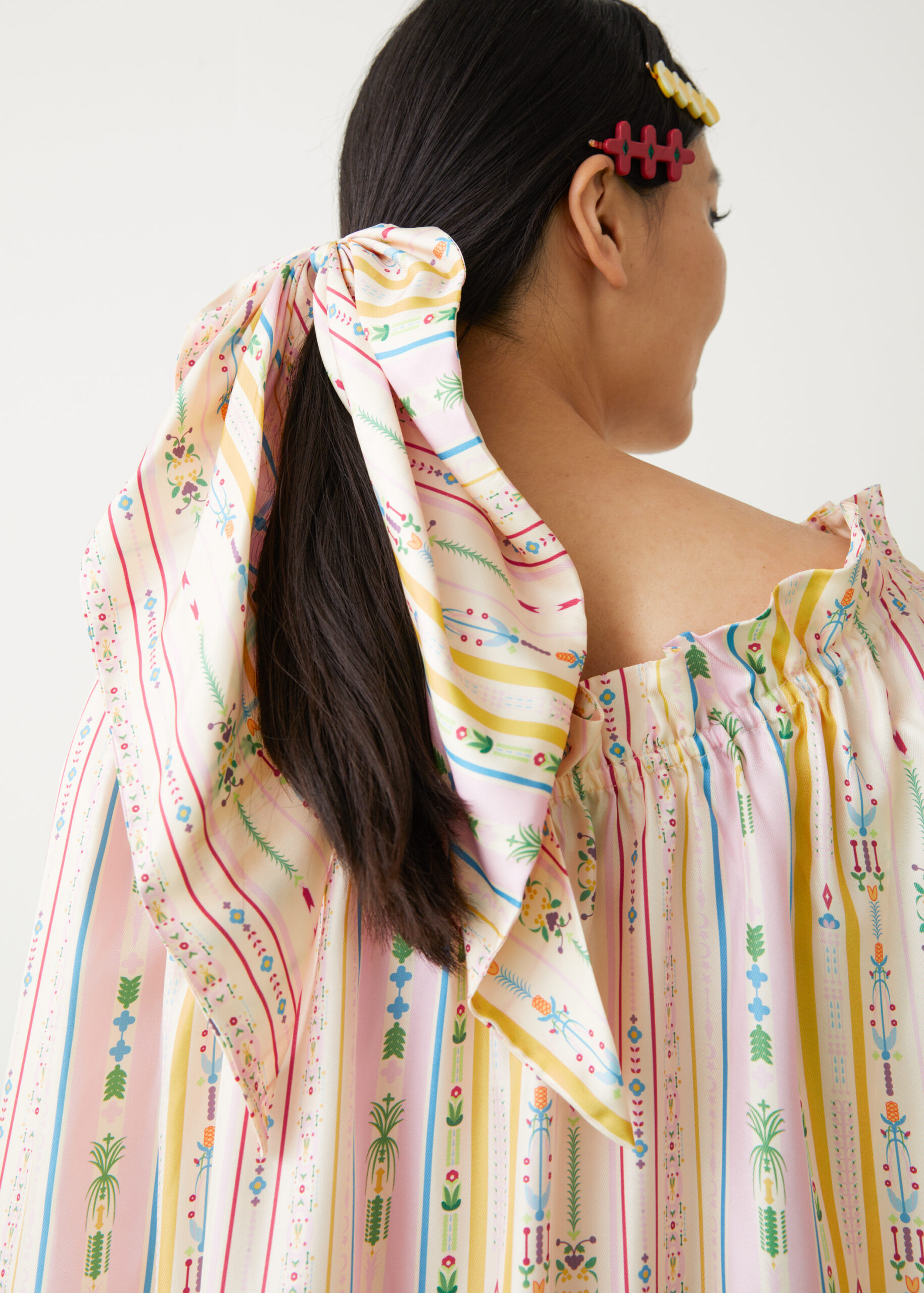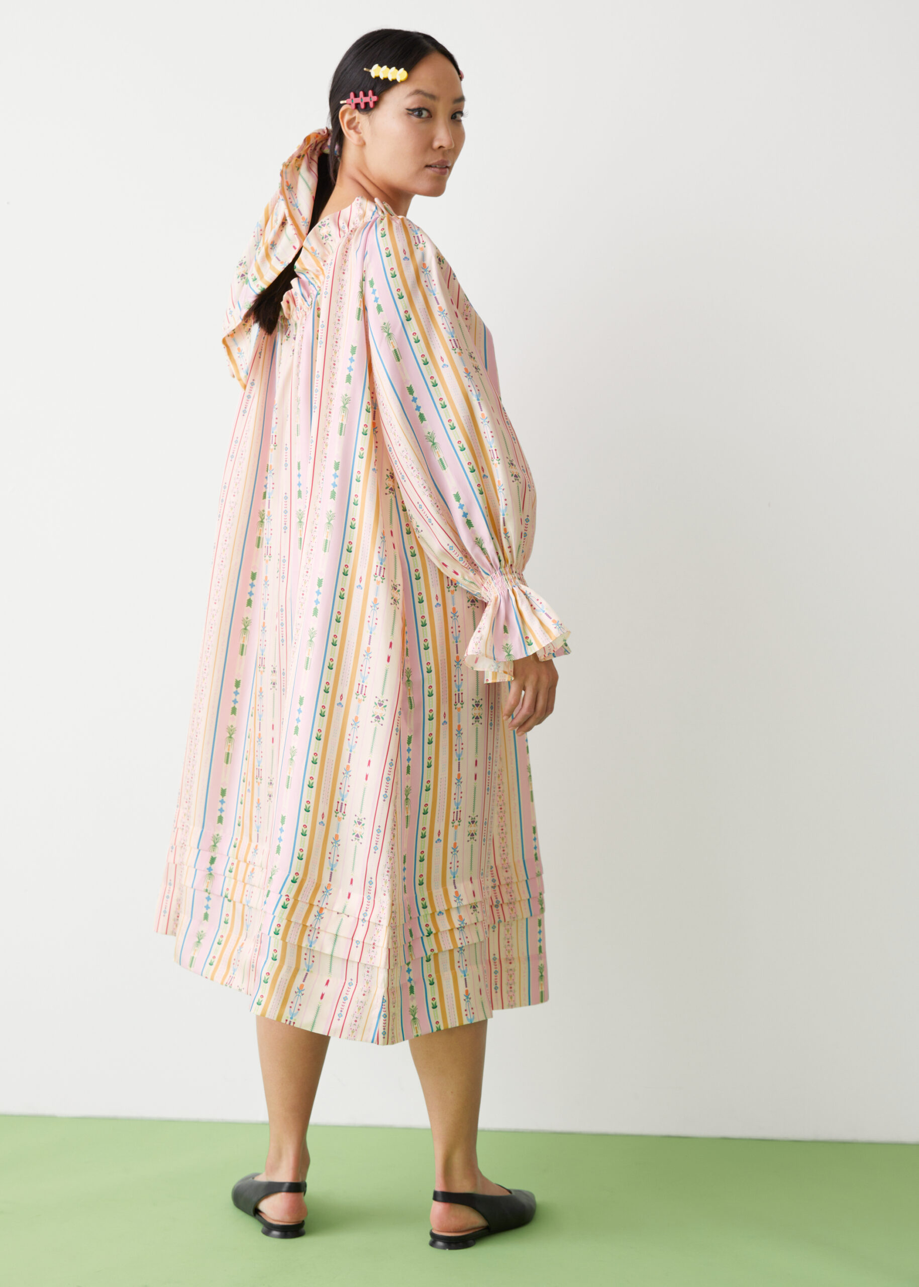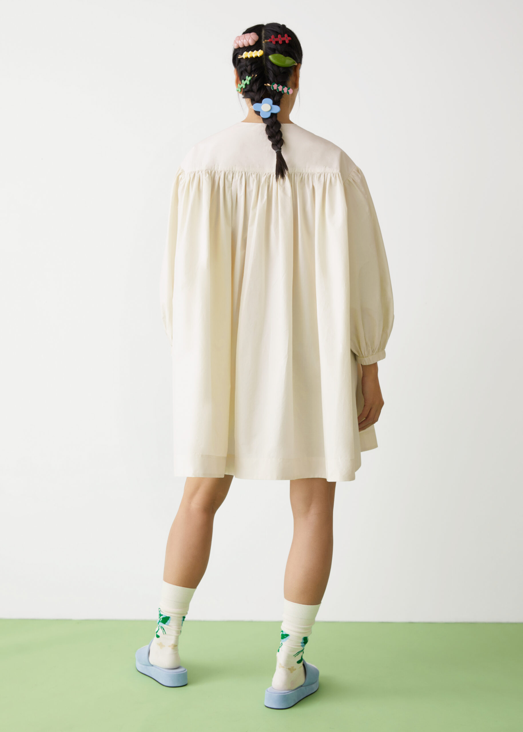 Les bretelles à nouer et les cordons de serrage à la taille équilibrent les volumes exagérés et les détails délicats tels que les plis et les manches ballons. Les accessoires comprennent des pinces à cheveux, des chouchous, des lunettes de soleil et des chaussettes imprimées.