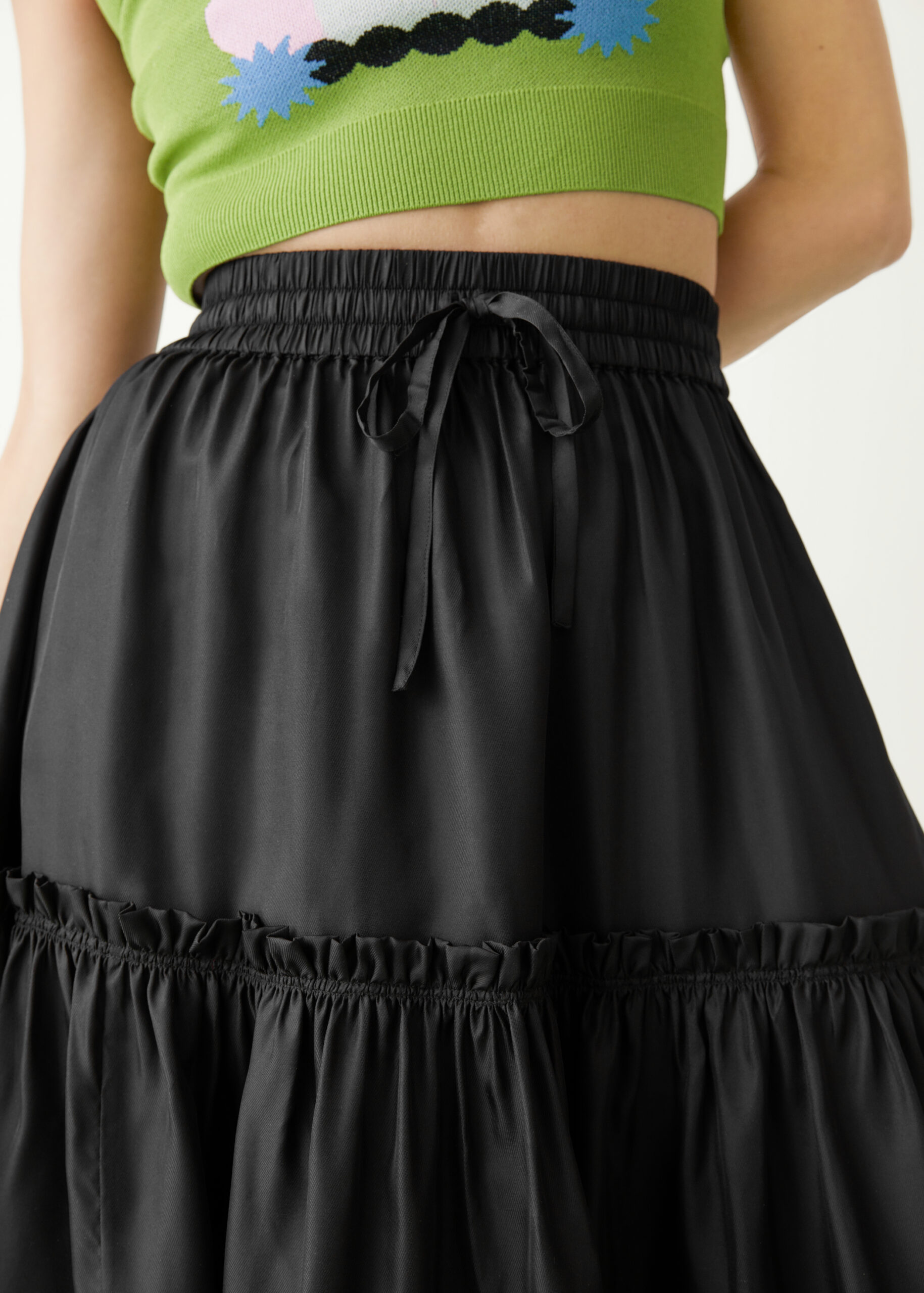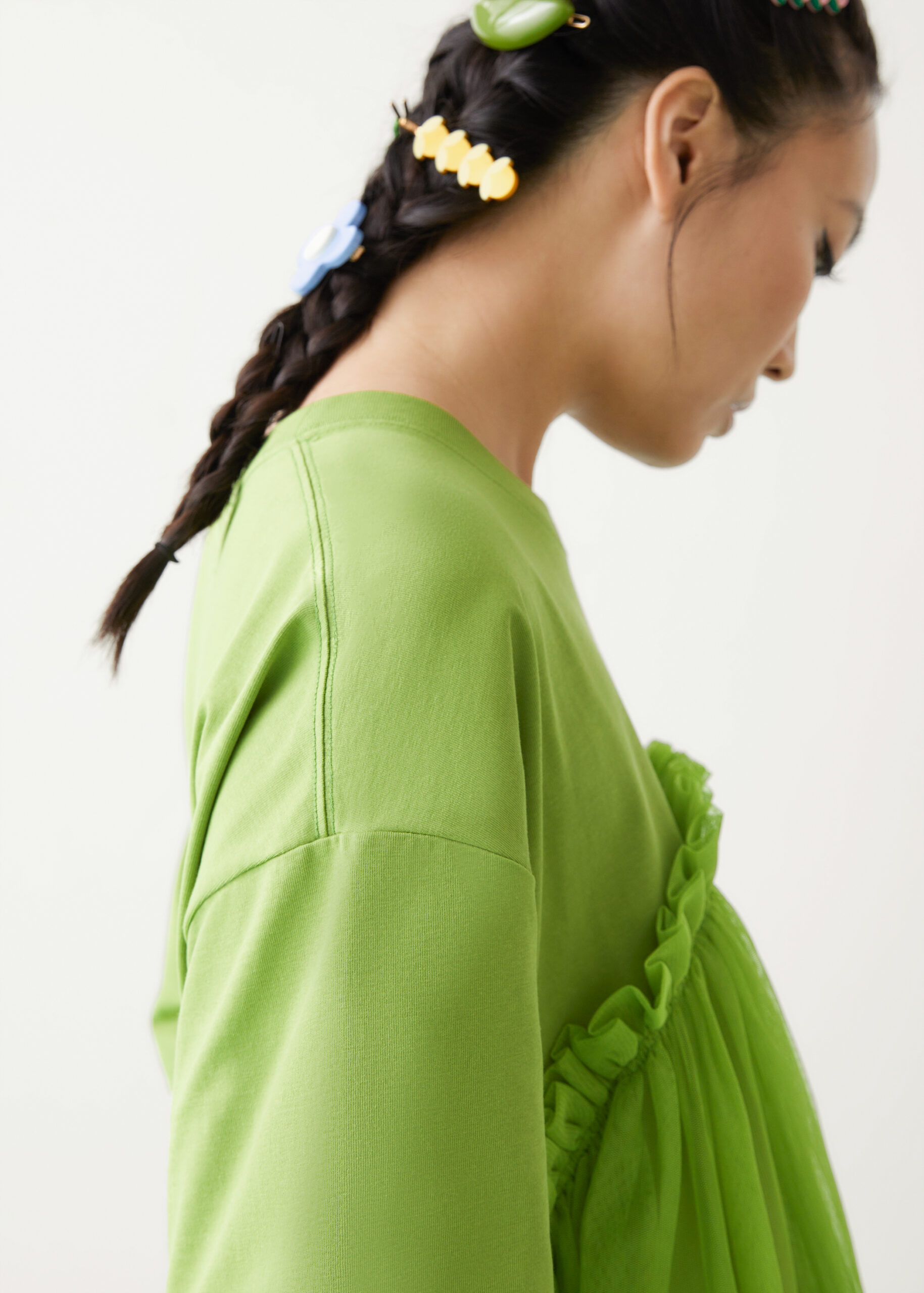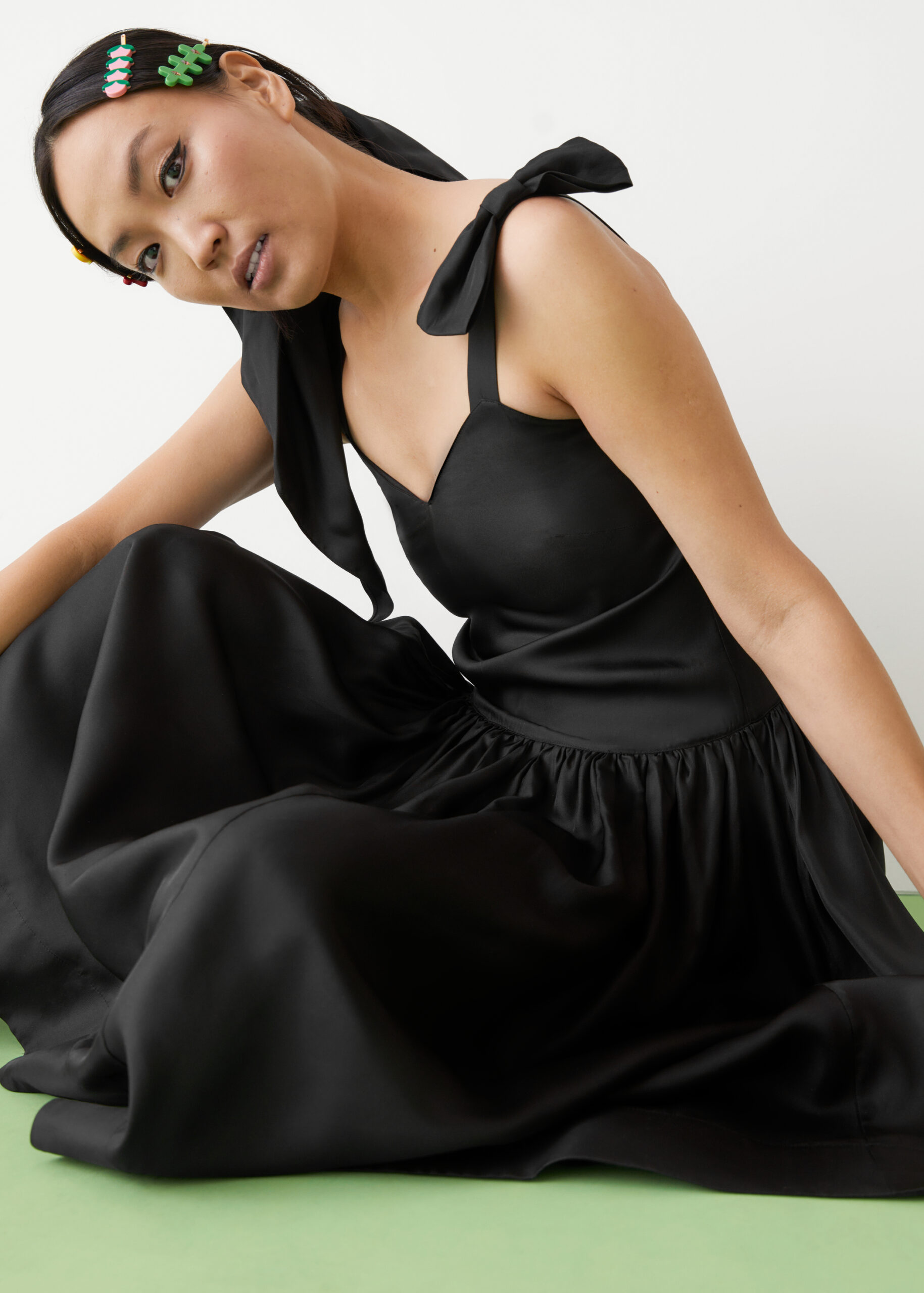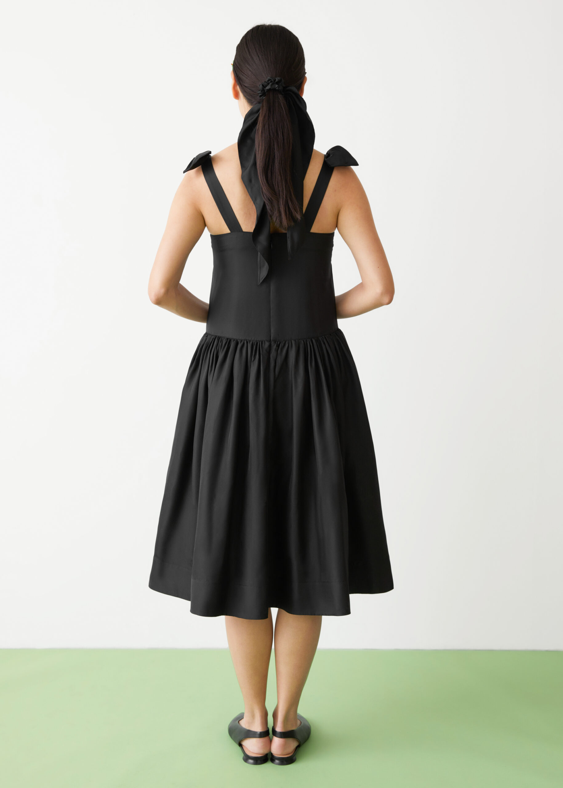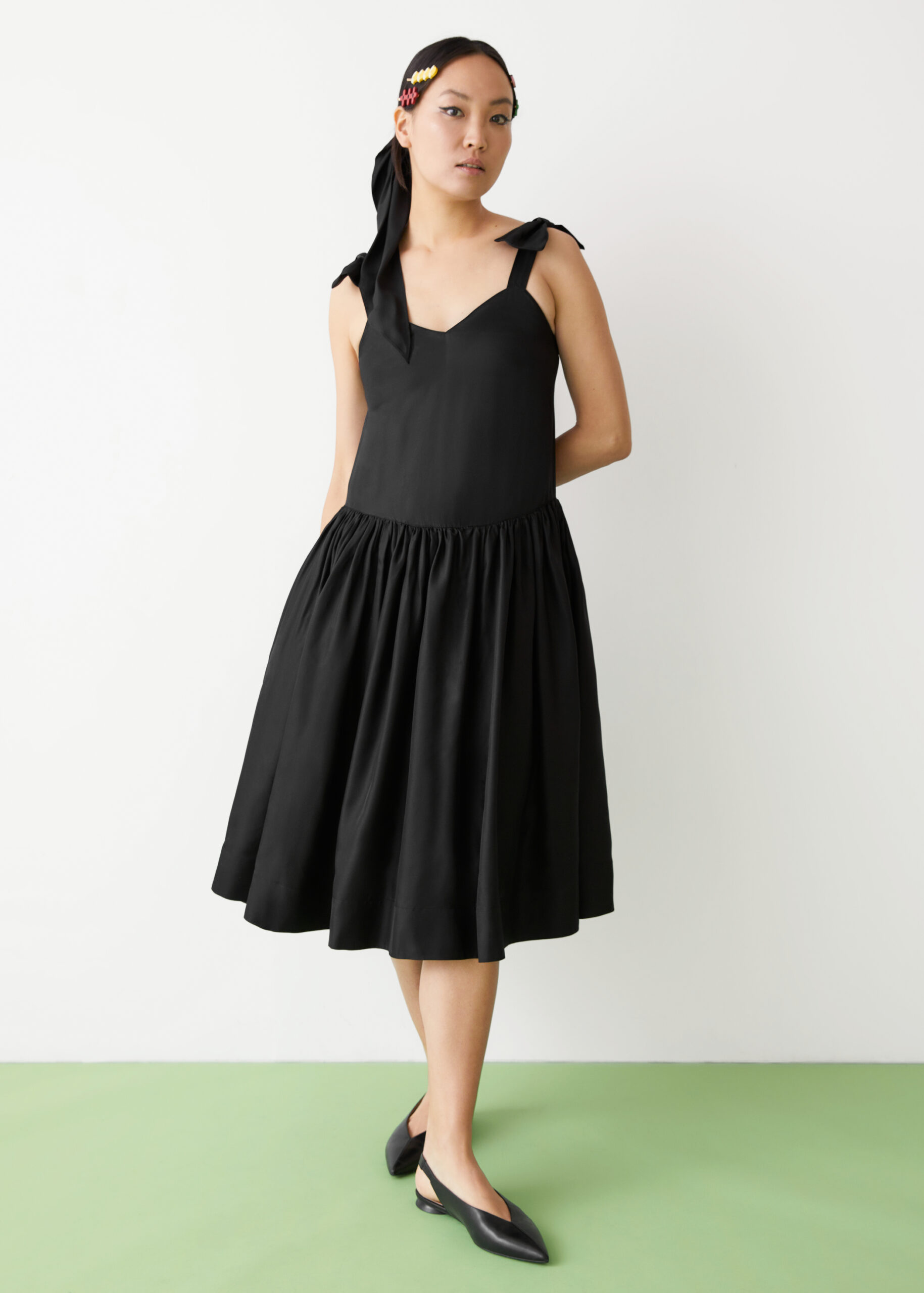 Les bretelles à nouer et les cordons de serrage à la taille équilibrent les volumes exagérés et les détails délicats tels que les plis et les manches ballons. Les accessoires comprennent des pinces à cheveux, des chouchous, des lunettes de soleil et des chaussettes imprimées.