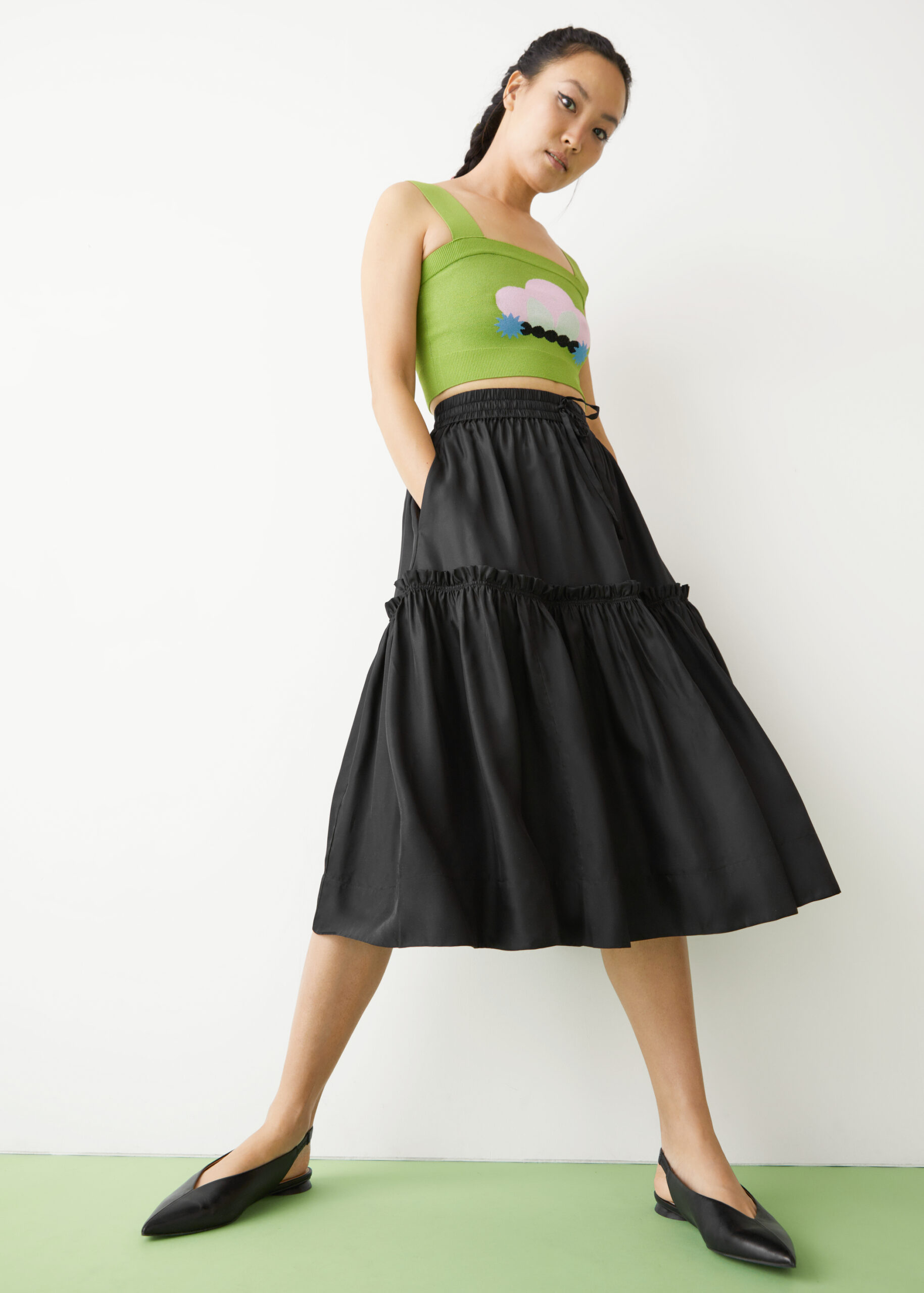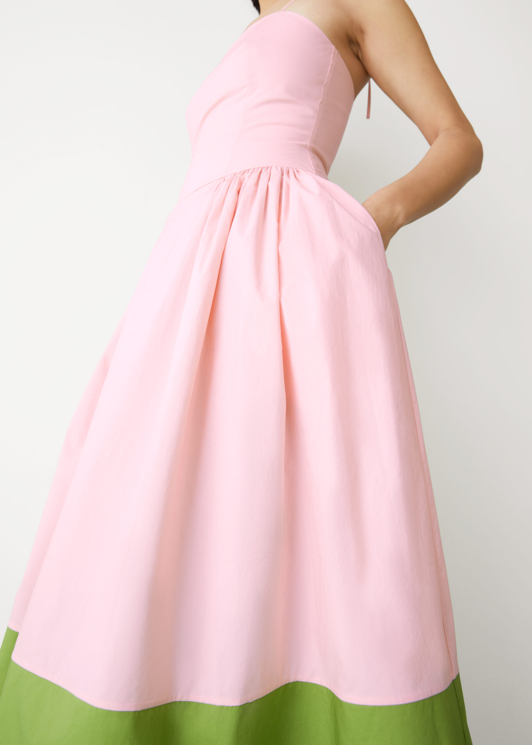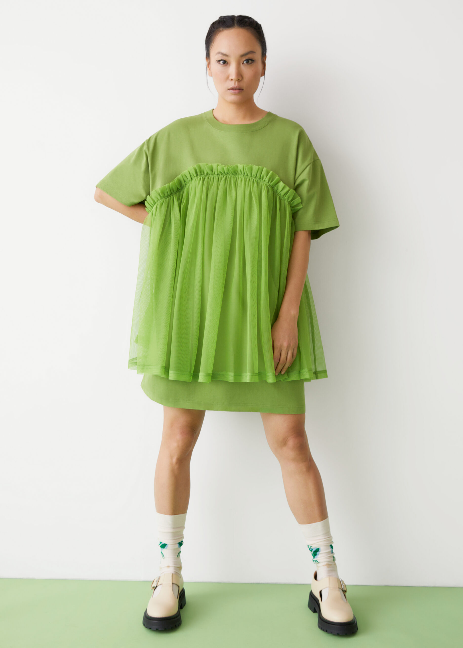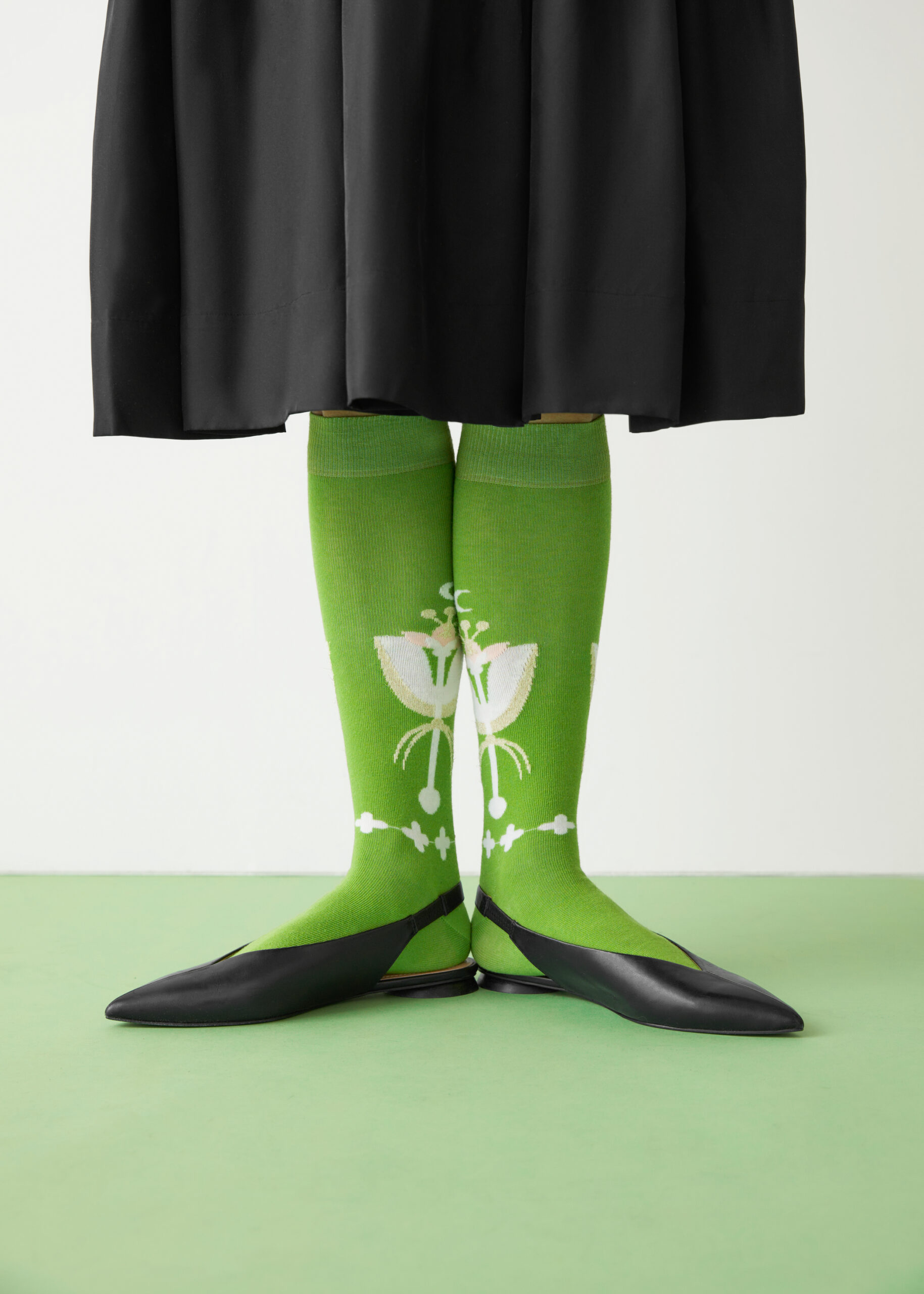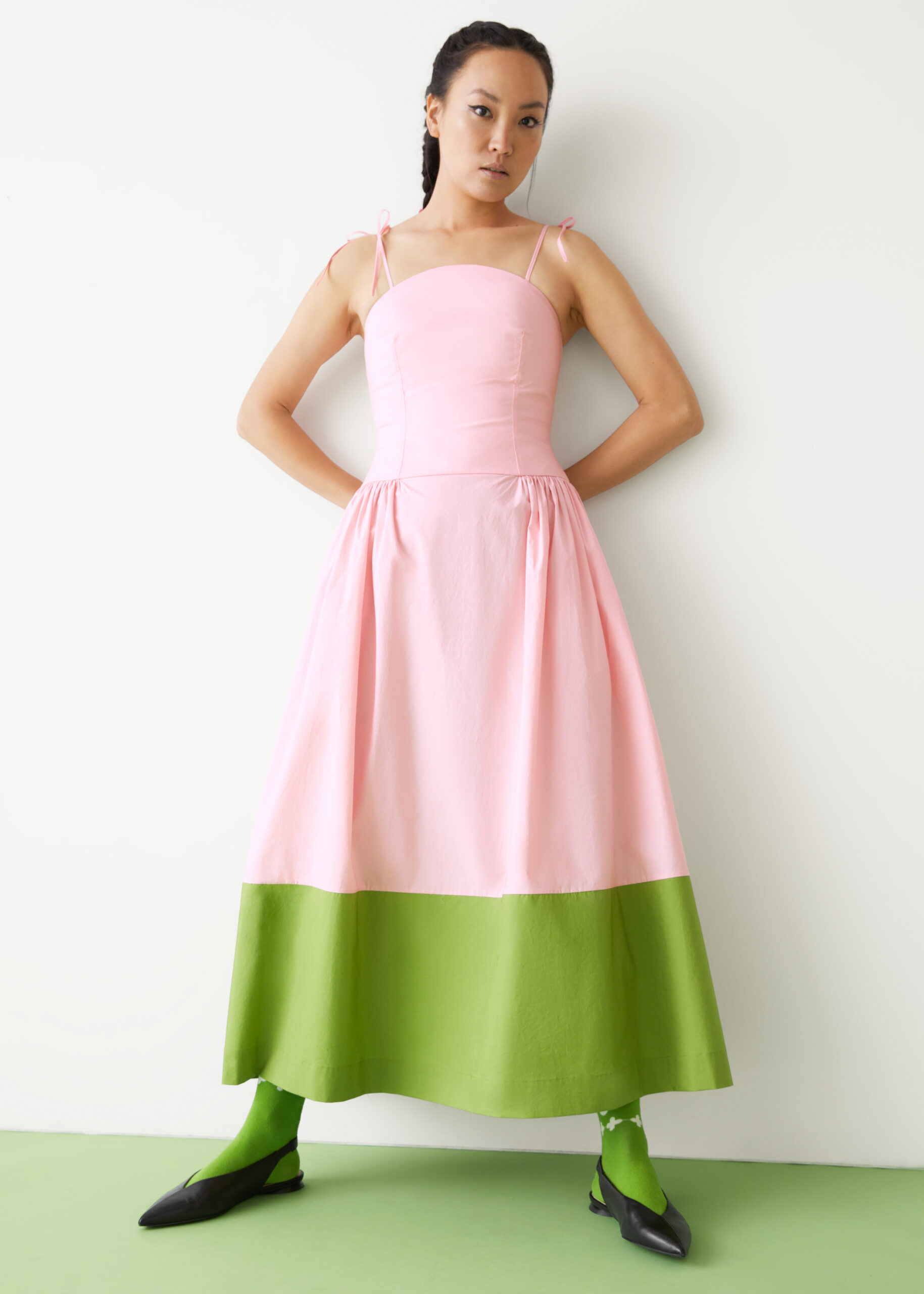Les silhouettes volumineuses, les couleurs vives et les imprimés de rêve de cette co-lab sont typiquement MINJUKIM et & Other Stories. La Co-lab se compose de robes modernes et sculpturales, des jupes à volants, un débardeur court et des ensembles coordonnés haut et pantalon aux imprimés floraux. Rose fleur de cerisier, vert mousse, noir et blanc, aux accents bleu bleuet et jaune tendre, composent la palette de couleurs.