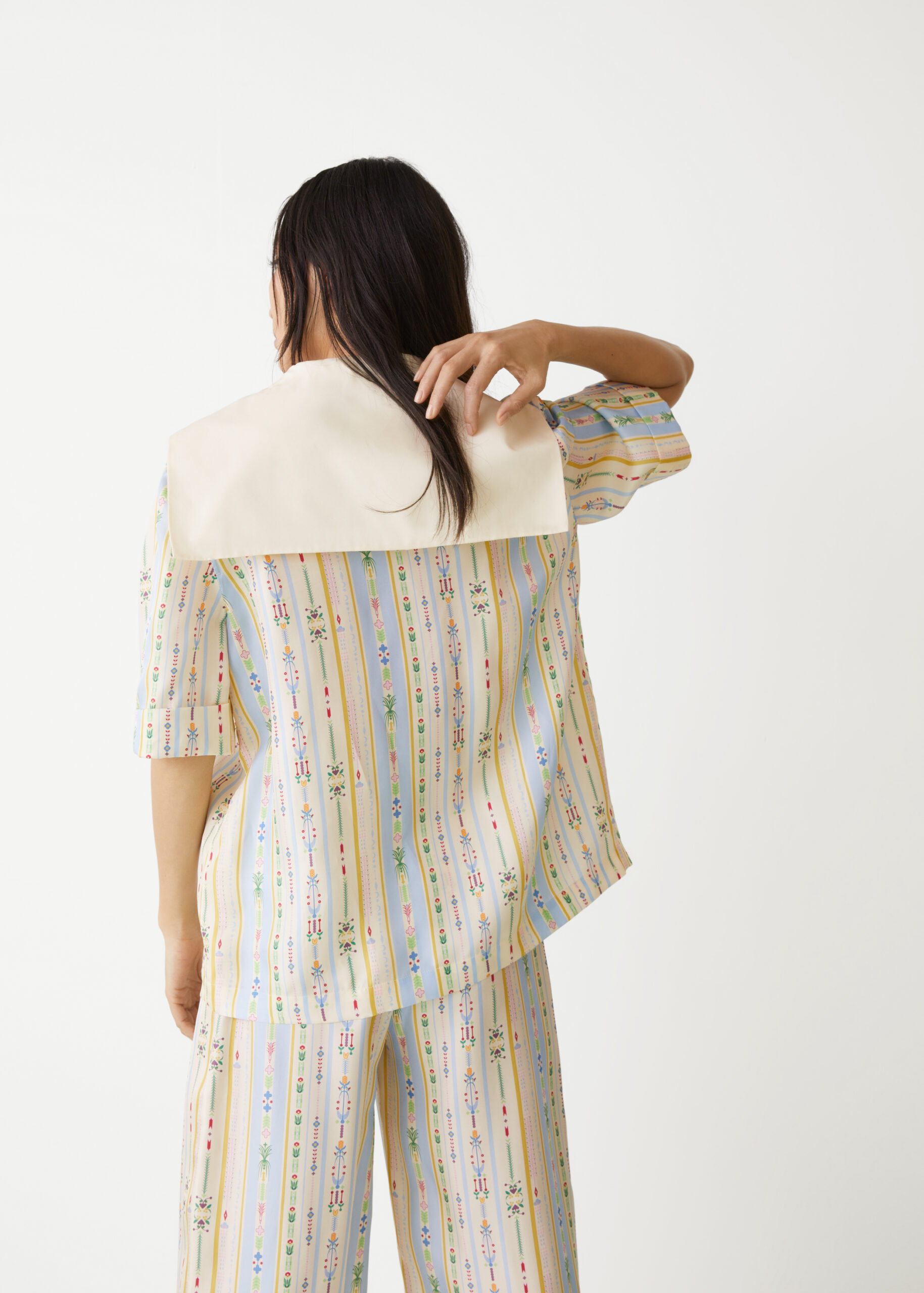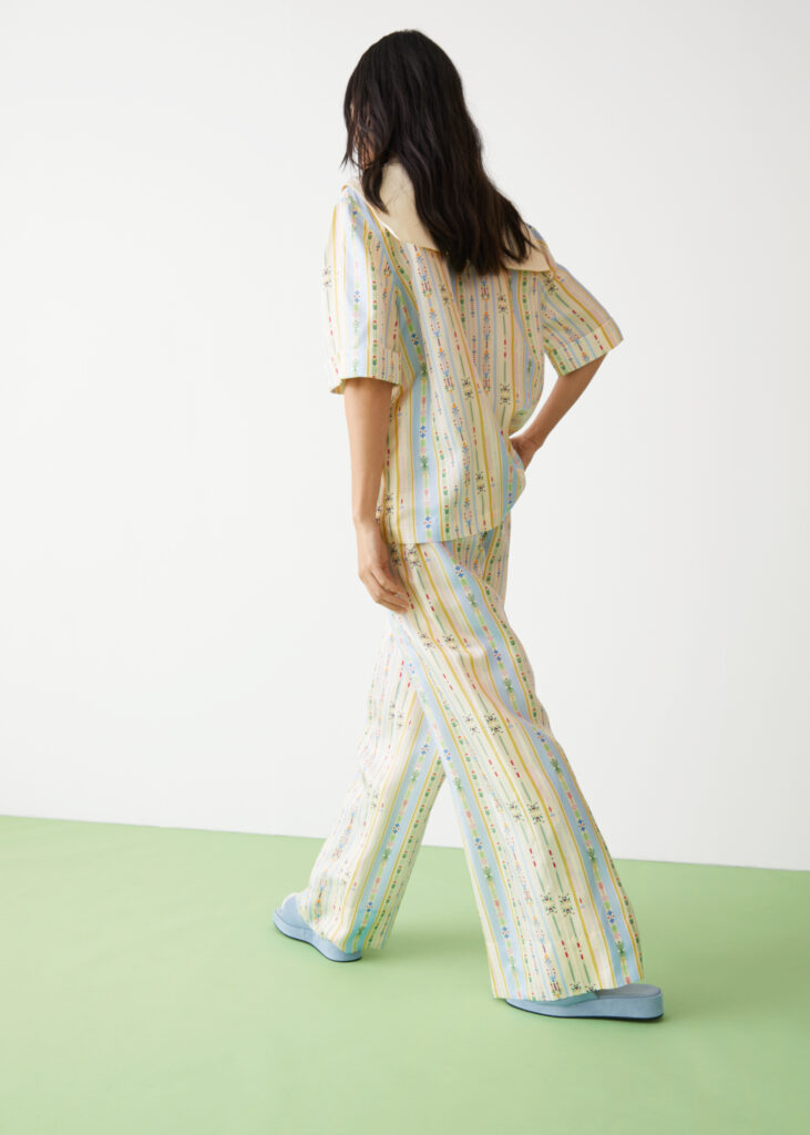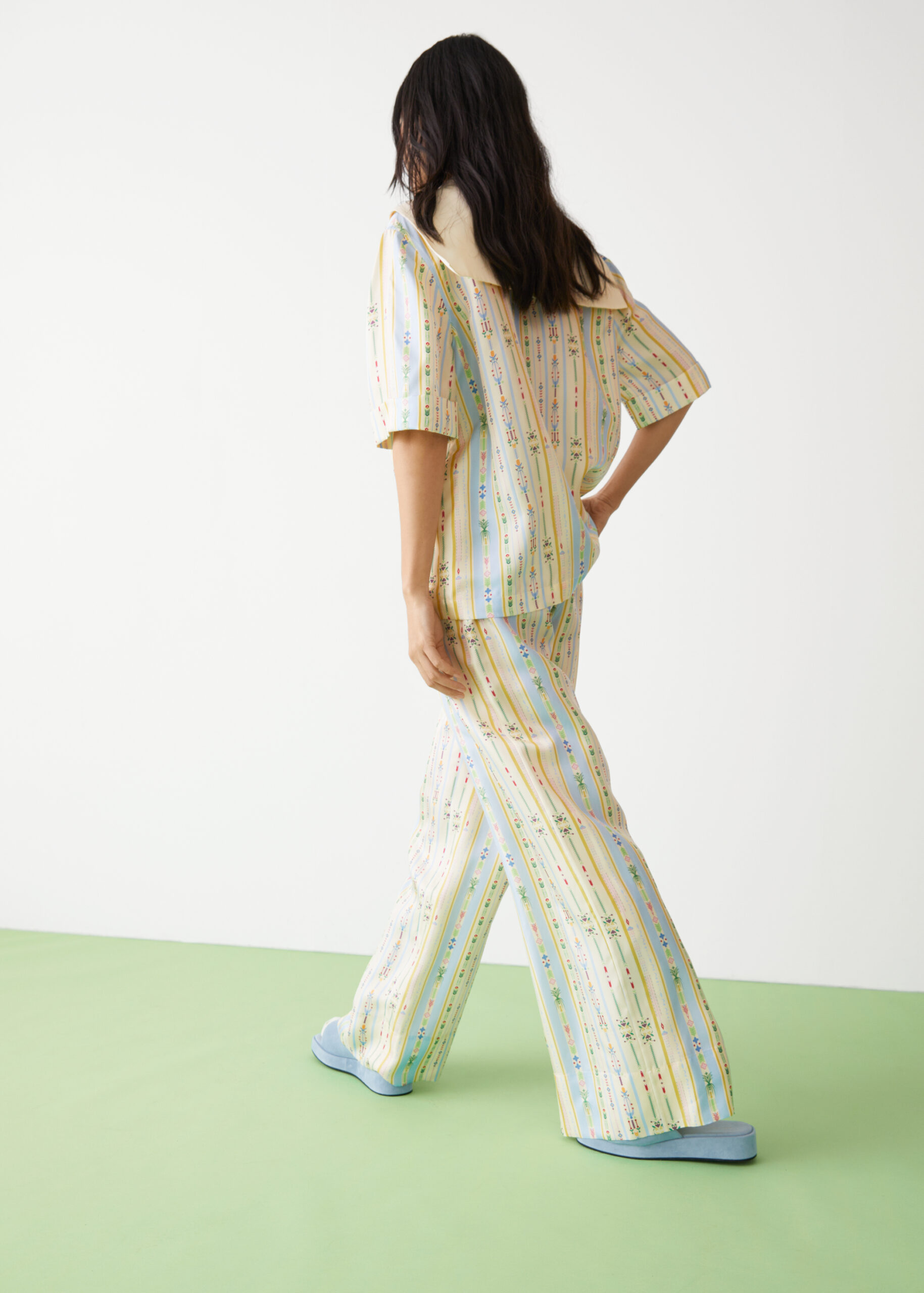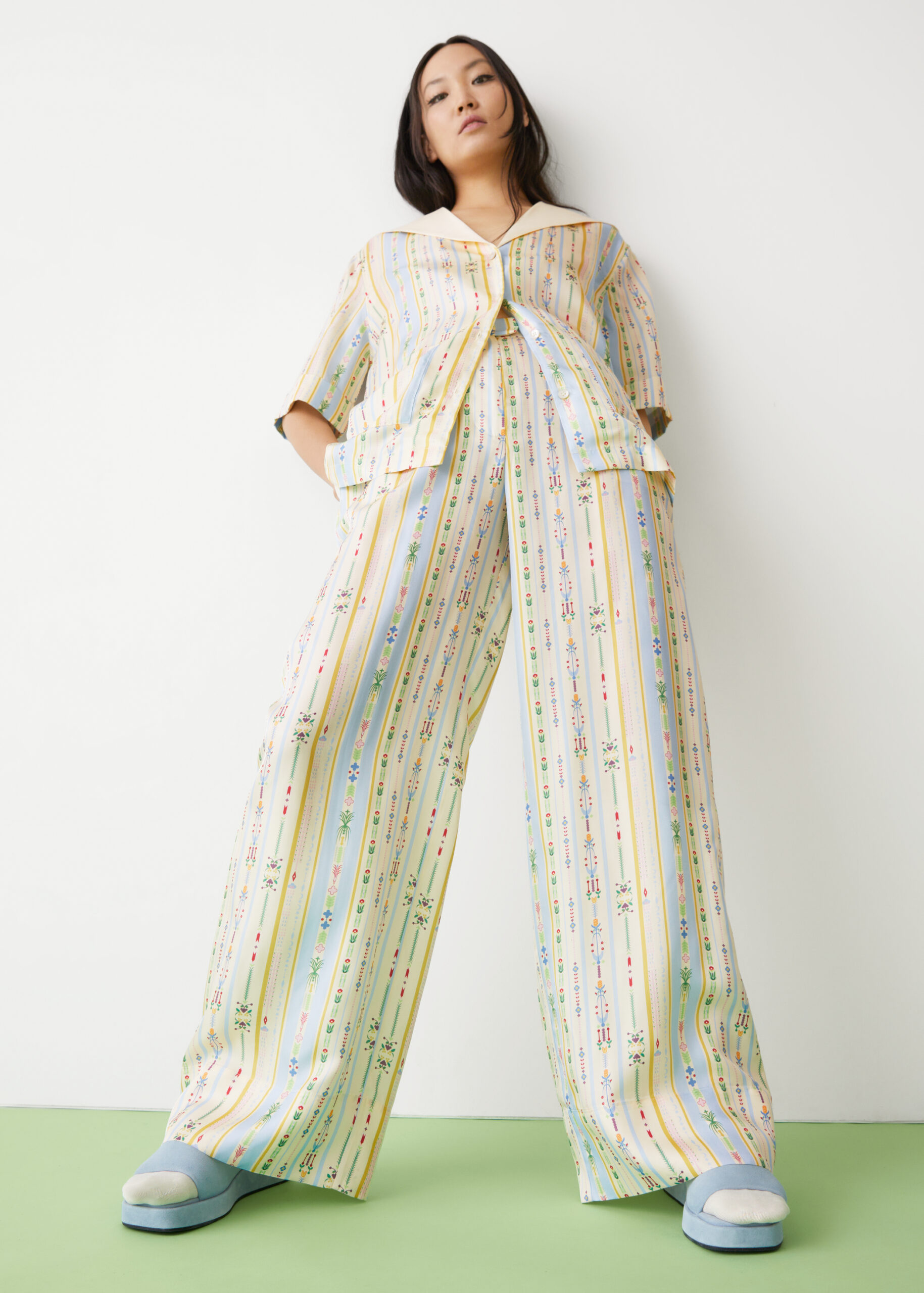“Pour cette co-lab, j’ai revisitée “Moon Gardener”, qui était ma deuxième collection, et je l’ai réinterprétée à travers le vocabulaire de la garde-robe de & Other Stories.”Moon Gardener a commencé avec un scenario d’imagination. J’imaginais que si je pourrais aller sur la lune, j’y ferais planter mon propre jardin, en nostalgie à La Terre . J’ai donc créé des imprimés en imaginant des plantes et jardin dans l’univers. J’ai reflété les formes des feuilles des plantes sur les silhouettes. Comme pour les imprimés, j’ai disposé des plantes sur des rayures classiques, créant ainsi un nouveau type d’imprimé à rayures. Raconte Minju Kim.