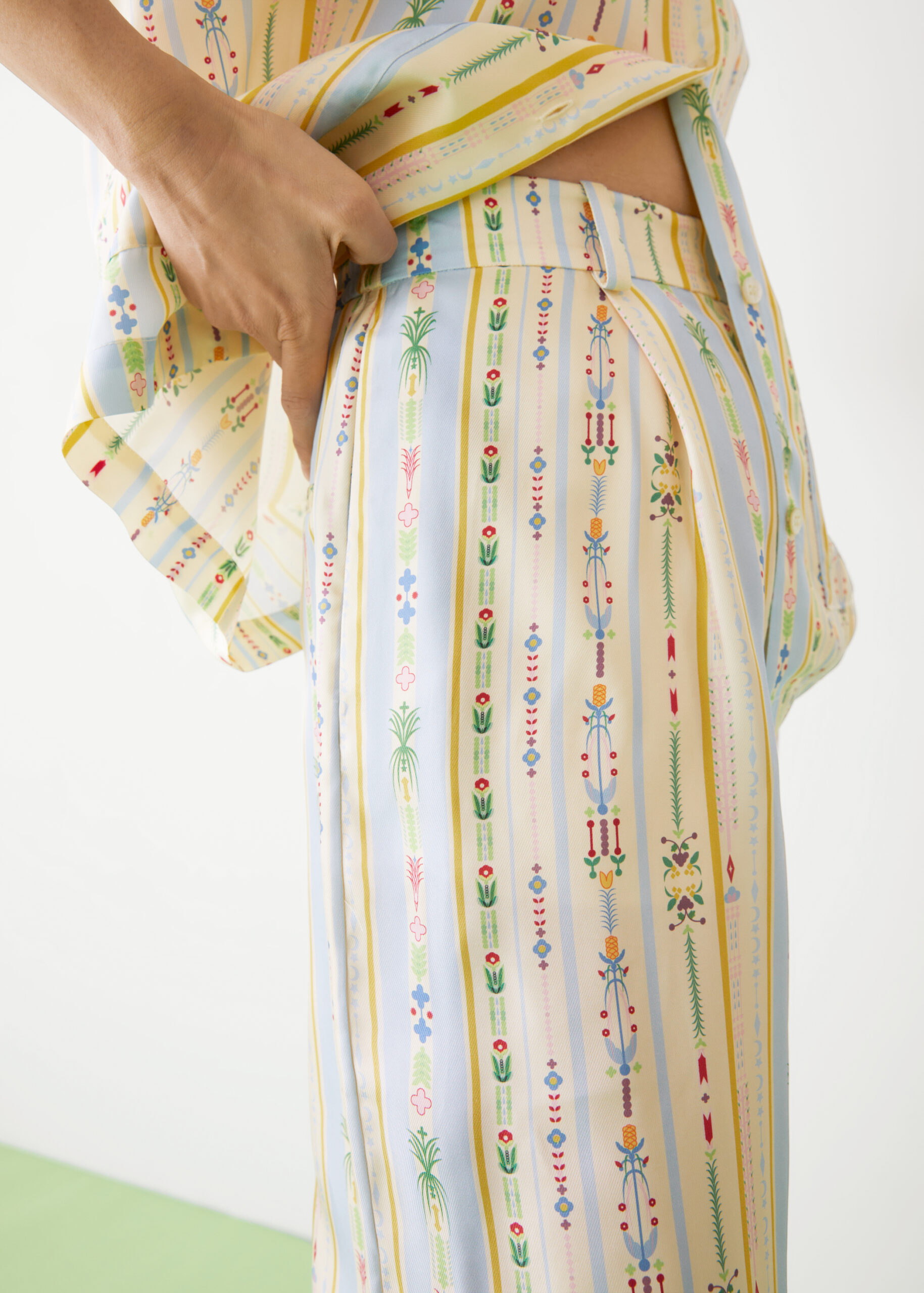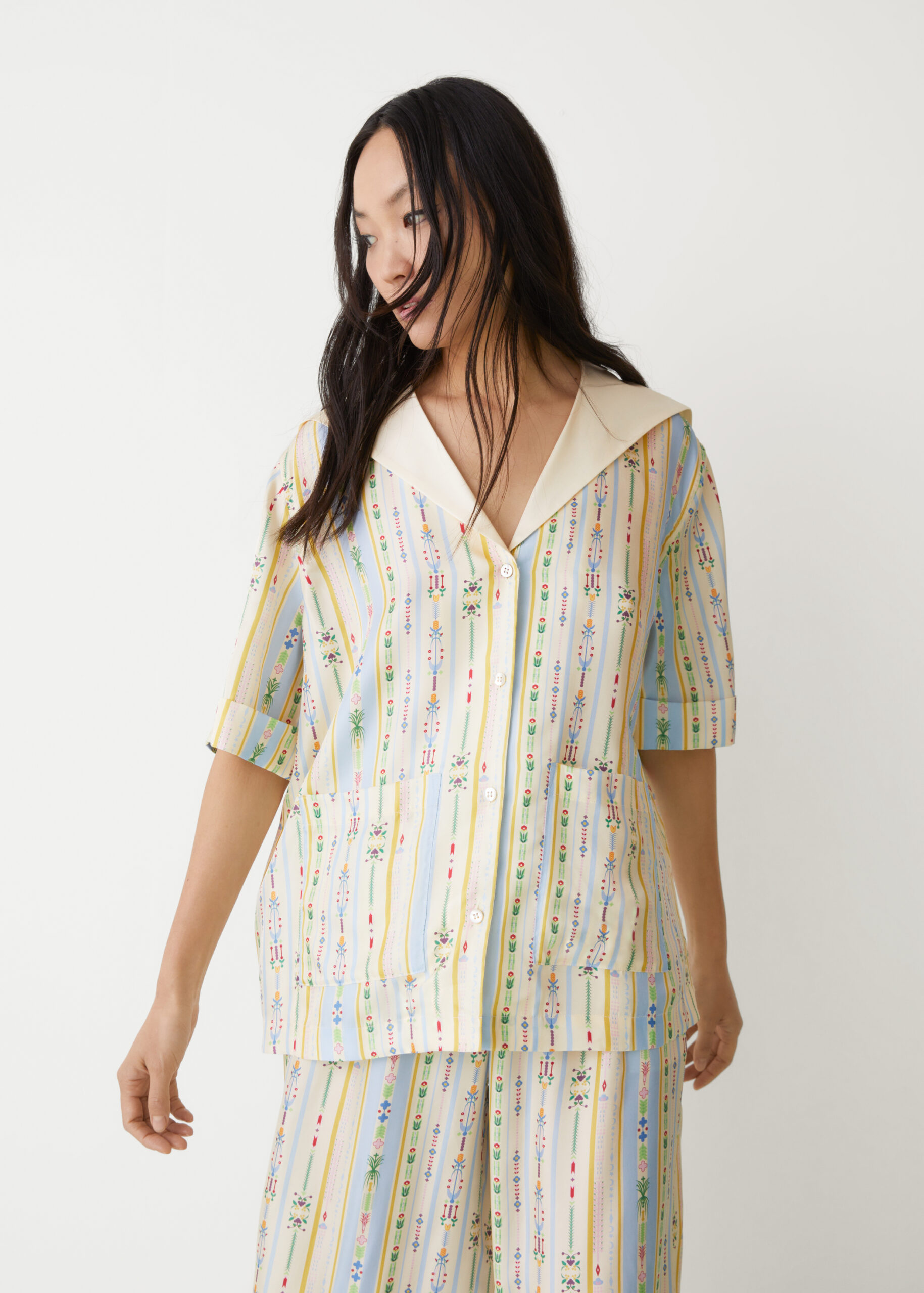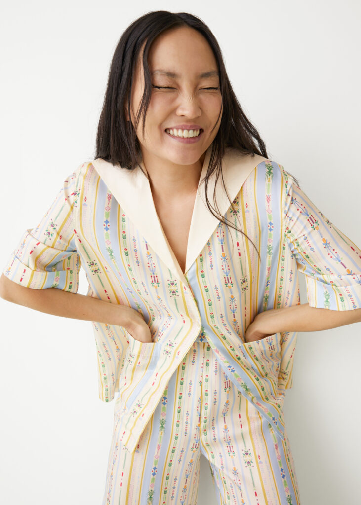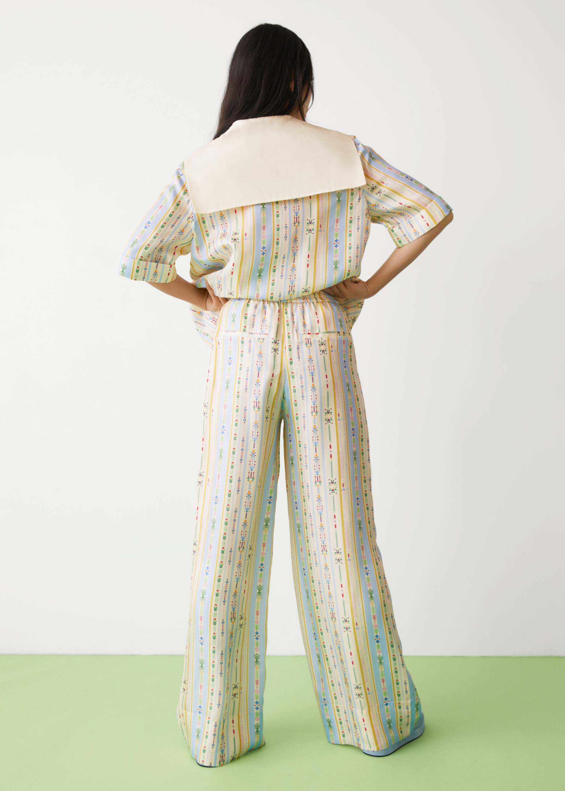 “Pour cette co-lab, j’ai revisitée “Moon Gardener”, qui était ma deuxième collection, et je l’ai réinterprétée à travers le vocabulaire de la garde-robe de & Other Stories.”Moon Gardener a commencé avec un scenario d’imagination. J’imaginais que si je pourrais aller sur la lune, j’y ferais planter mon propre jardin, en nostalgie à La Terre . J’ai donc créé des imprimés en imaginant des plantes et jardin dans l’univers. J’ai reflété les formes des feuilles des plantes sur les silhouettes. Comme pour les imprimés, j’ai disposé des plantes sur des rayures classiques, créant ainsi un nouveau type d’imprimé à rayures. Raconte Minju Kim.