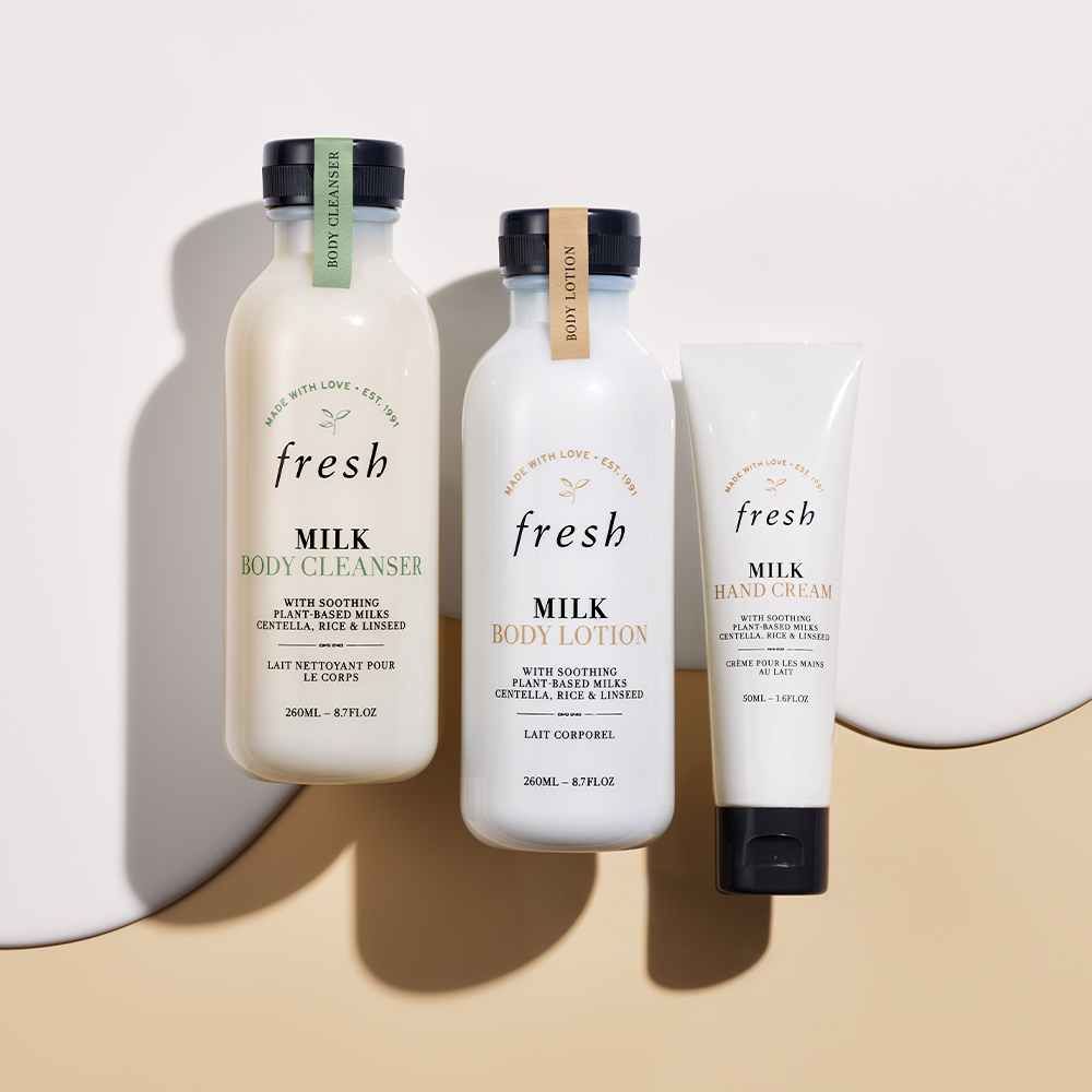 Désaltérez votre peau grâce à la dernière innovation Fresh pour le soin du corps : la collection Milk. Enrichis en laits végétaux exclusifs dérivés de la centella, du riz et des graines de lin, le nettoyant pour le corps, le lait corporel et la crème pour les mains nourrissent, apaisent, hydratent et adoucissent la peau.