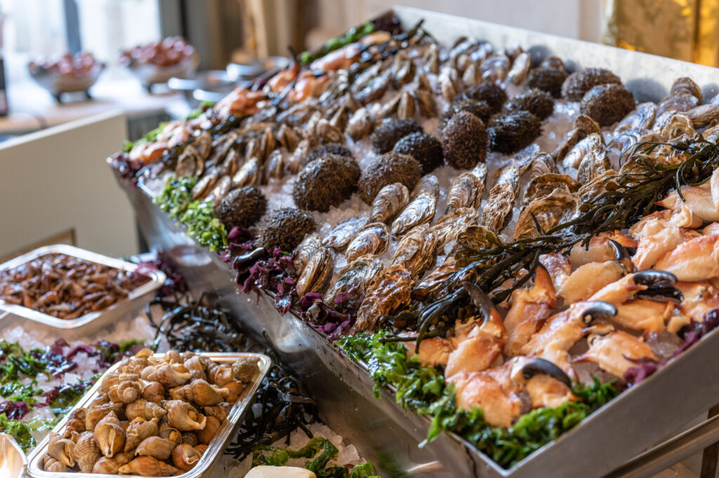 Au banc des nouveautés : Huîtres, pinces de tourteaux, bulots, crevettes grises et roses… Dorénavant le Brunch du Ritz Paris a sa criée. Des îlots permettent aussi de concocter gyozas, foie gras poêlé et Saint-Jacques… du banc à l’assiette. Et les œufs occupent le haut du panier : brouillés, pochés, au plat, bénédictine, les Chefs les introduisent sous toutes ses formes. D’un buffet à l’autre, on prend le large pour la méditerranée : le Liban avec ses mezzés, la Grèce avec ses tzatziki et dolmas, l’Italie avec ses antipasti et sa pasta al dente, l’Espagne avec le Bellota-Bellota… On fait une escale en mer, en naviguant entre saumon fumé labélisé et salade de tourteaux. Un saut en Asie avec les traditionnels dim sum et au Japon avec maki, sashimi, sushi…