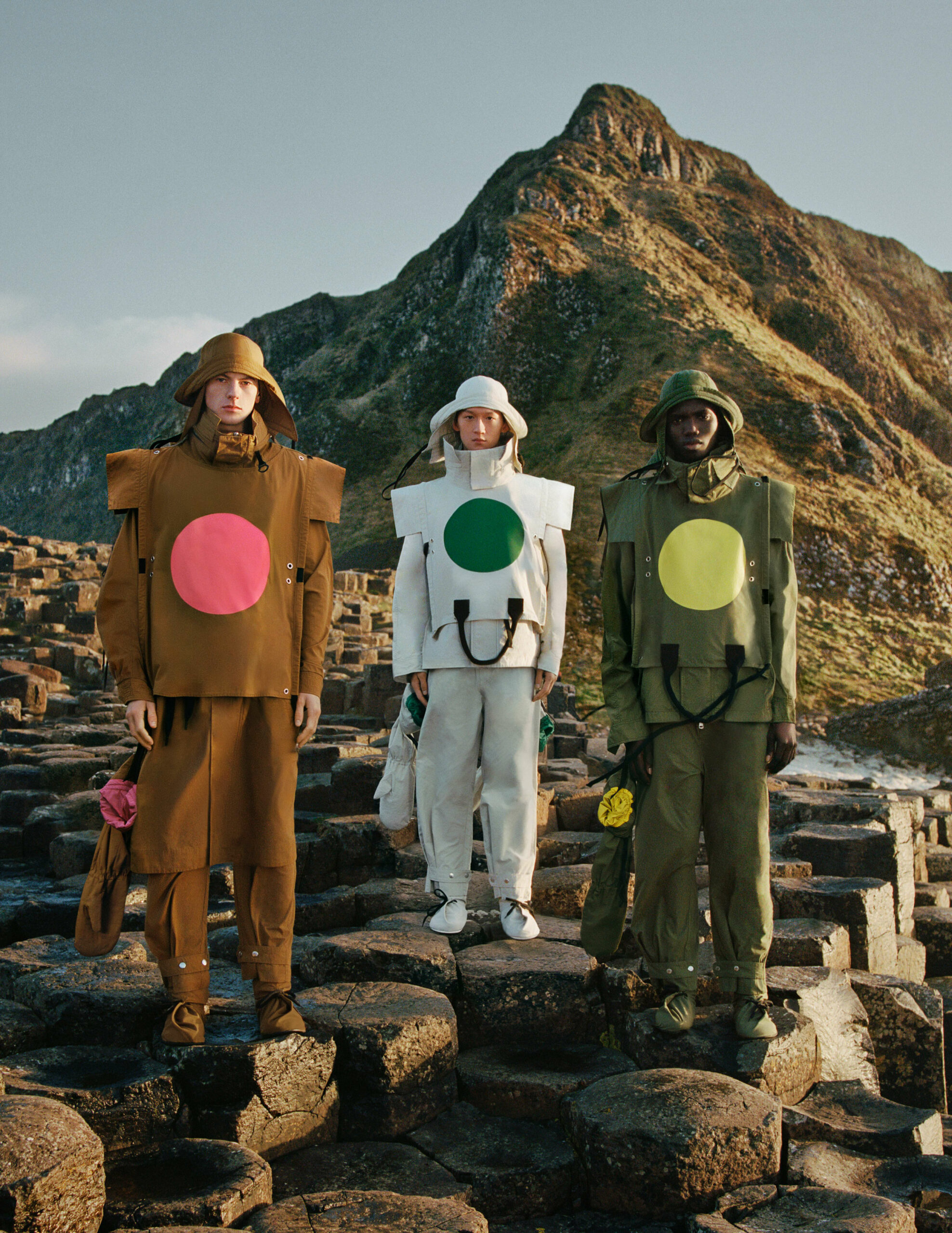 Fonctionnelles, les formes sont emblématiques de Craig Green : parkas, vestes zippées, vestes et gilets matelassés, pantalons amples, sweat-shirts et t-shirts. Les vestes en intarsia zéro déchet, le nylon recyclé pour les vestes légères et les parkas, et le coton biologique des t-shirts soulignent l’accent mis sur la durabilité. Certains éléments sont récurrents, comme le mat et l’opaque, tandis que les cordons de serrage apportent une touche supplémentaire de personnalisation. Poursuivant l’idée de fonctions multiples, le logo 3D sur les vestes inspirées des vêtements de travail comporte un sifflet et les sacs à dos sont pliables. Le choix des tissus est propre à Moncler avec des nylons ripstop et des cotons lavés, dans une palette de nuances naturelles et terreuses avec de l’orange fluo, du bleu ciel, du vert gazon et du jaune citron, ainsi que du bleu et du noir. Les accessoires incluent des bobs, des baskets basses et des sacs à dos compressibles.
