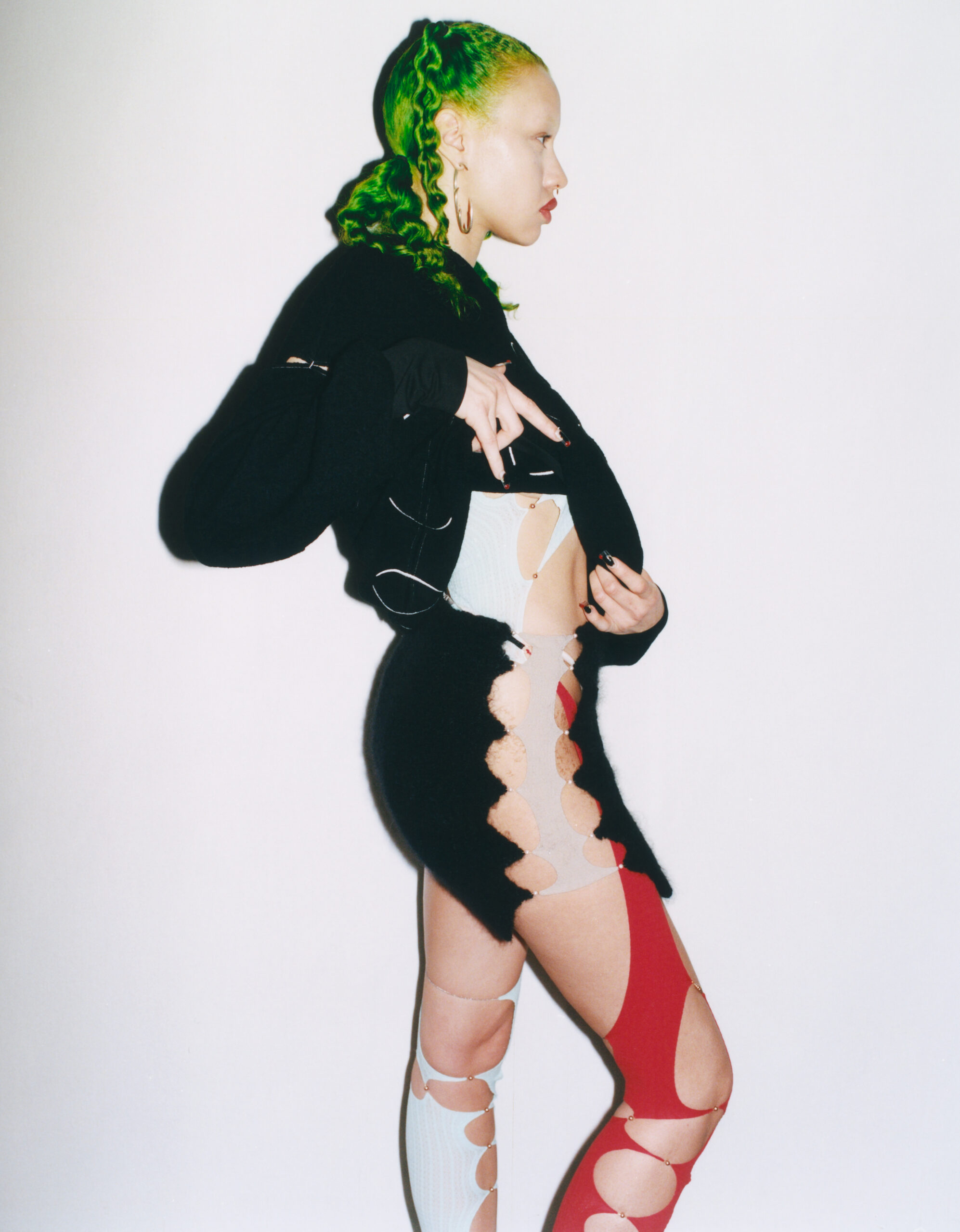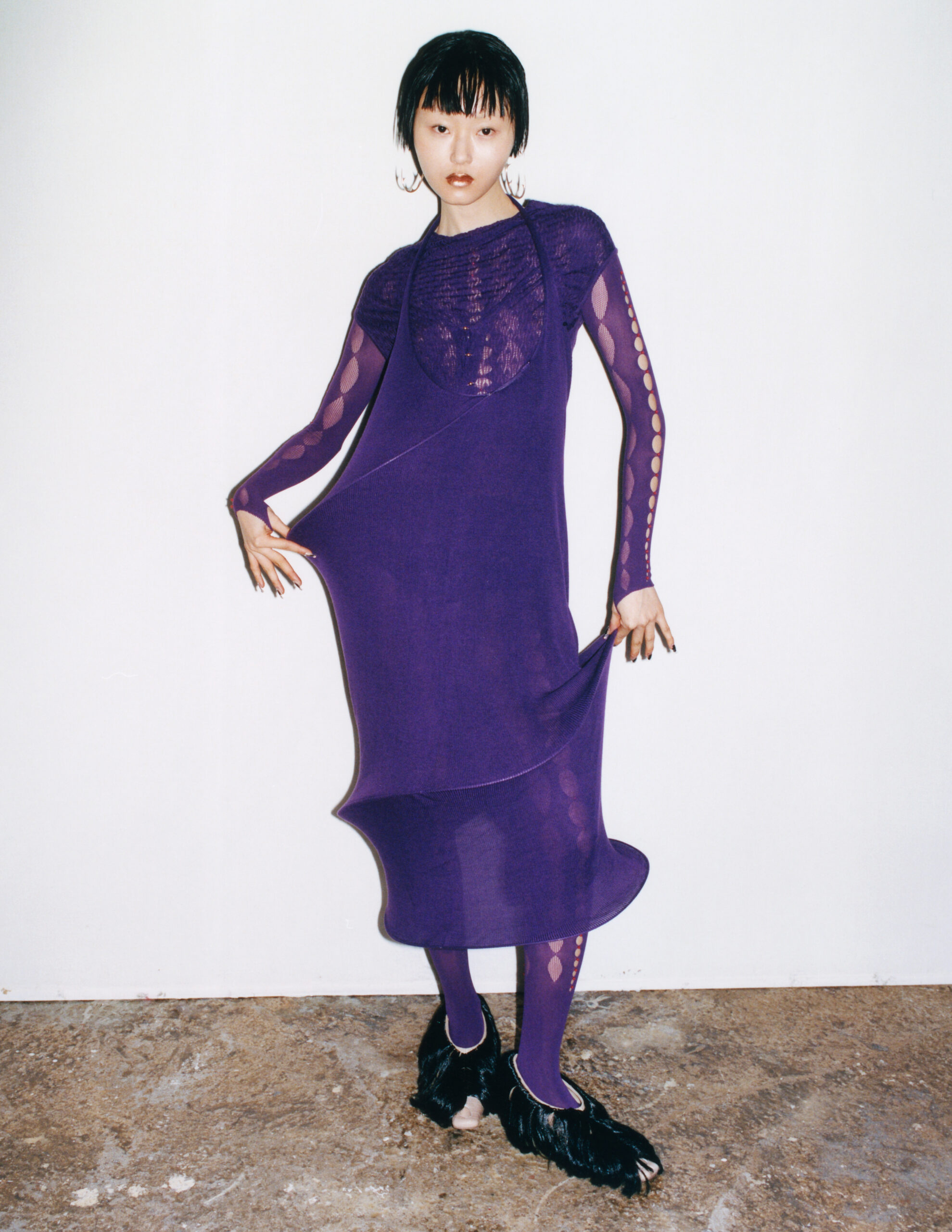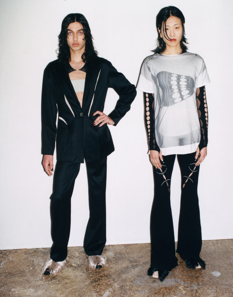 Quelque chose de beaucoup plus nuancé, frais et étoffé est en train de naître. En utilisant des tricots 3D sans couture pour l’ensemble du vêtement et un tissu jacquard en soie avec une texture matelassée, la collection AH22 de RUI repousse non seulement les limites de la forme, de la silhouette et de la surface, mais la recherche de textures éthérées et confortables. RUI embellit les tricots de jauge fine avec un motif délicat. Contrairement à la maille tubulaire traditionnelle utilisée uniquement pour les liserés décoratifs, la robe et le haut en mérinos extra-fin asymétrique violet exploitent pleinement la fonctionnalité du tricotage pour l’ensemble du vêtement, en se basant sur la forme du corps, puis en enroulant les mailles en arête de poisson autour du corps dans des contorsions délicates et flexibles pour une tenue ample et confortable.
