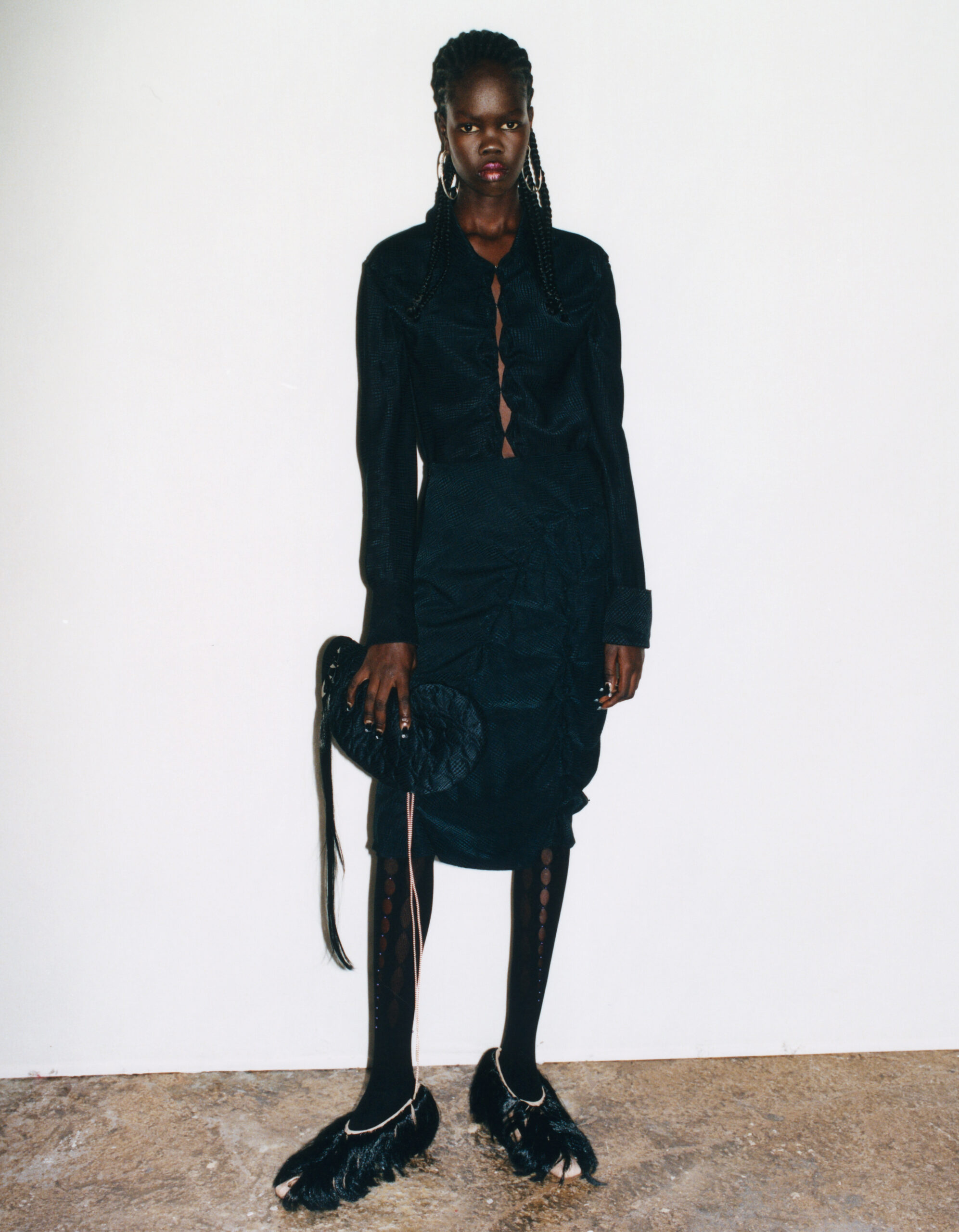 Toujours en mouvement, RUI ne se contente pas deciontinuer à déveloper sa ligne homewear en proposant de nouvelles assiettes en verre et des couvertures en jacquard, mais diversifie également les accessoires, proposant un sac en soie matelassé en forme de noix de cajou, des boucles d’oreilles et des bagues en argent en forme d’épines « C », une broche découpée au laser, une paire de gants en cuir noir, ainsi qu’une paire d’escarpins à découpe frontale, agrémentée de longs cheveux fins. Tous ces éléments renforcent le sentiment de romance tranchante mais douce.