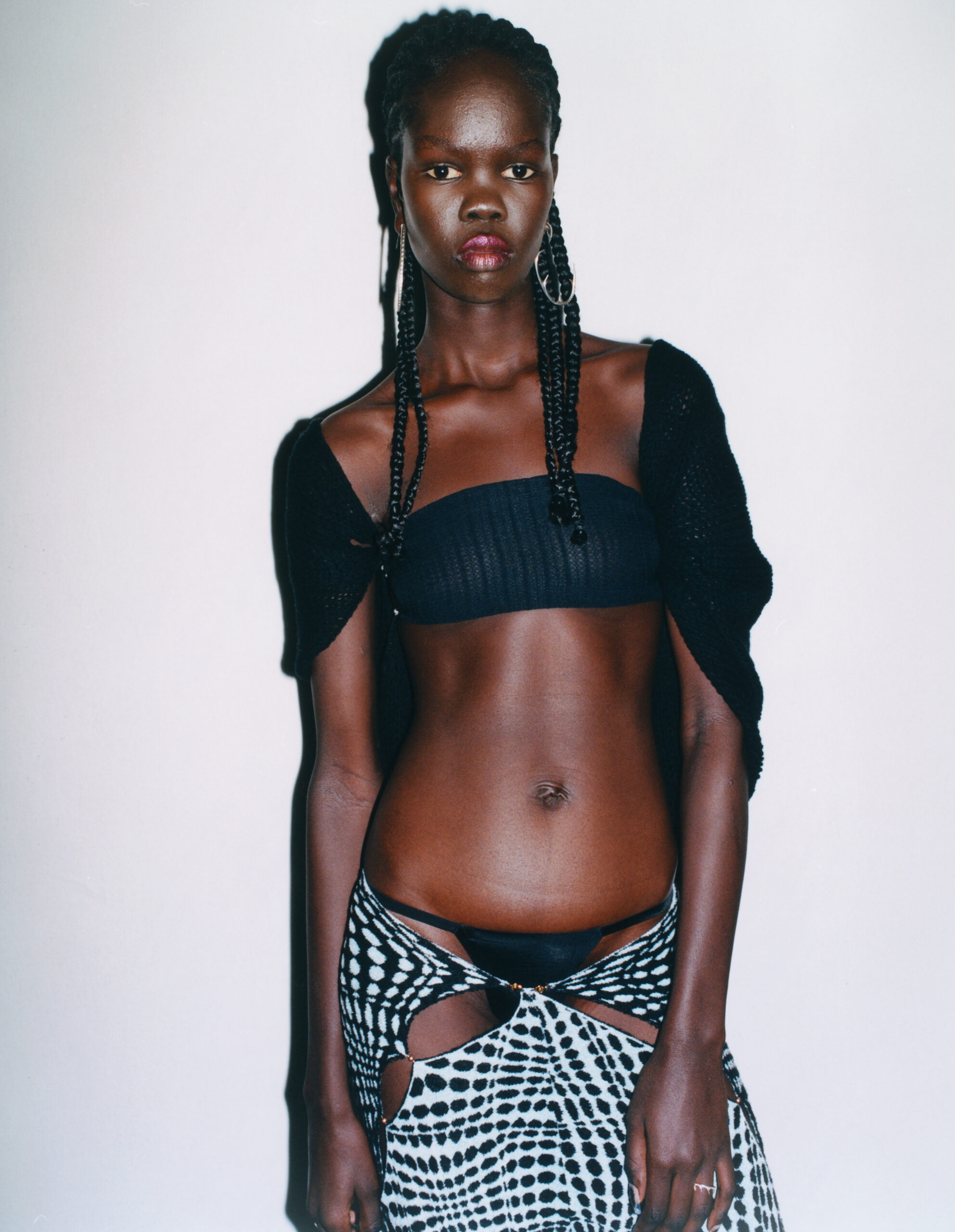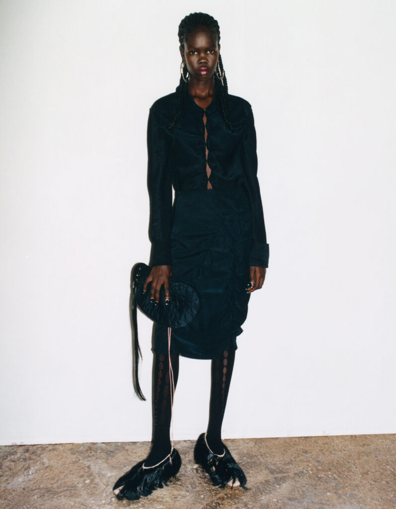 Un design ingénieux se retrouve dans des pièces simples mais intelligentes. Offrant une polyvalence de style, un dos nu cyan peut être porté de manière frontale ou latérale. Un tissu jacquard en forme de point, après avoir été ingénieusement déformé, se transforme en une robe, une jupe ou une écharpe tubulaire, comme le ruban de Möbius. Si l’on regarde de plus près ces détails qui peuvent passer inaperçus, il y a beaucoup à décortiquer : un chapeau merlot aplati comme un cercle en deux dimensions semble relié à des châtaignes d’eau craquelées après avoir été déplié ; la robe longue en pointelle tricotée présente des plumes de paon diaphanes ; le pantalon et la robe plissés allochtones s’enroulent en spirale comme des coquillages, et le tissu de laine peignée apporte brillance et douceur aux costumes. Le premier T-Shirt est né d’une interprétation humoristique de la pièce phare de RUI prise en photo, qui fait écho aux pièces plus streetwear développées cette saison telles que le sweat à capuche en laine brodée et le pantalon évasé. La technique de perlage caractéristique de RUI est récurrente dans les pièces en crochet faites à la main, tandis que la minijupe pelucheuse extrêmement agréable pour la peau et le top tube forment un espace sûr où tout le monde peut se poser, tout en procurant une sensation naturelle d’habiter.