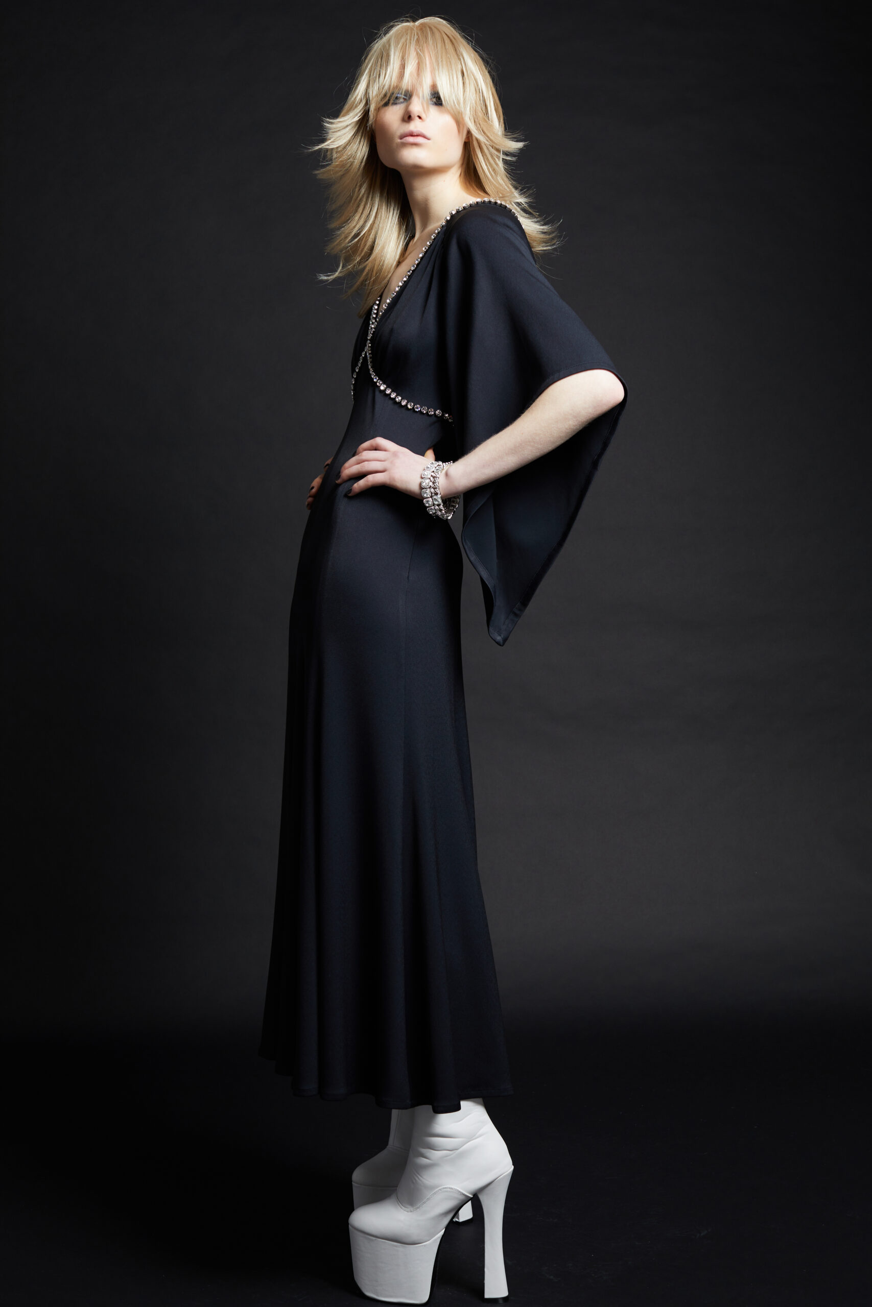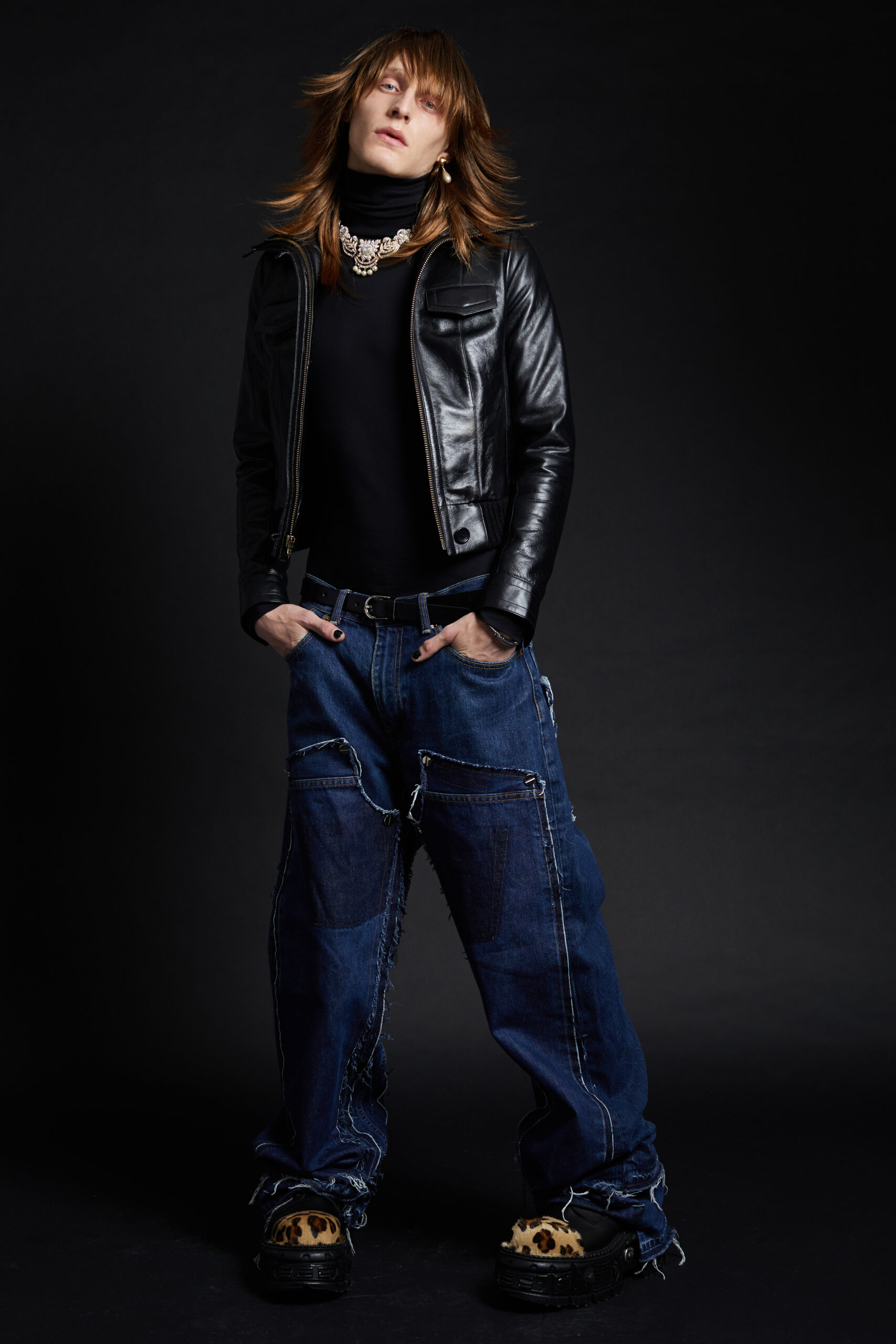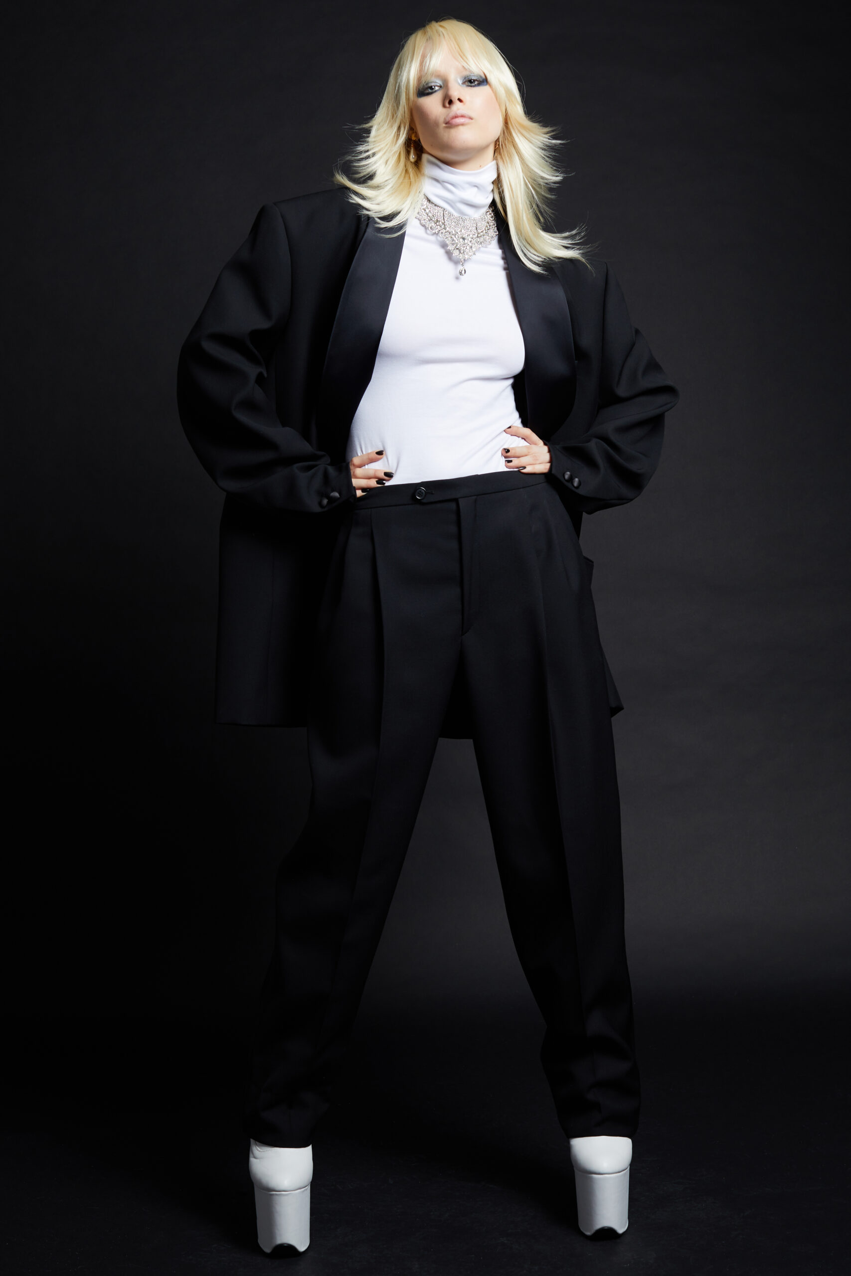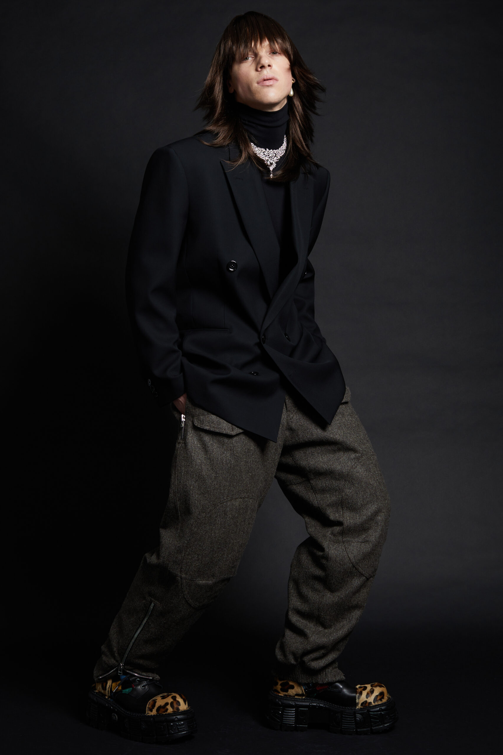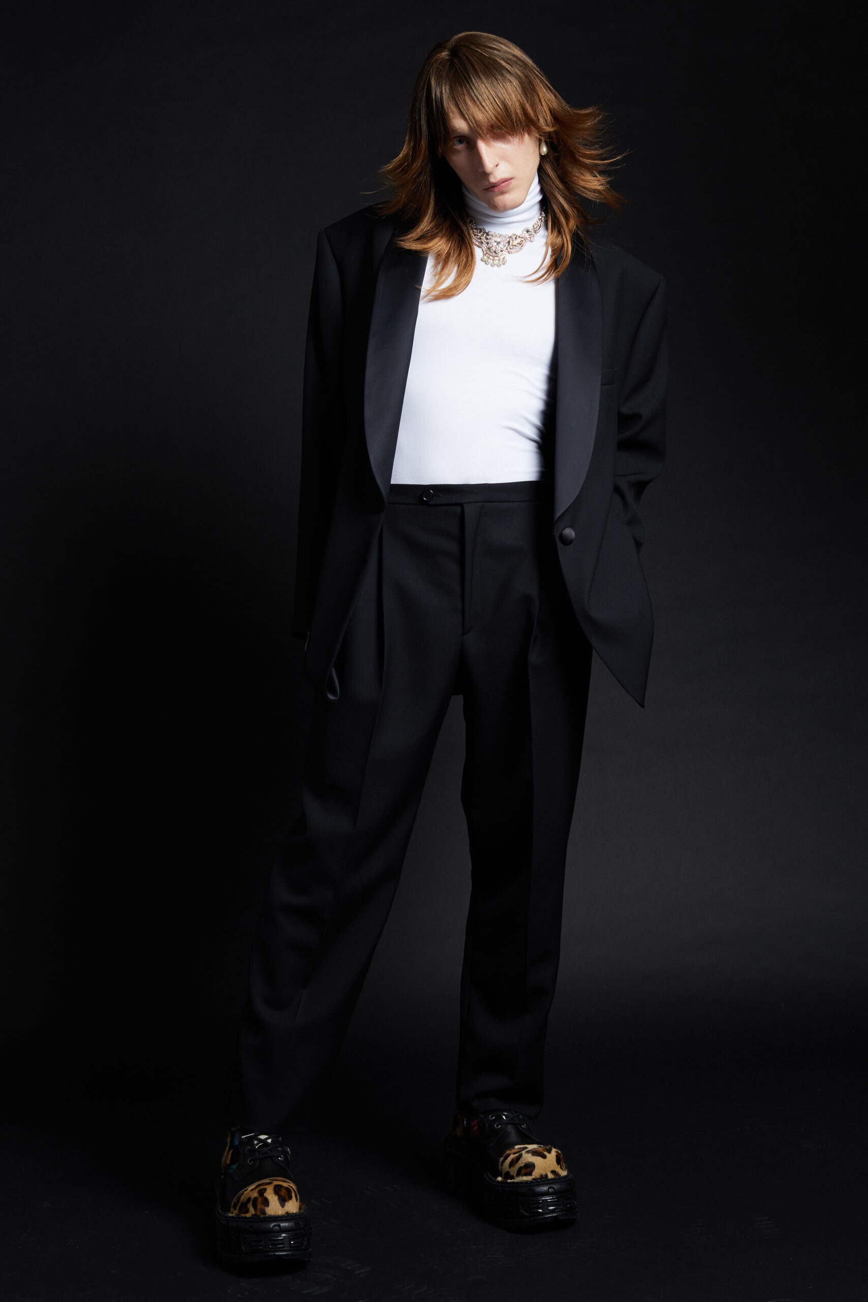The collection takes life as a series of portraits of cool kids, the «usual suspects» of the Maison, presented here almost like a gallery of clones. The silhouettes are sharp and precise, deceptively simple, set against a backdrop of skintight black or white turtlenecks that seem to convert the models into shop-display mannequins. Identical wigs for both men and women unify and mask personalities, a social commentary on the emptiness of an ever more standardized society. Against this stark backdrop, the pieces of the collection embody the soul and allow each participant to tell their story and establish their individual identity.