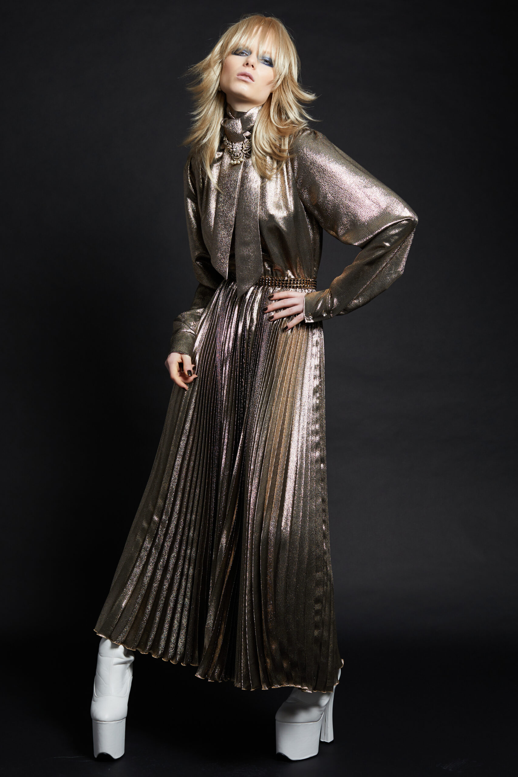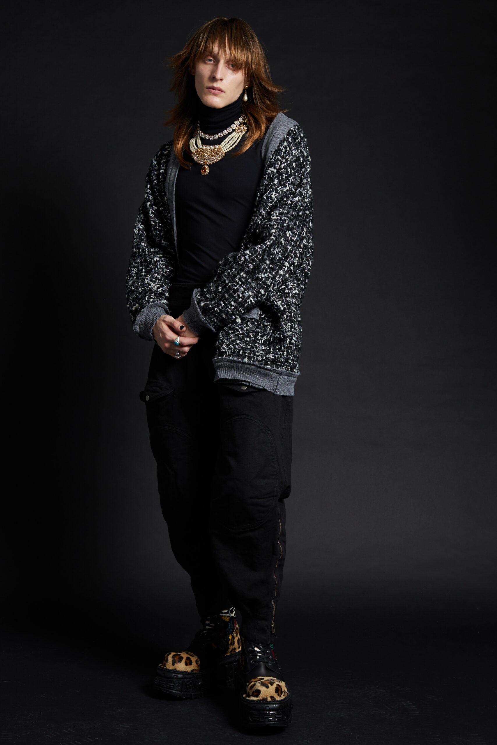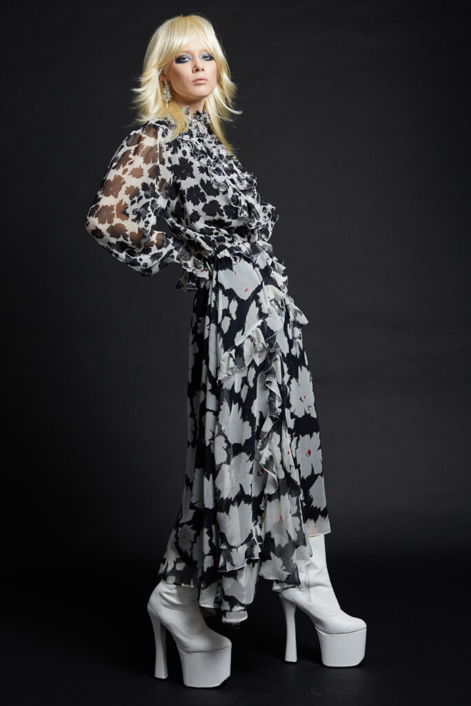 Of course, the Maison’s codes and icons are present and accounted for. Shearlings (often reversible) are back in the form of luxurious hoodies with leopard printed fur. The lavaliere adorns a long lurex dress with a sunburst-pleated skirt. A play on patterns animates a dress where the print of the bodice is reversed and enlarged on the skirt. Tweed, as always, is reimagined in new ways: as a sophisticated hunting jacket or as an unexpected cardigan. A modern couture suit takes the form of a pencil skirt and a small blazer that recalls a denim jacket. A street style version includes an oversized jacket in tweed lurex, for a 90s hip-hop vibe.