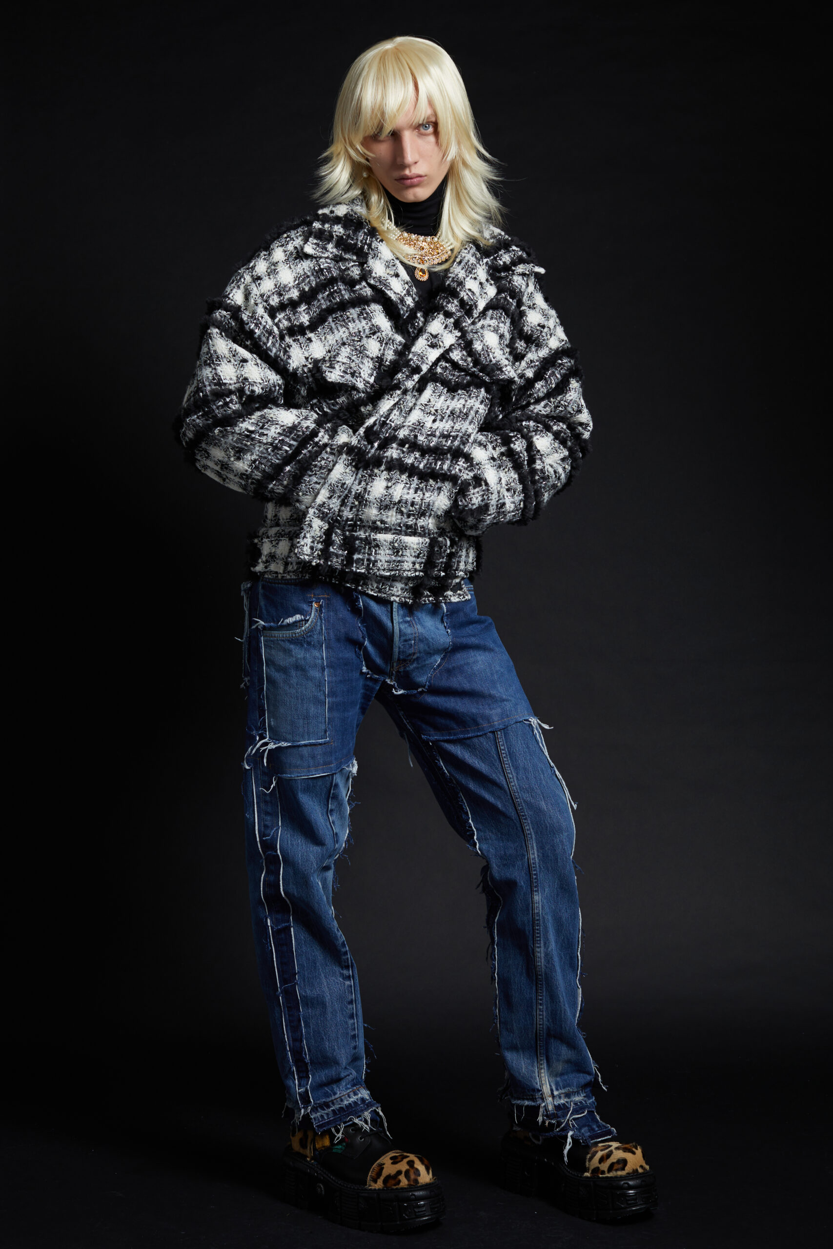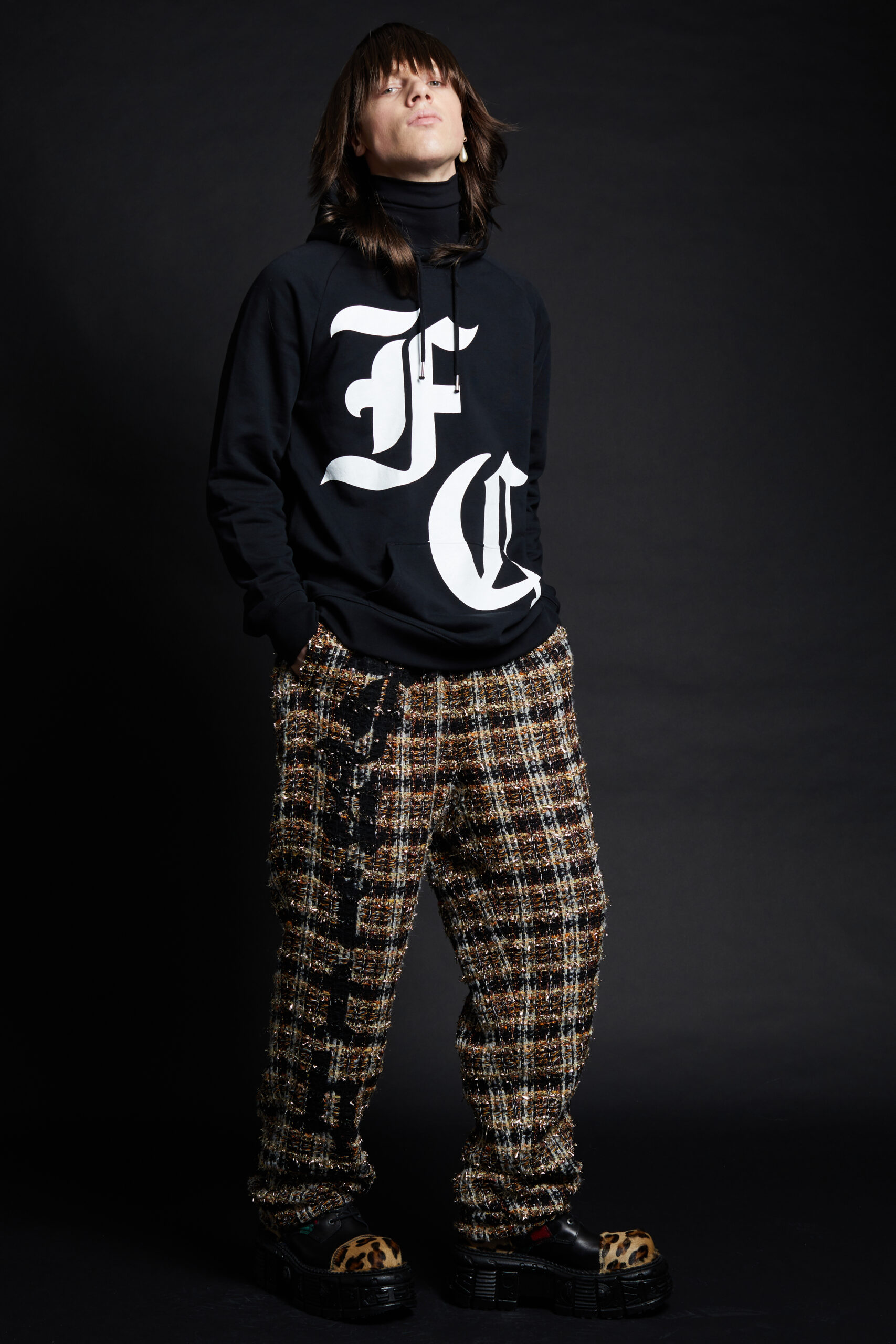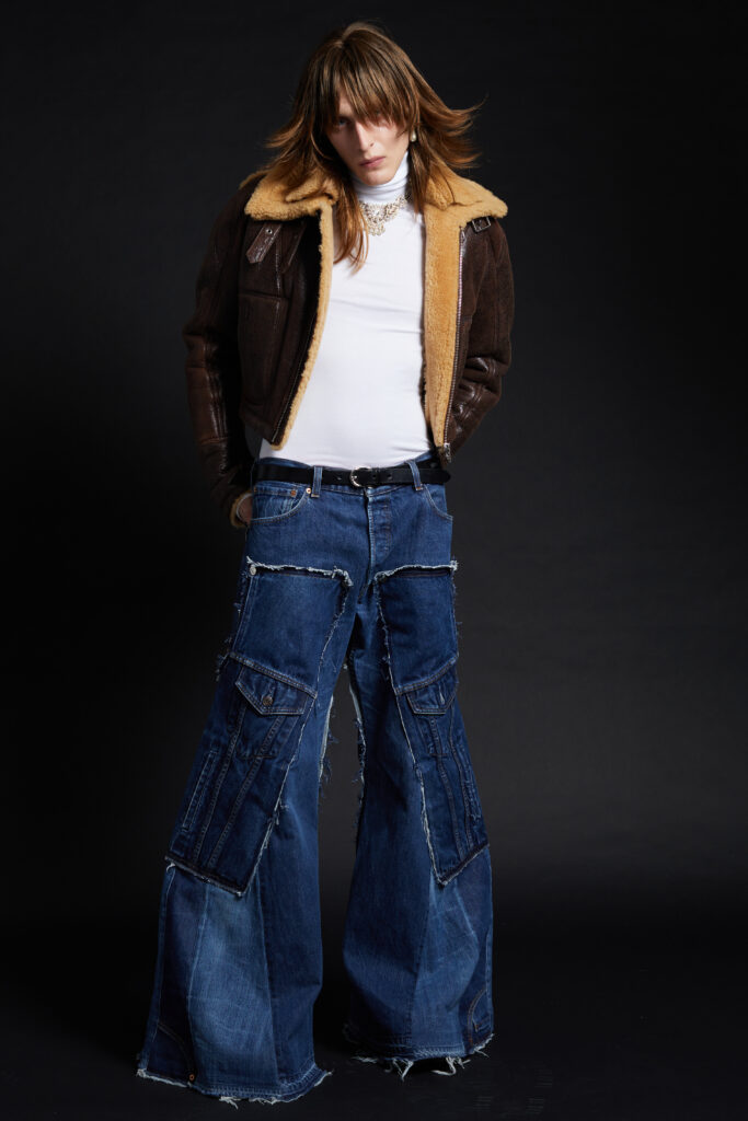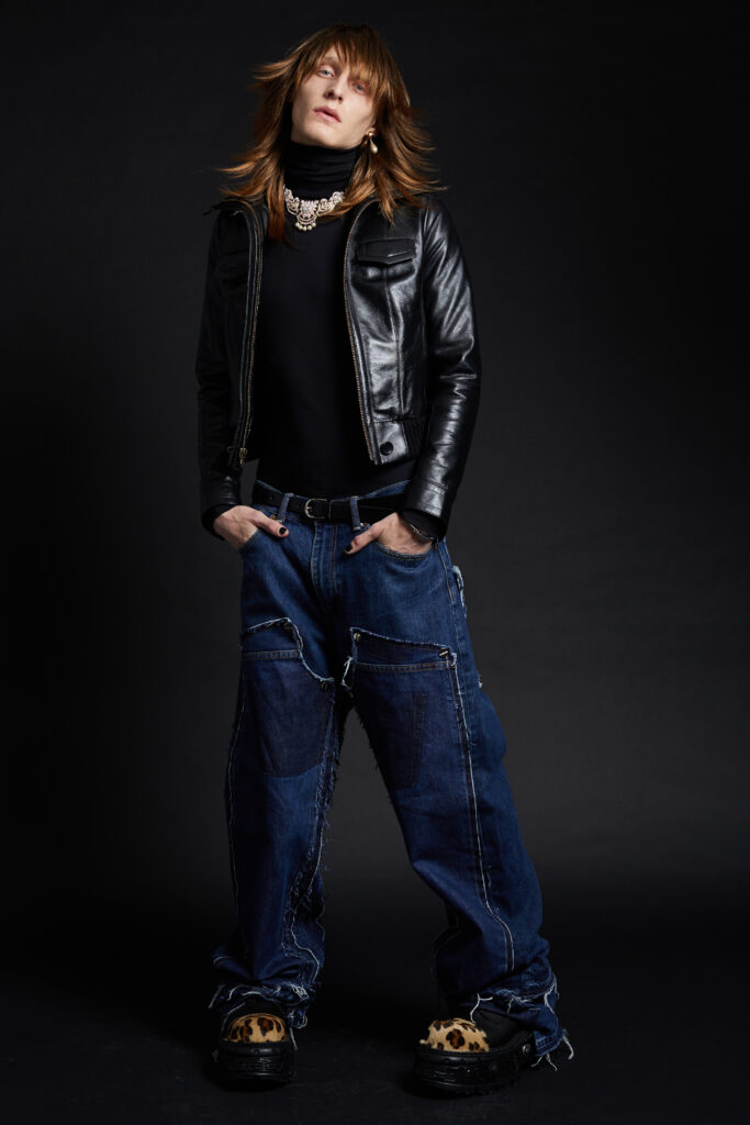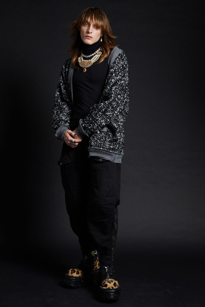 For Fall-Winter 2022 the collective unearthed the Maison’s original logotype: half Gothic, half bling, the embodiment of a «too much is never enough» attitude straight out of the 2000s, the era that gave birth to the brand. The artist «8», a long-time collaborator, was given carte blanche for its reincarnation. His updated logotypes as well as a brand new logoform he created are omnipresent this season in a diversity of formats and volumes. We find them adorning a revisited 50s style women’s tweed suit, screened on the back of a hooded micro bomber, embellishing the leg of a pair of jeans, running all the way down to the heels of the shoes.