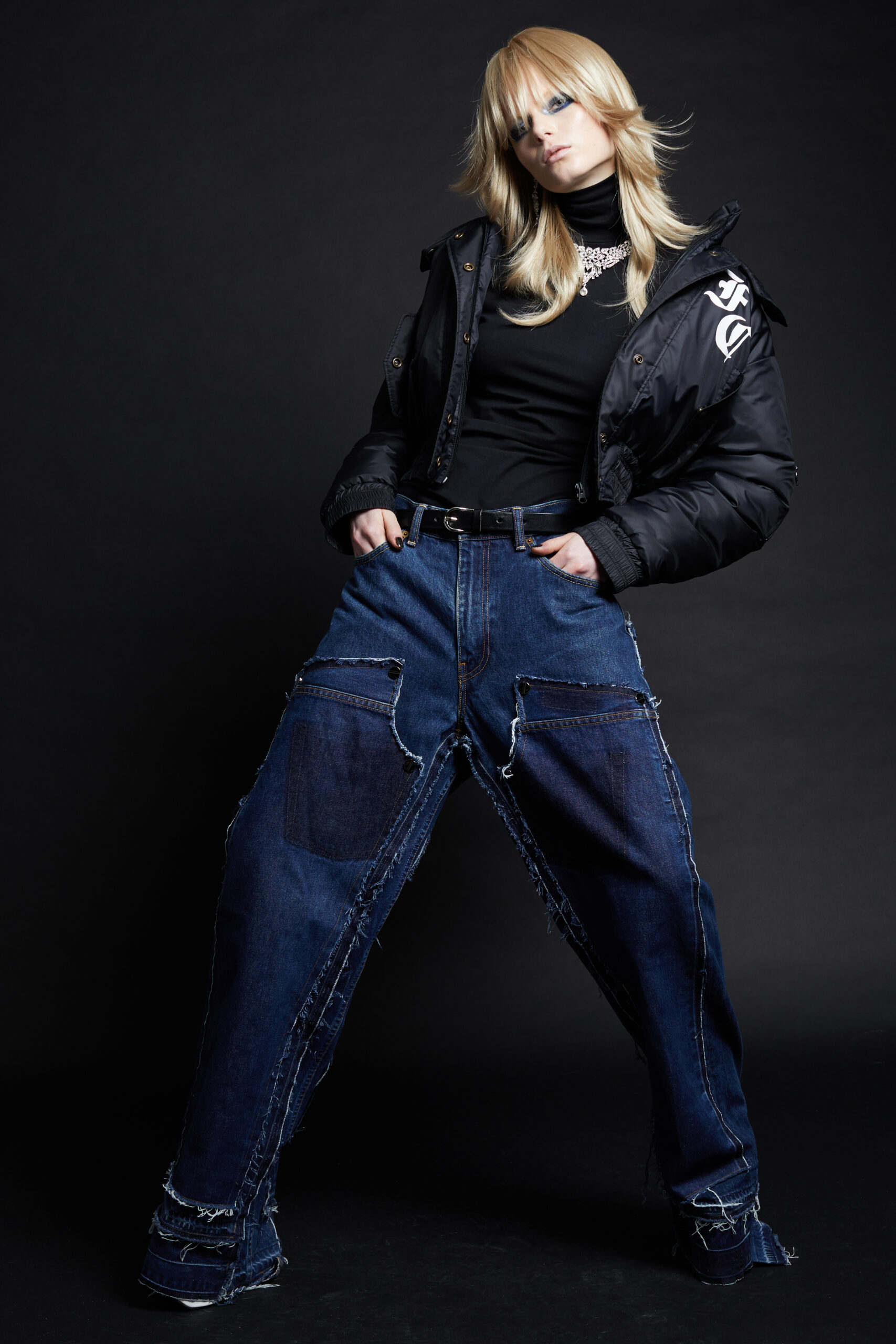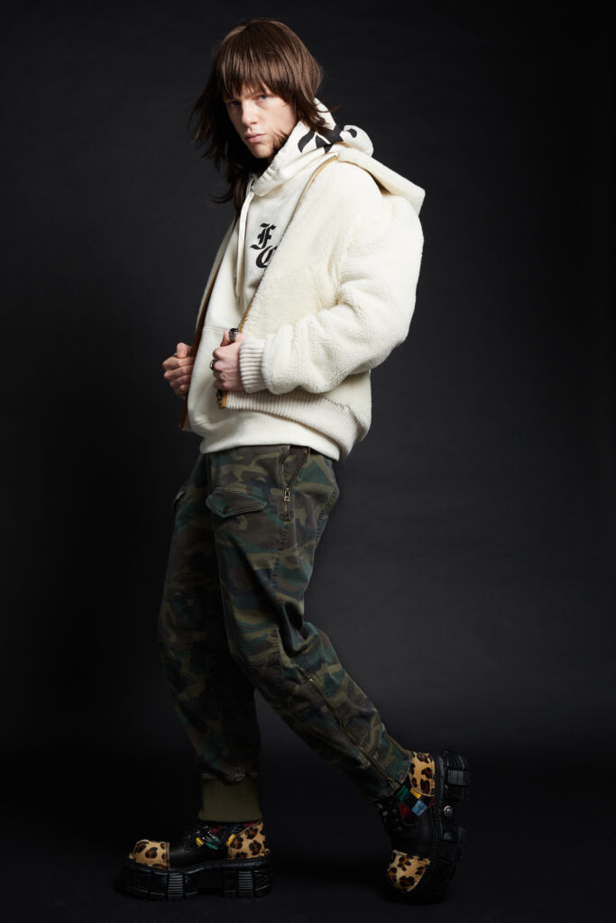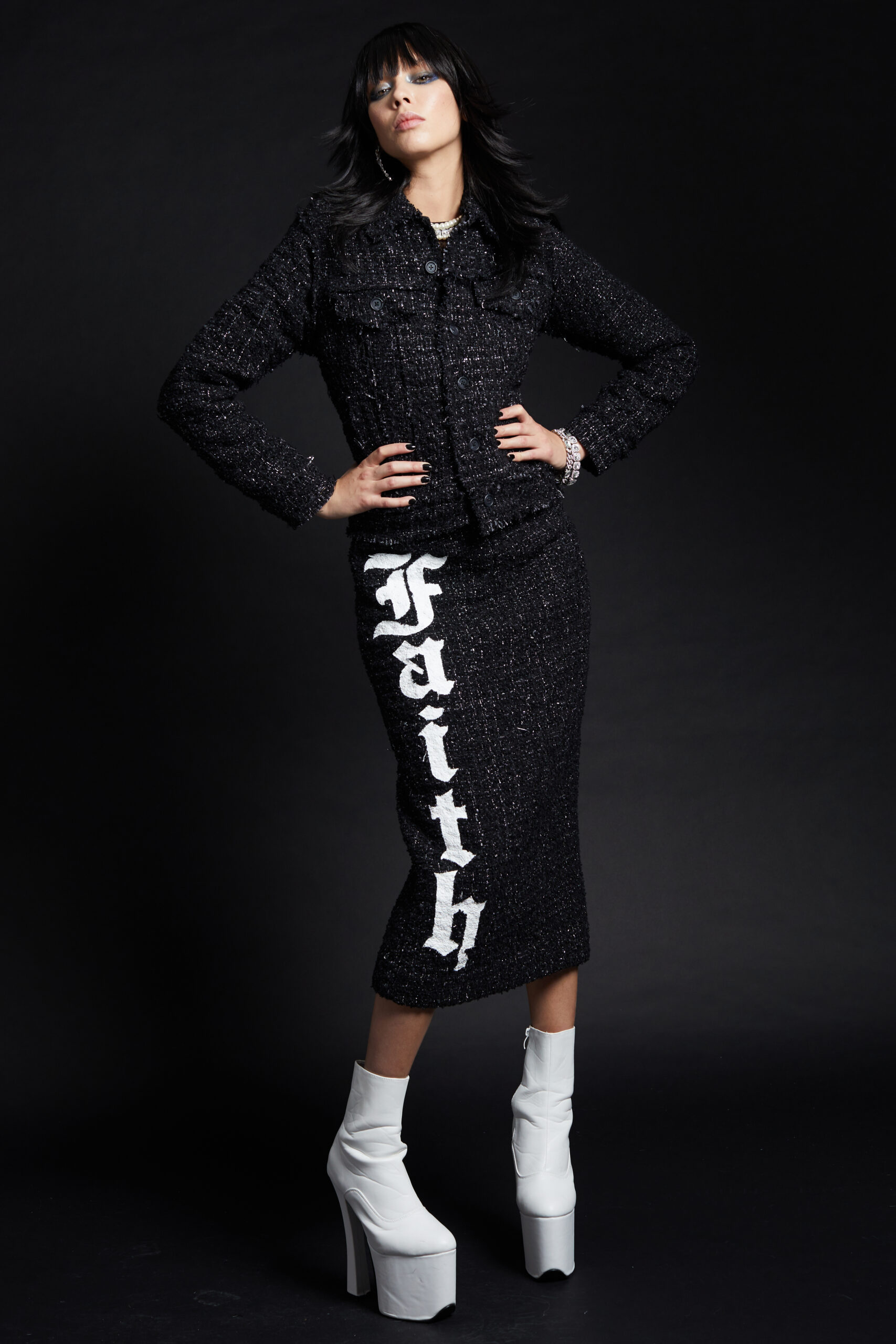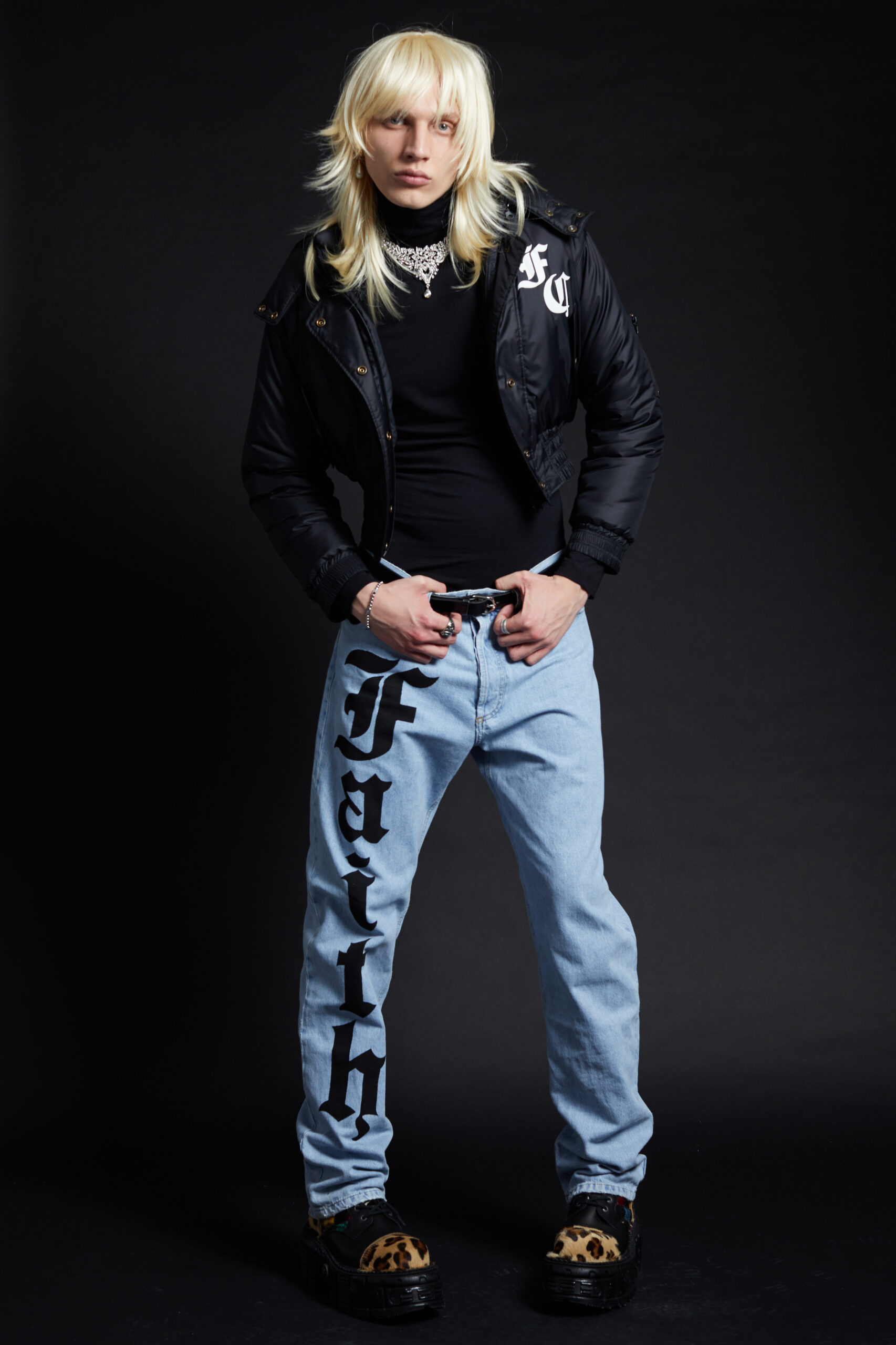 For Fall-Winter 2022 the collective unearthed the Maison’s original logotype: half Gothic, half bling, the embodiment of a «too much is never enough» attitude straight out of the 2000s, the era that gave birth to the brand. The artist «8», a long-time collaborator, was given carte blanche for its reincarnation. His updated logotypes as well as a brand new logoform he created are omnipresent this season in a diversity of formats and volumes. We find them adorning a revisited 50s style women’s tweed suit, screened on the back of a hooded micro bomber, embellishing the leg of a pair of jeans, running all the way down to the heels of the shoes.