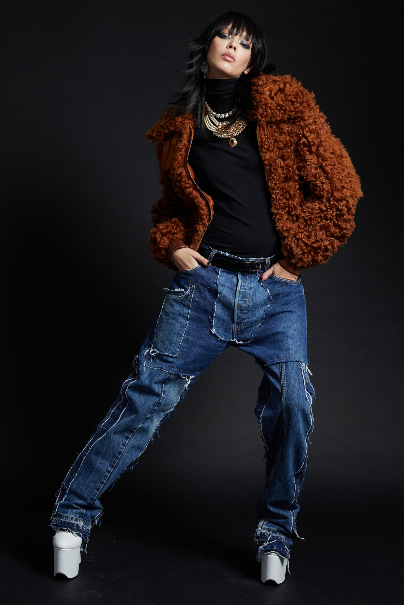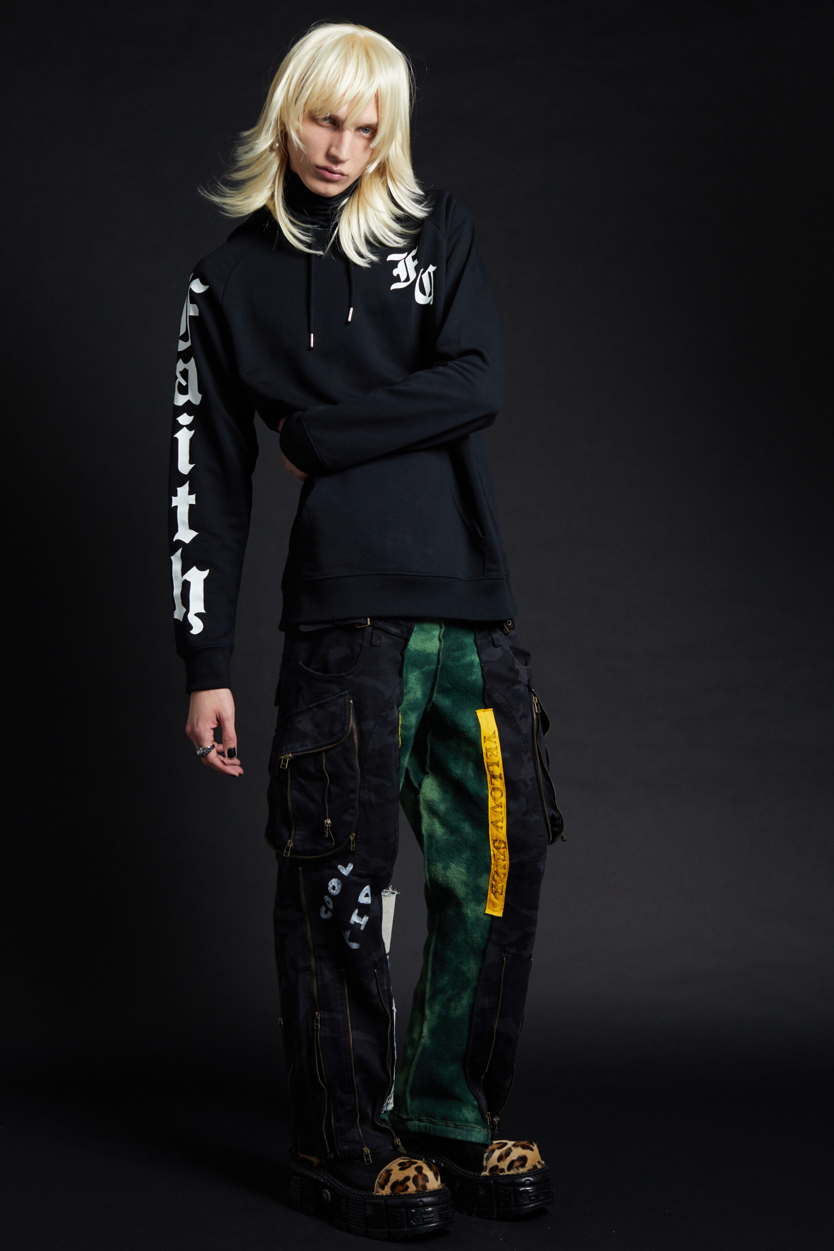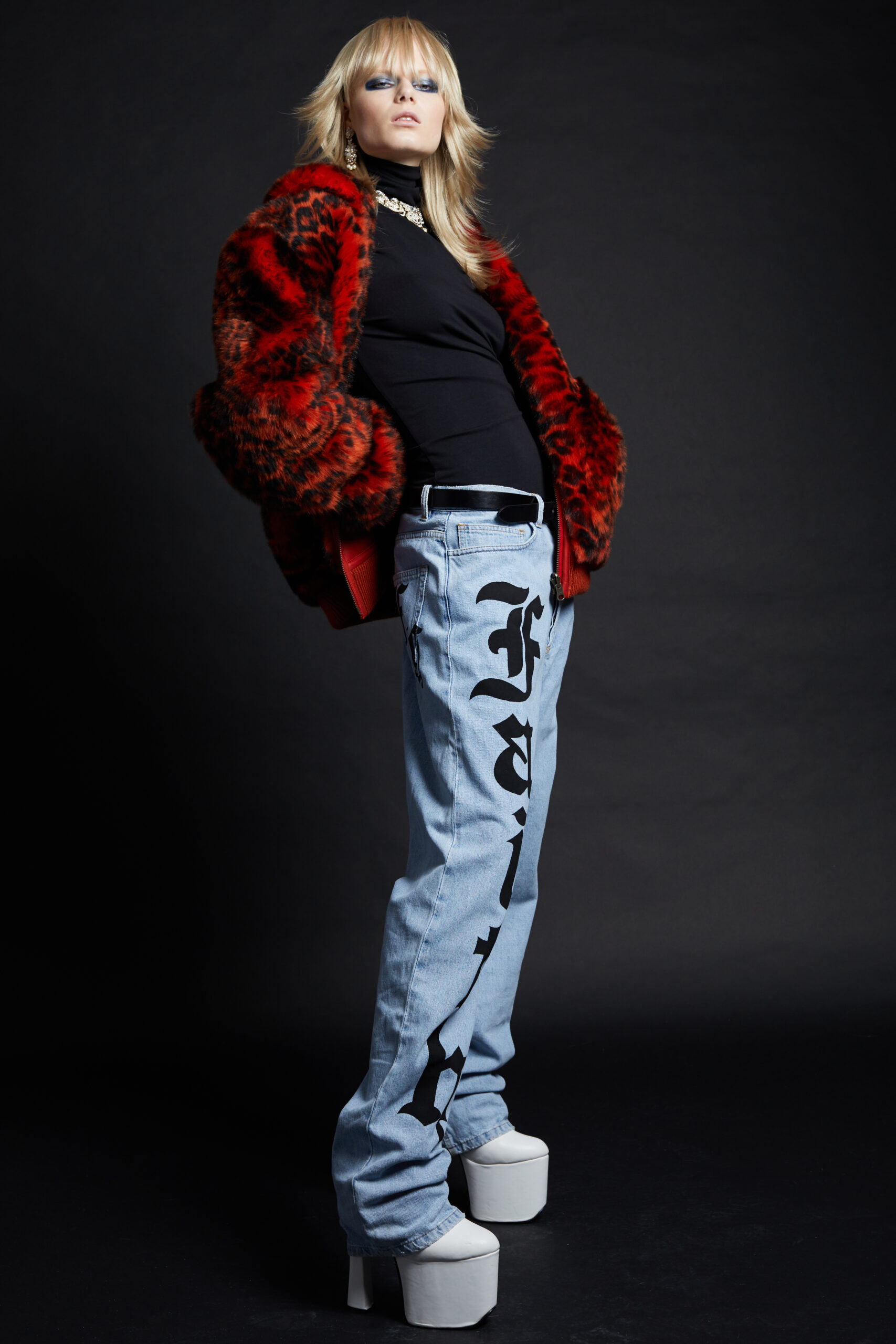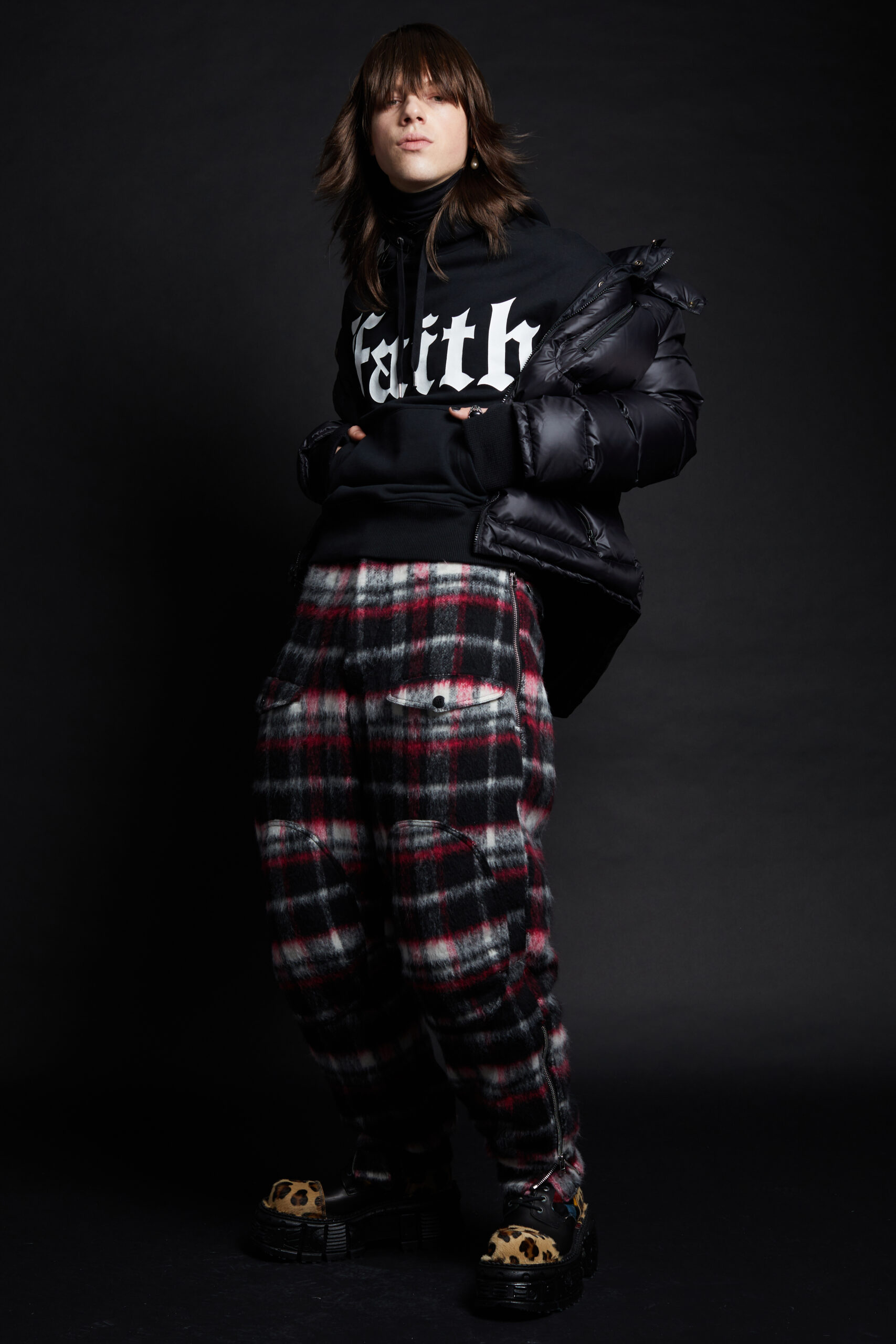 For Fall-Winter 2022 the collective unearthed the Maison’s original logotype: half Gothic, half bling, the embodiment of a «too much is never enough» attitude straight out of the 2000s, the era that gave birth to the brand. The artist «8», a long-time collaborator, was given carte blanche for its reincarnation. His updated logotypes as well as a brand new logoform he created are omnipresent this season in a diversity of formats and volumes. We find them adorning a revisited 50s style women’s tweed suit, screened on the back of a hooded micro bomber, embellishing the leg of a pair of jeans, running all the way down to the heels of the shoes.