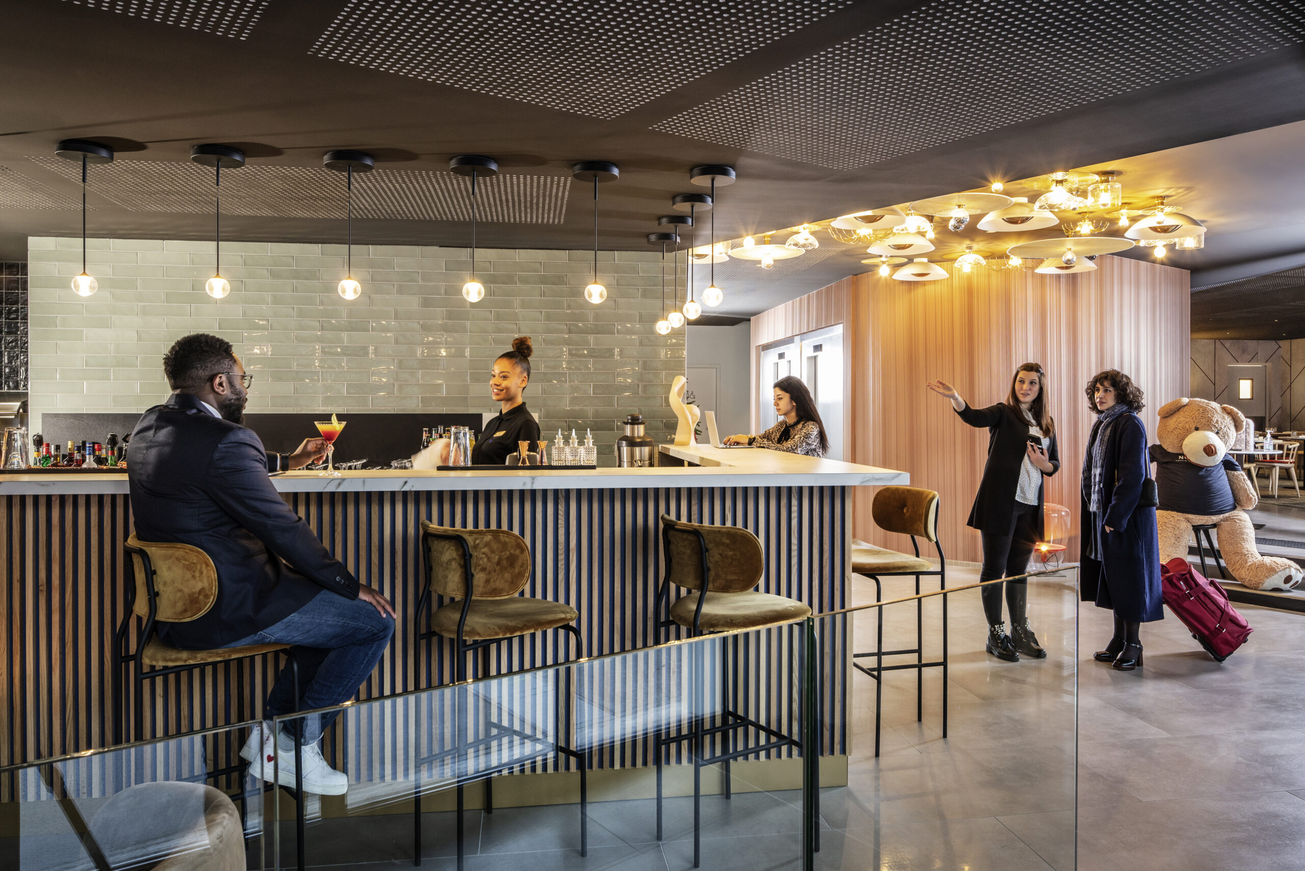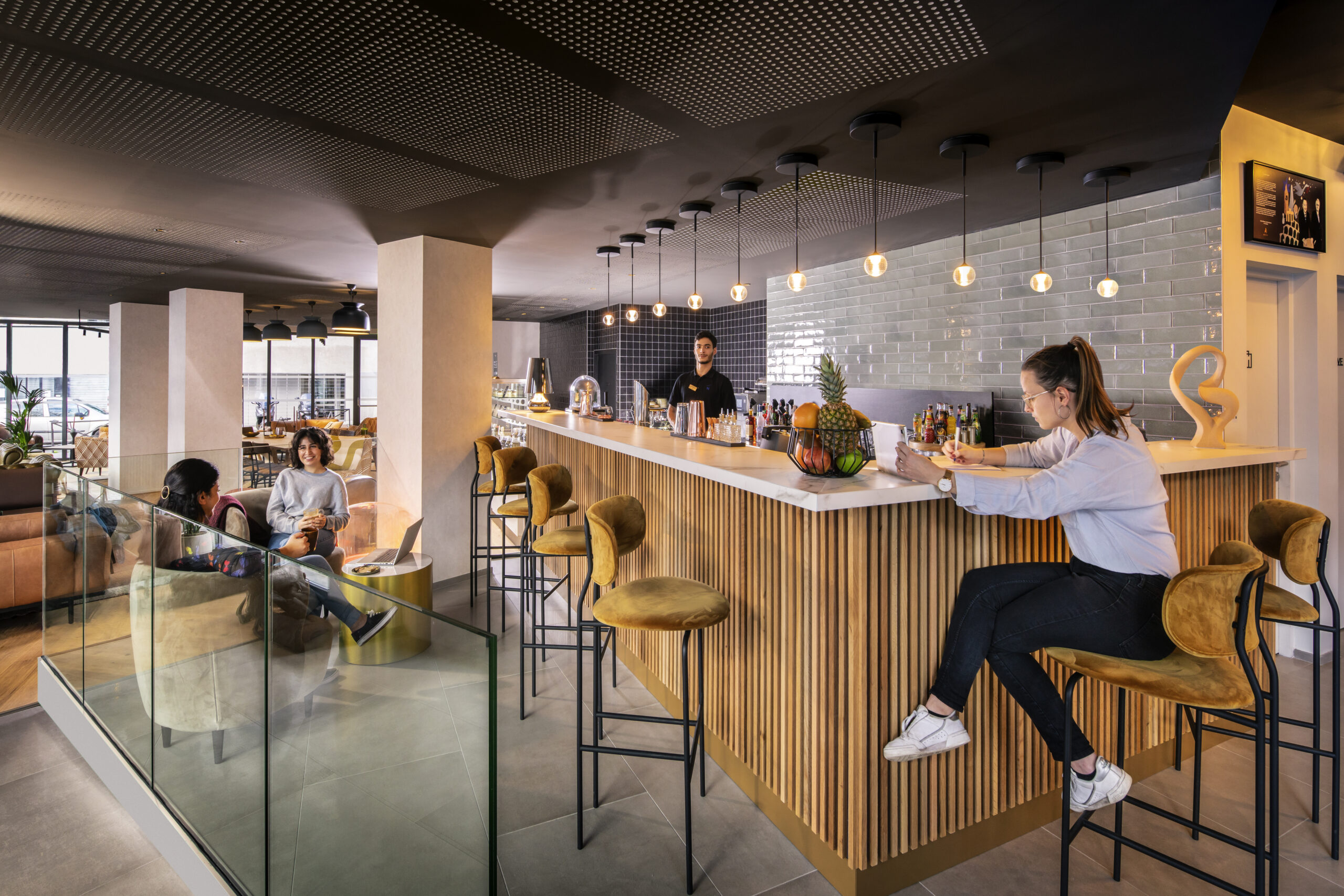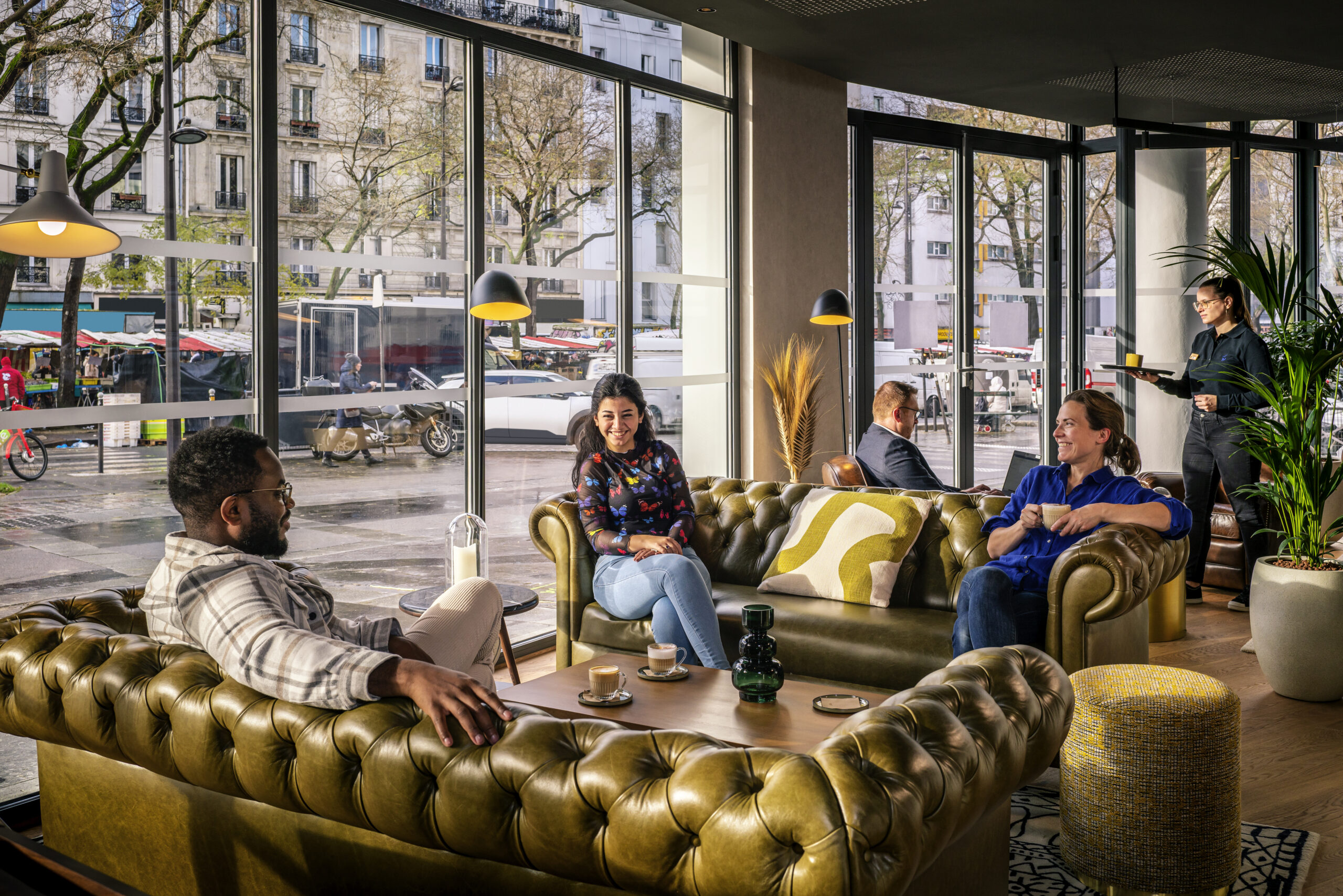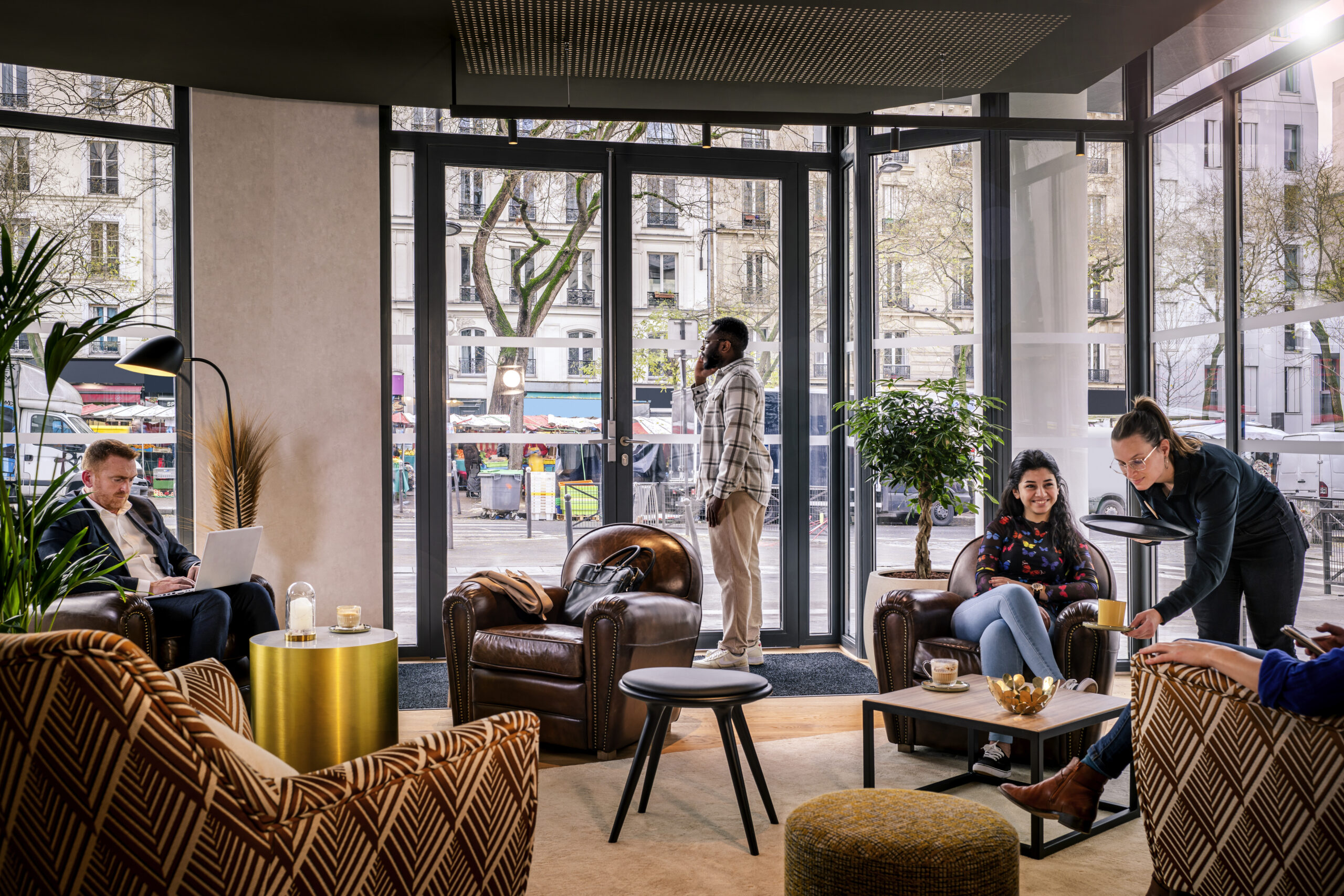 L’ensemble des espaces a été pensé pour être à la fois un lieu de détente mais aussi de travail, avec un espace de coworking au rez-de-chaussée. Le visiteur, qu’il soit client, ou Parisien, peut ainsi aller se restaurer, travailler dans un espace tranquille, se prélasser sur la terrasse lorsqu’un rayon de soleil pointe le bout de son nez, ou encore se délasser en fin de journée.