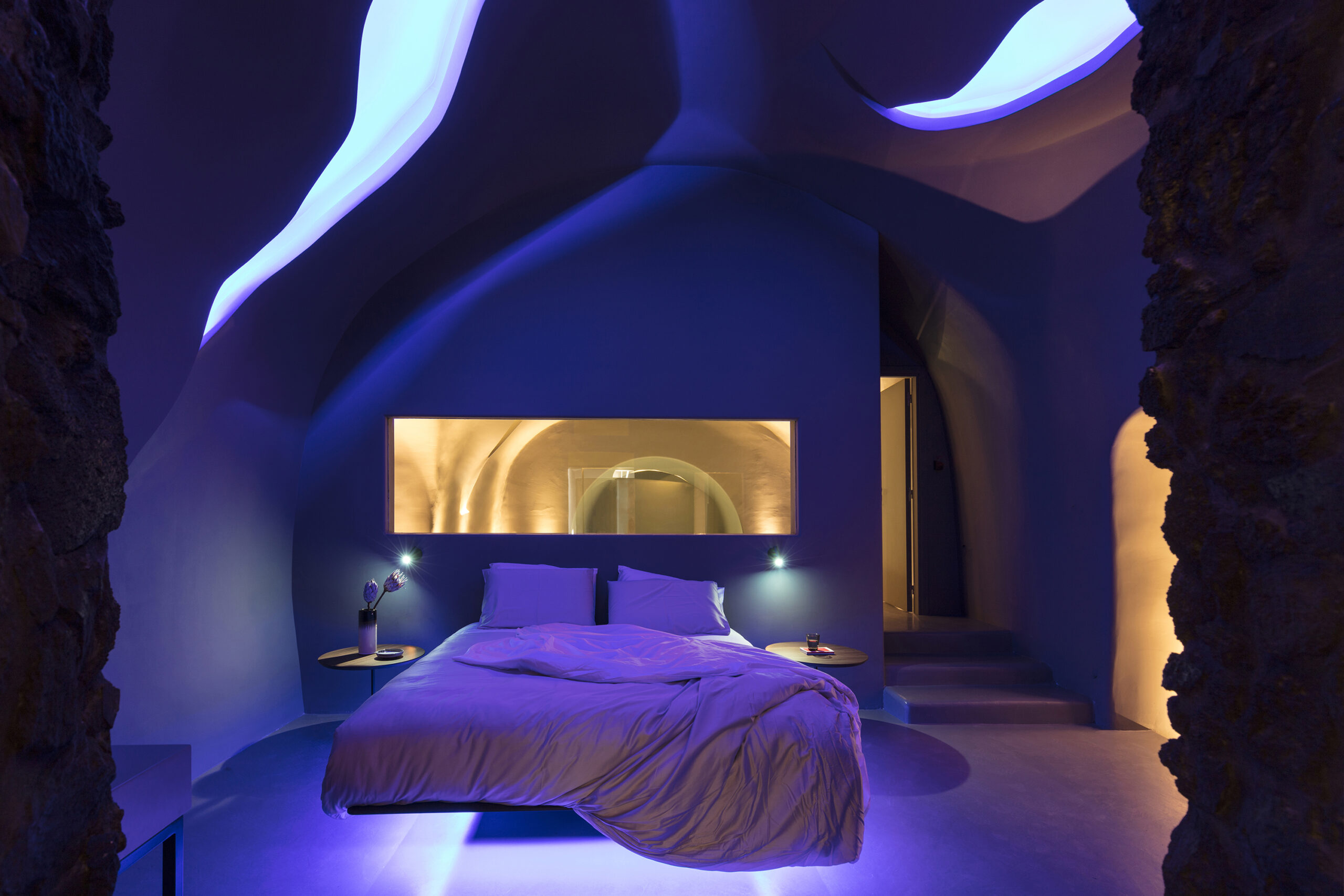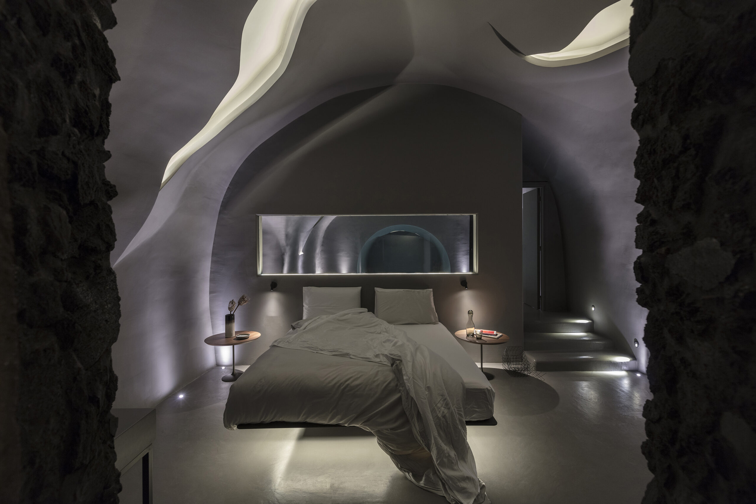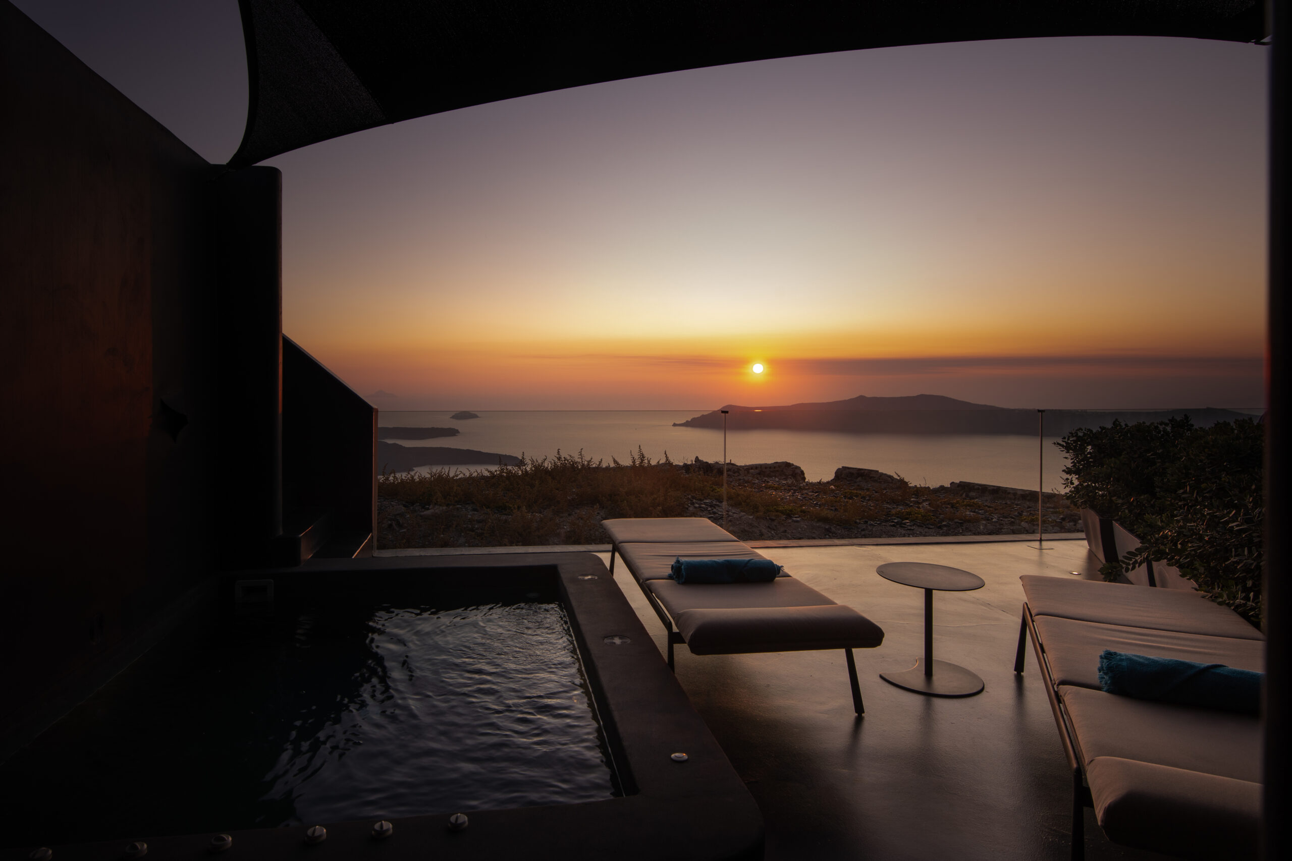 d’ébène abrite 5 suites et villas caverneuses évocatrices, une imposante piscine et « Mavro », le restaurant emblématique alliant esthétisme et goûts contemporains, le tout formant un ensemble hôtelier explosif, audacieux, mais aussi sensuel et élégant.