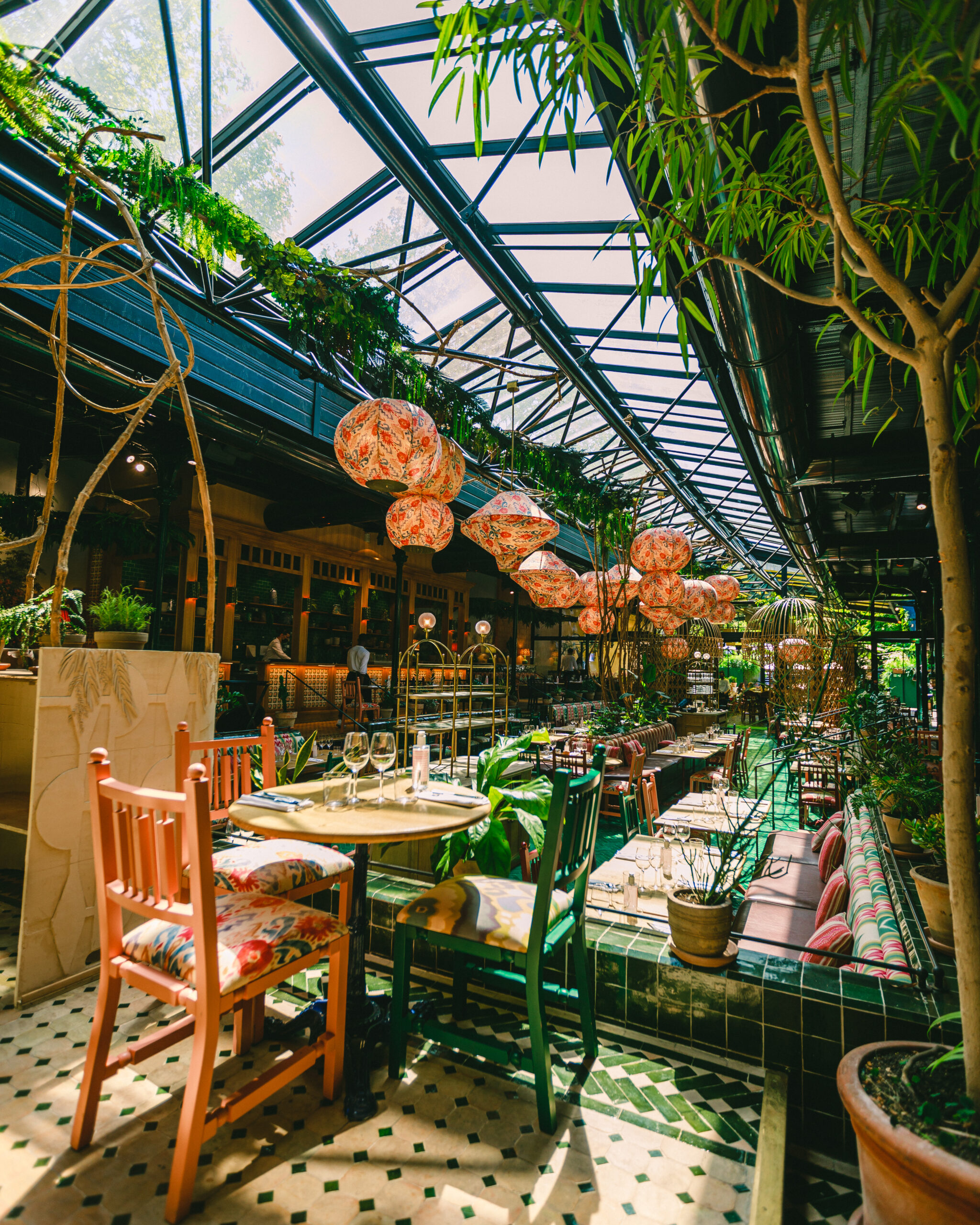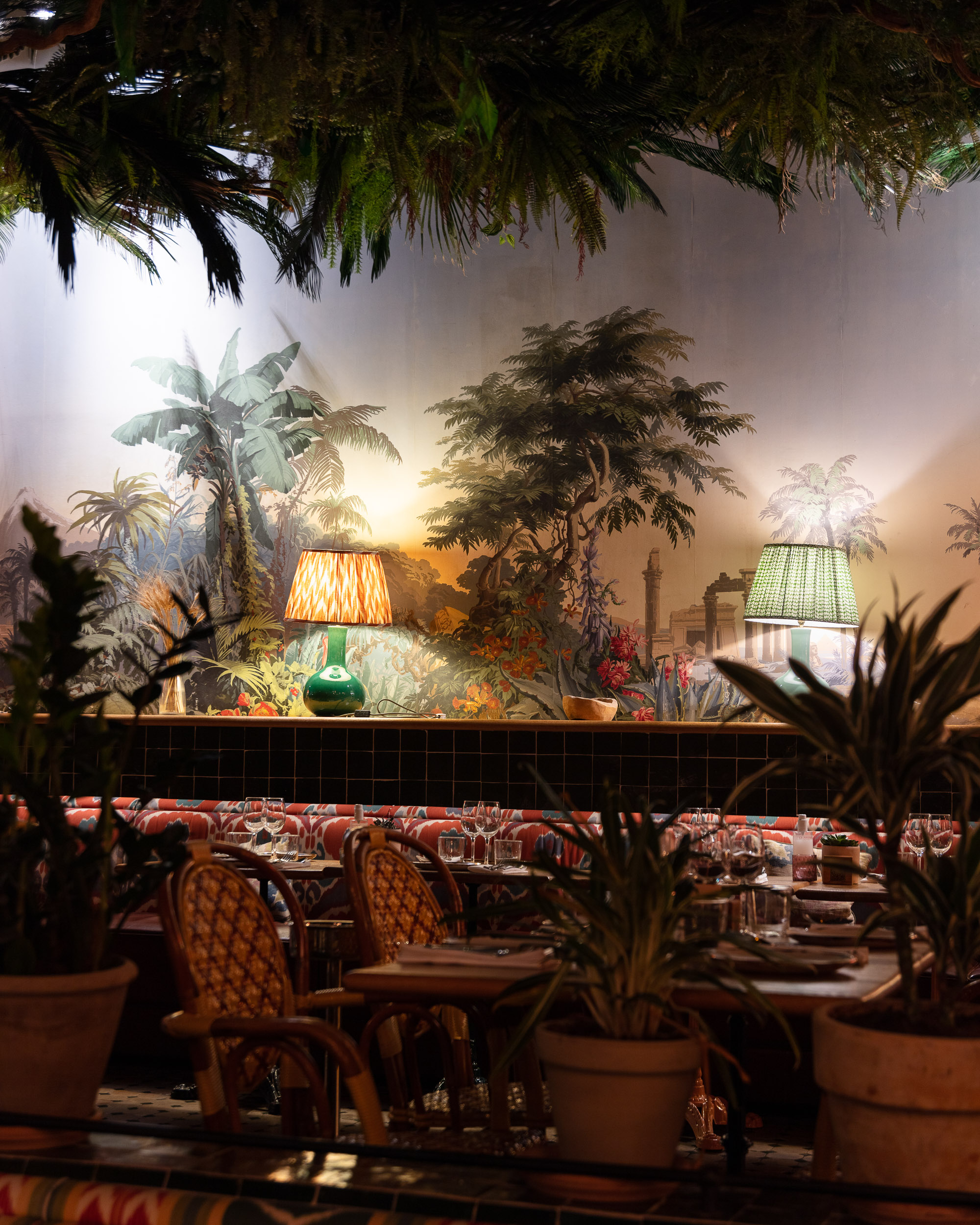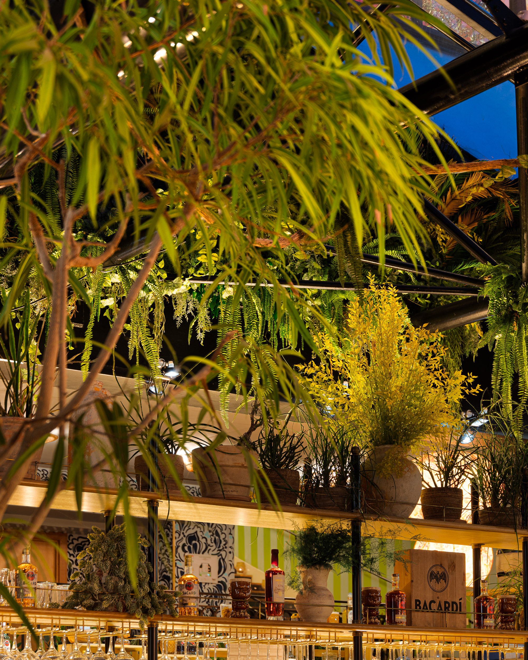 Pour cette saison, c’est une jungle luxuriante qui se déploie dans cet espace haut en couleurs réalisé par l’architecte d’intérieur Laura Gonzalez. On retrouve des plantes tropicales et de la verdure du sol au plafond, ce qui renforce davantage l’univers de l’Amérique du Sud.