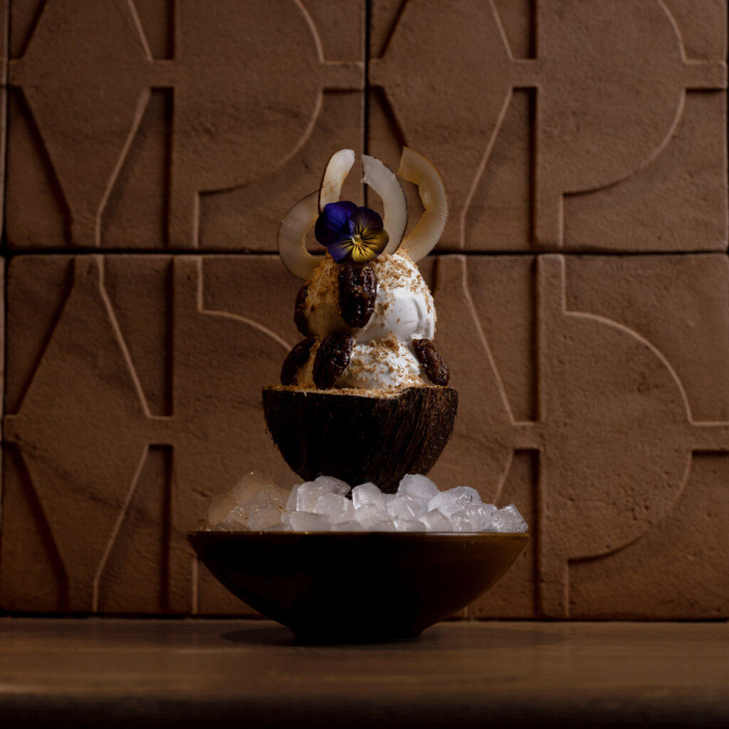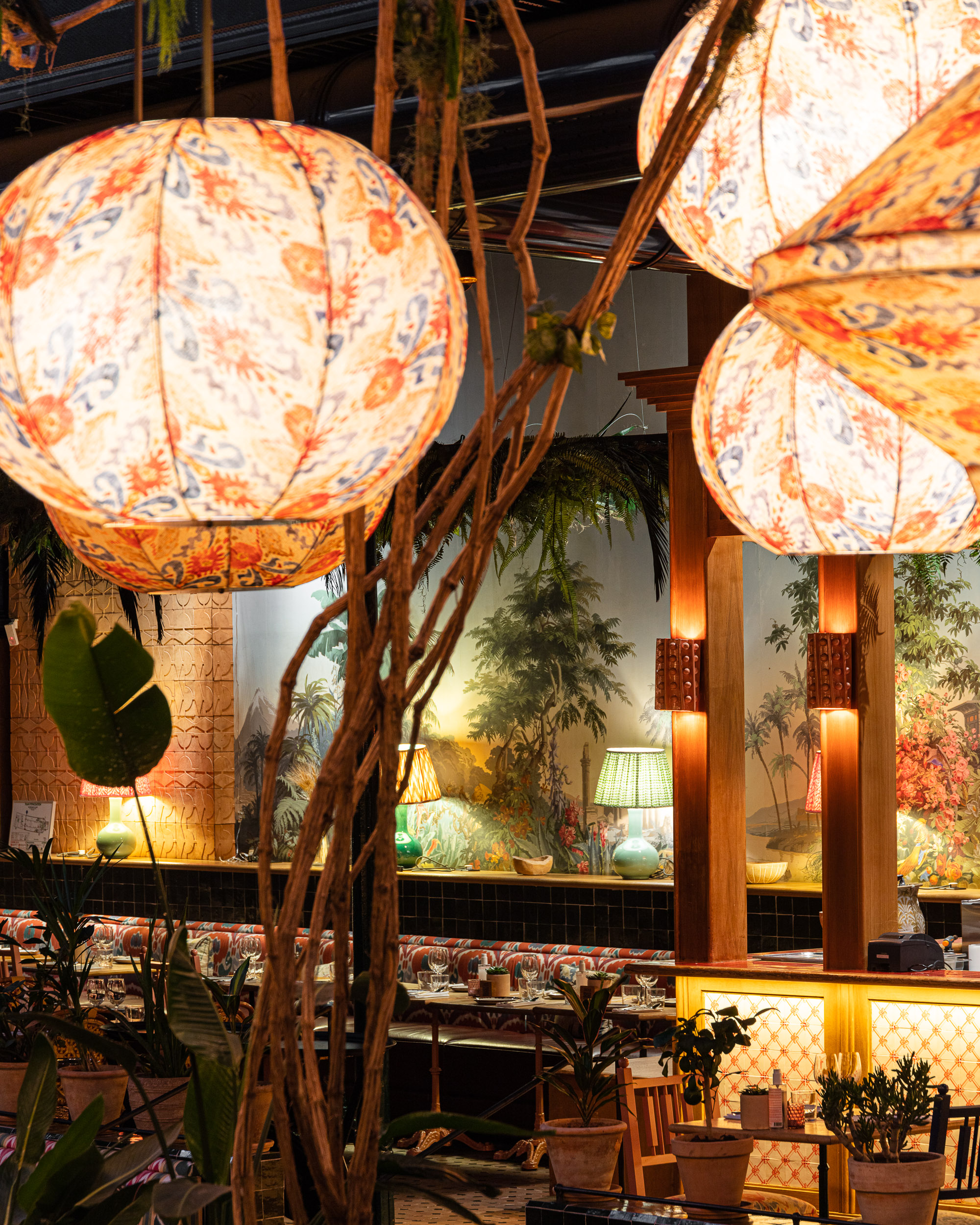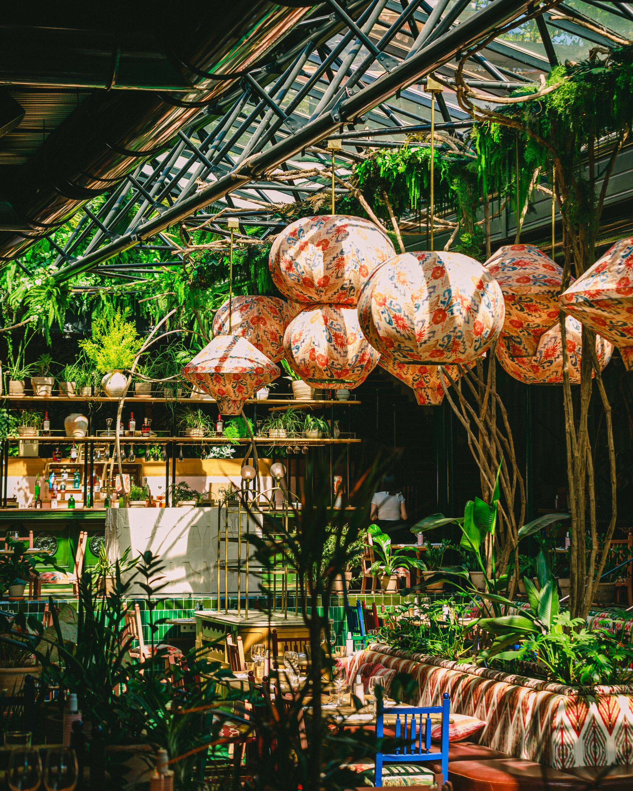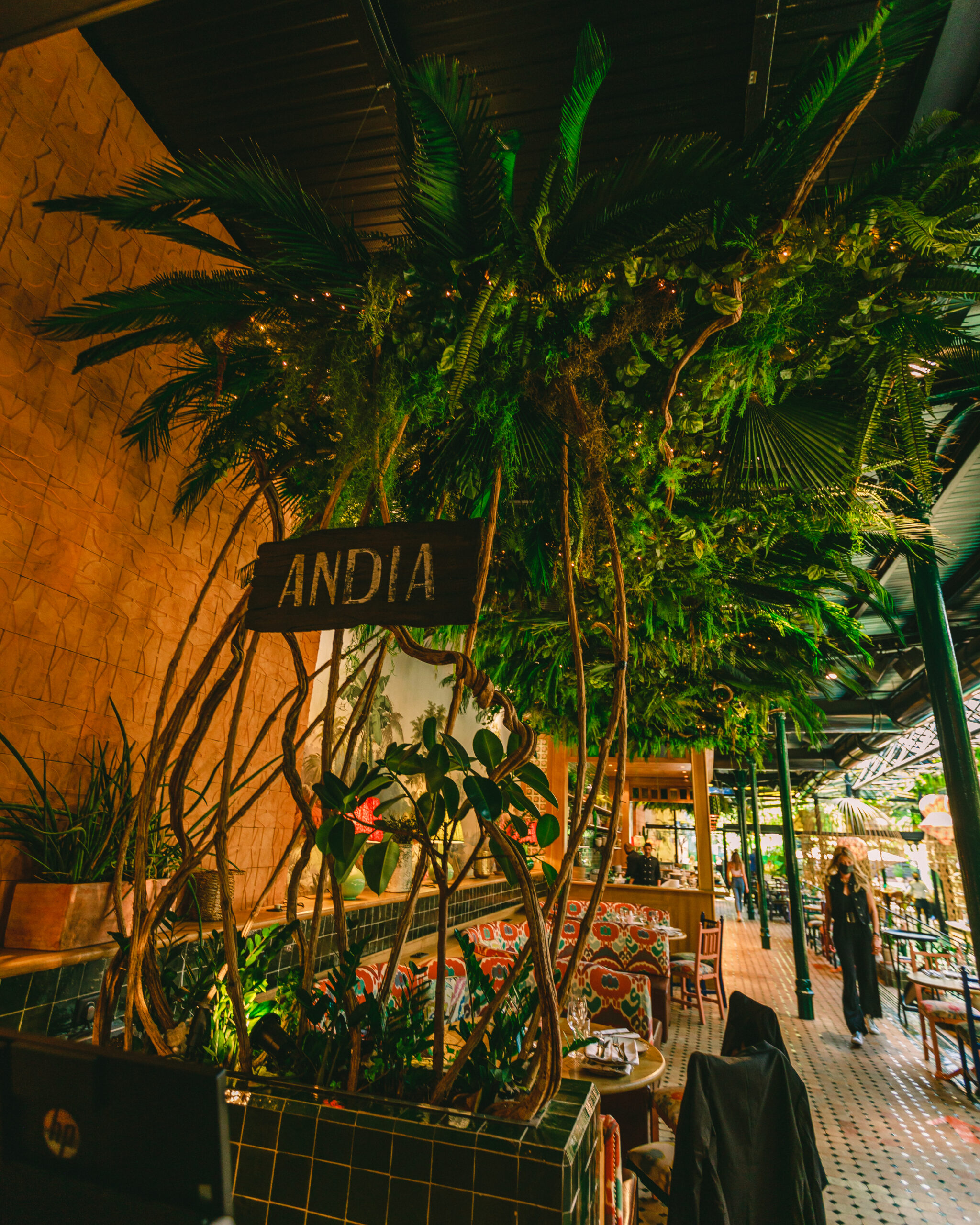 Pour cette saison, c’est une jungle luxuriante qui se déploie dans cet espace haut en couleurs réalisé par l’architecte d’intérieur Laura Gonzalez. On retrouve des plantes tropicales et de la verdure du sol au plafond, ce qui renforce davantage l’univers de l’Amérique du Sud.