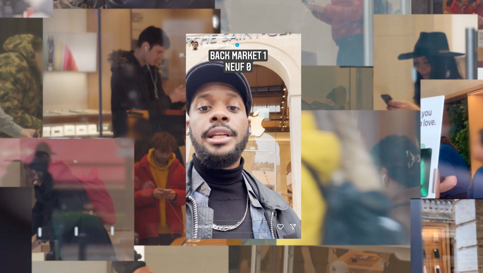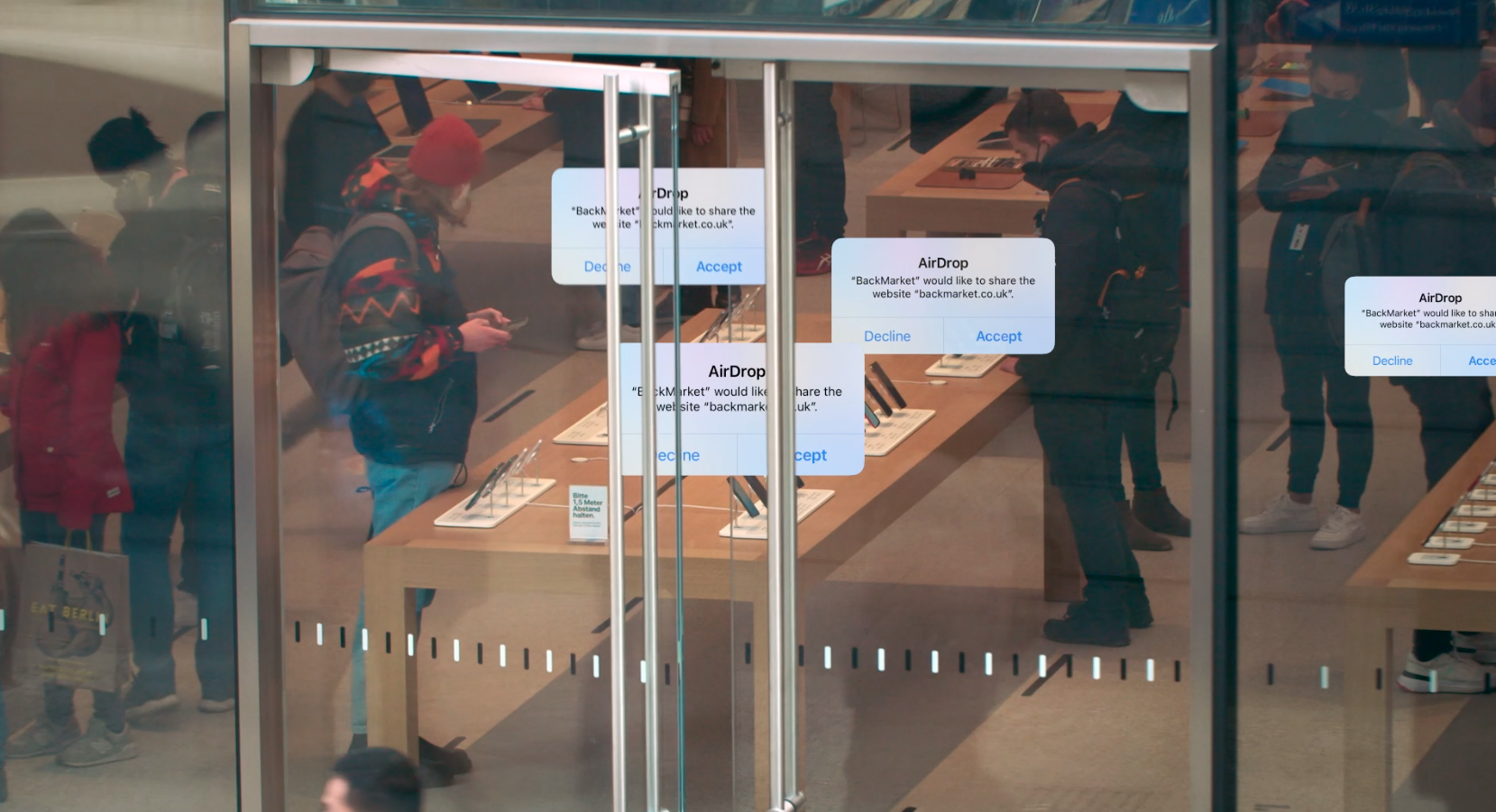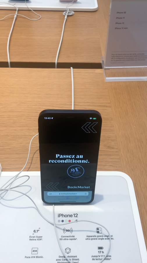 Après la publication de l’étude de l’ADEME et suite au récent rapport du GIEC, il y a urgence à repenser sa façon de consommer ! Dans cette optique, Back Market a infiltré les dispositifs des Apple Stores de Paris, Berlin et Londres grâce au système Air Drop. Chaque potentiel futur acquéreur d’un produit neuf a ainsi été challengé sur son intention d’achat. Des messages tels que : « Cet iPhone 12 est disponible en rose, en bleu, en noir et en plus vert. Passez au reconditionné. » ou « L’iPhone que vous aimez sans l’empreinte carbone que vous détestez. Passez au reconditionné. » sont apparus sur les écrans pour faire savoir aux clients qu’il existe une solution plus écologique d’obtenir le même appareil chez Back Market.