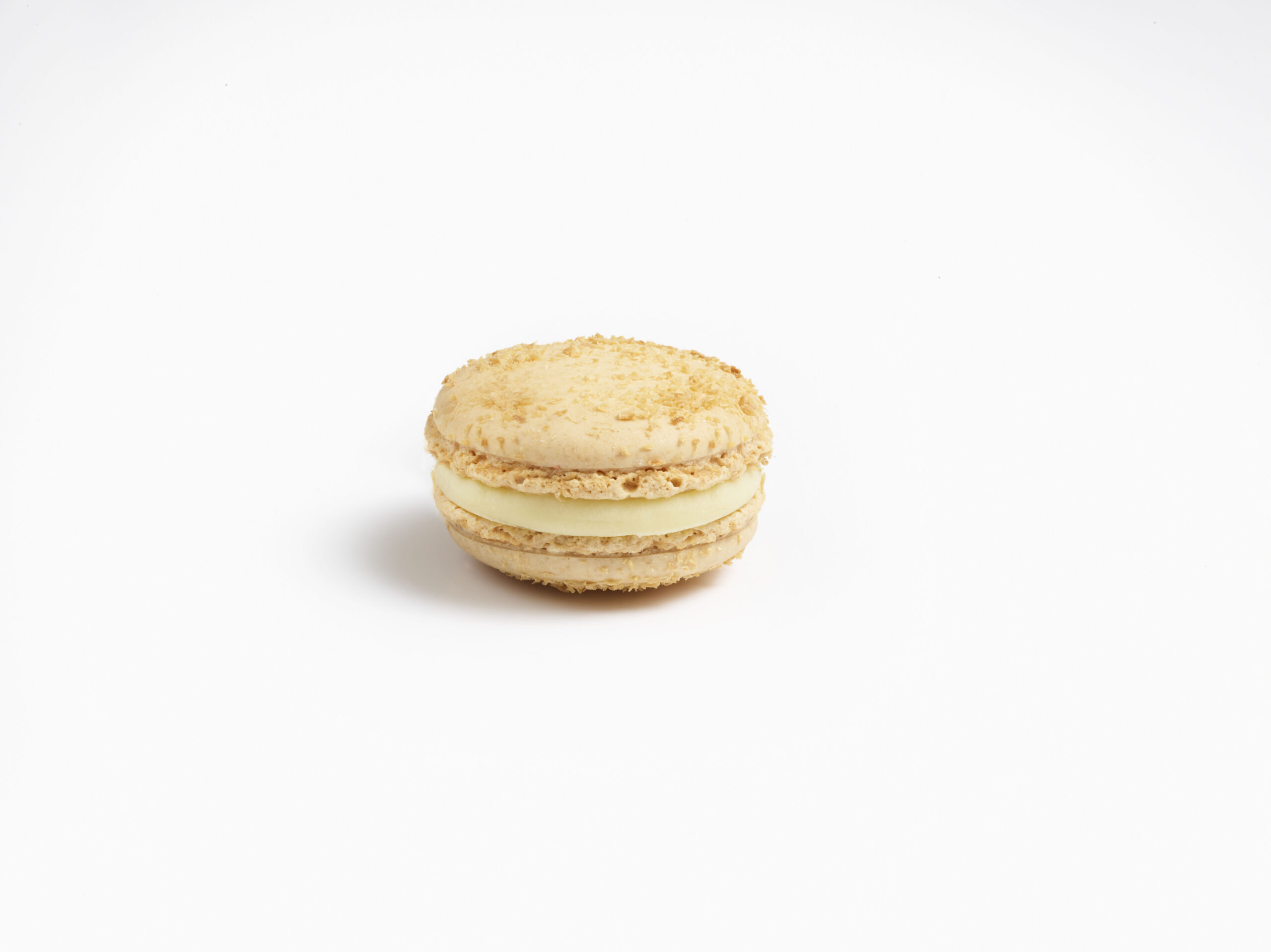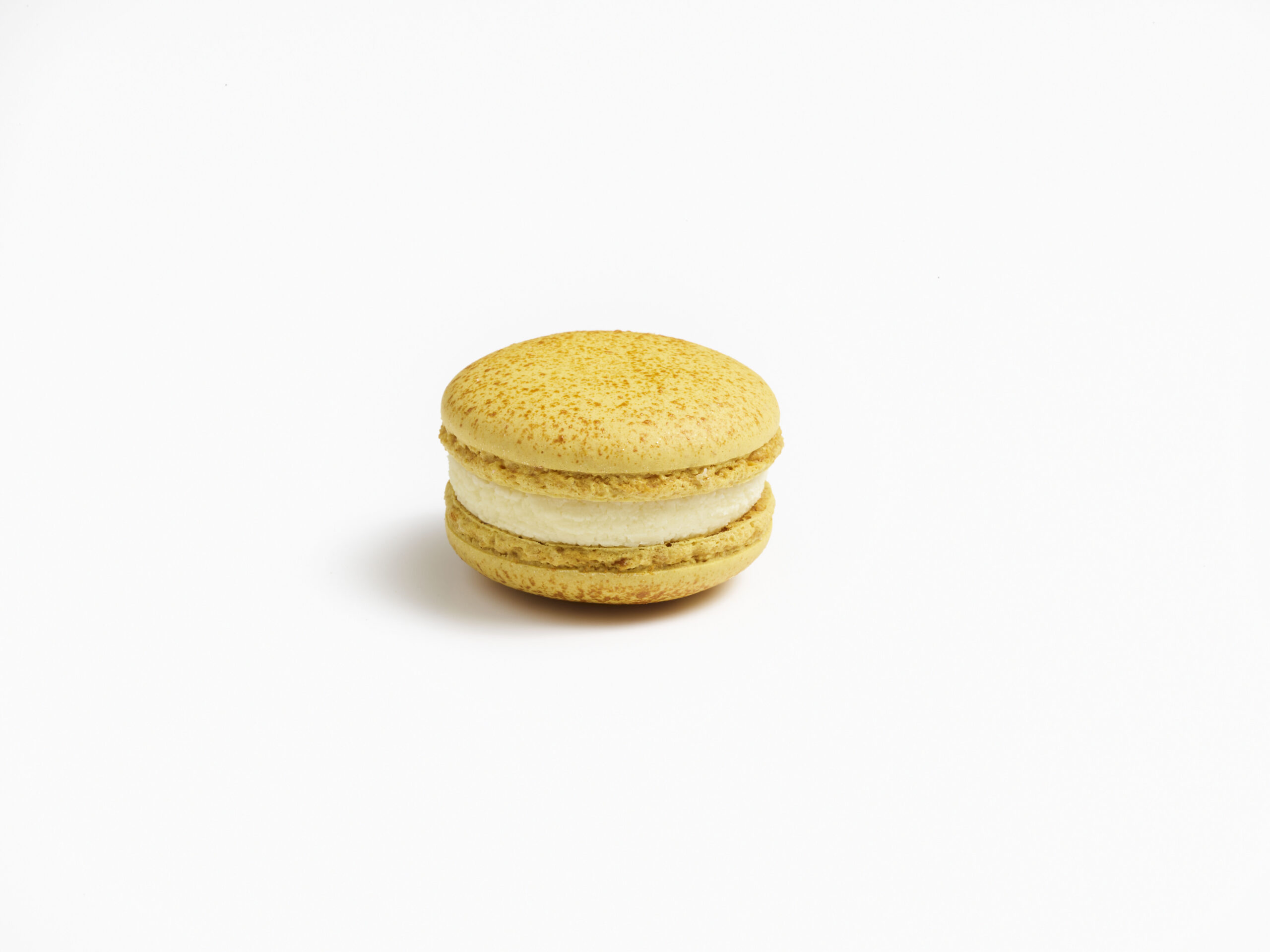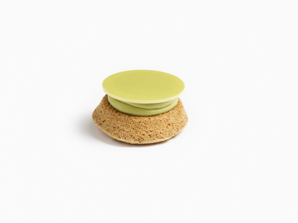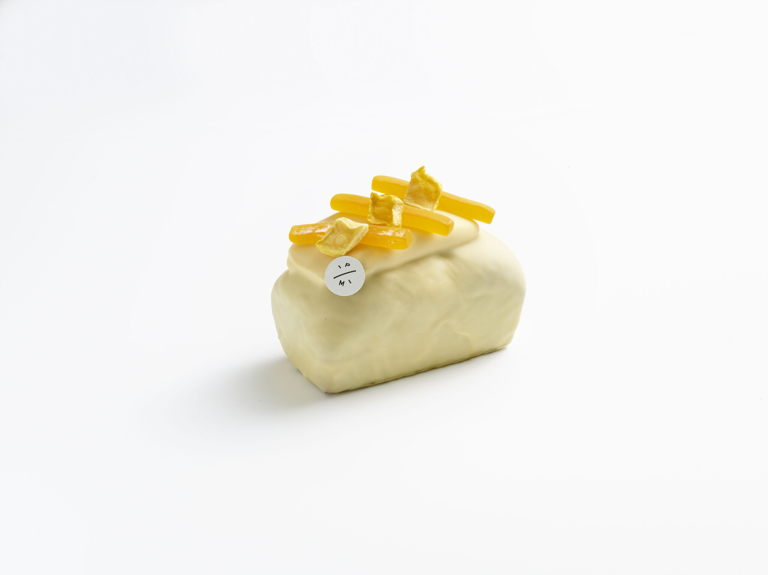 Un cake de farine de riz infusé au yuzu, réhaussé d’une ganache de verveine et de morceaux de mangue confi te, puis enrobé de chocolat blanc maison.