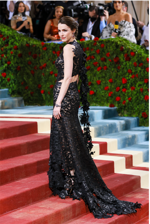Wearing a custom made shredded black lacquered lace dress with trailing three dimensional flowers to the ‘In America: An Anthology of Fashion’ Costume Institute Gala at The Metropolitan Museum of Art on Monday 2 May. All by Alexander McQueen.