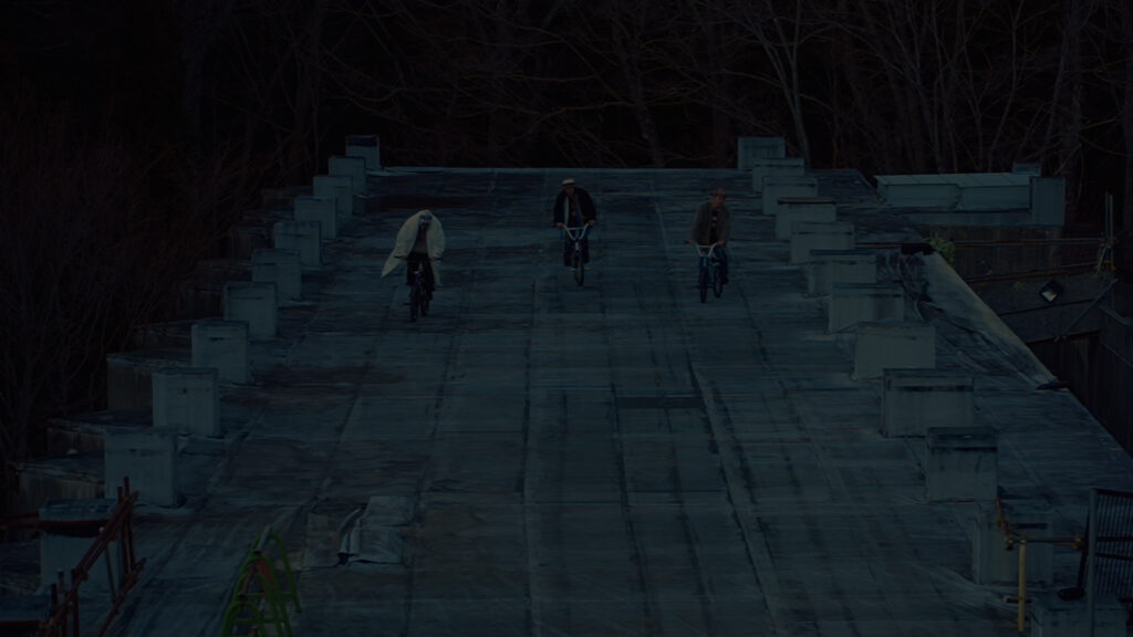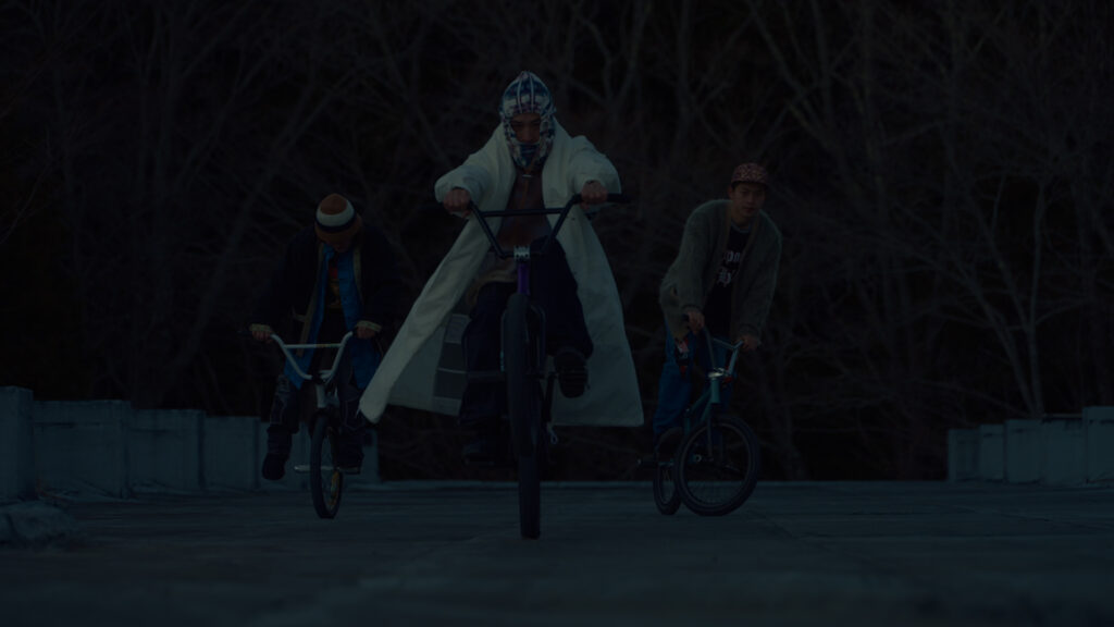 In the video, the riders showcase FW22’s looks reminiscent of 80’s outdoor wear and military wear and made with an original fabrics and textile created by the designers in collaboration with Japanese textile makers. The textiles are designed to have a retro feel, while still looking fresh. The color and the rich patterns and graphics of the garments contrast against the neutral tones of the environment and the minimalism of the architecture.
