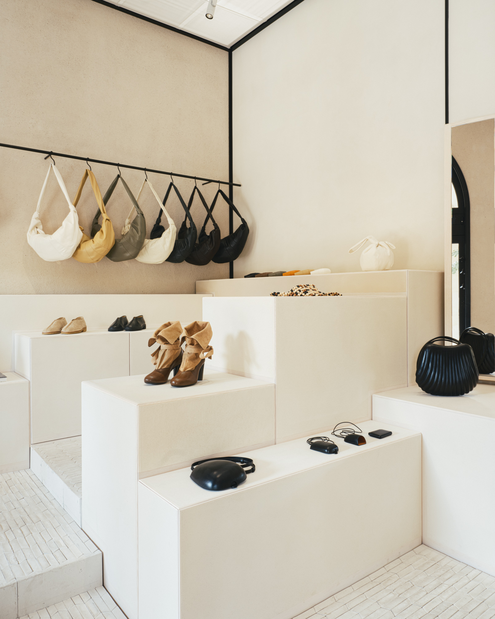 Des sacs en cuir moulés, le Camera Bag, le Carlos Bag, sont présentés sur des cubes et des podiums à la géométrie simple, de différentes hauteurs. Terre cuite, marmorino et éléments laqués dialoguent pour mettre en valeur les objets. L’accessoire est au centre de l’offre de la maison Lemaire, il complète et accompagne la silhouette dans l’espace et le temps. Un Croissant bag, à l’ergonomie souple, épouse le corps et libère le mouvement. Au-delà des sacs, on retrouve les chaussures, ceintures et bijoux Lemaire, comme ceux de la gamme Seeds, faits de pépins en laiton, fabriqués à la main : bagues, boucles d’oreilles, bracelets, colliers, dont les graines suspendues apportent une touche de lumière à la peau.