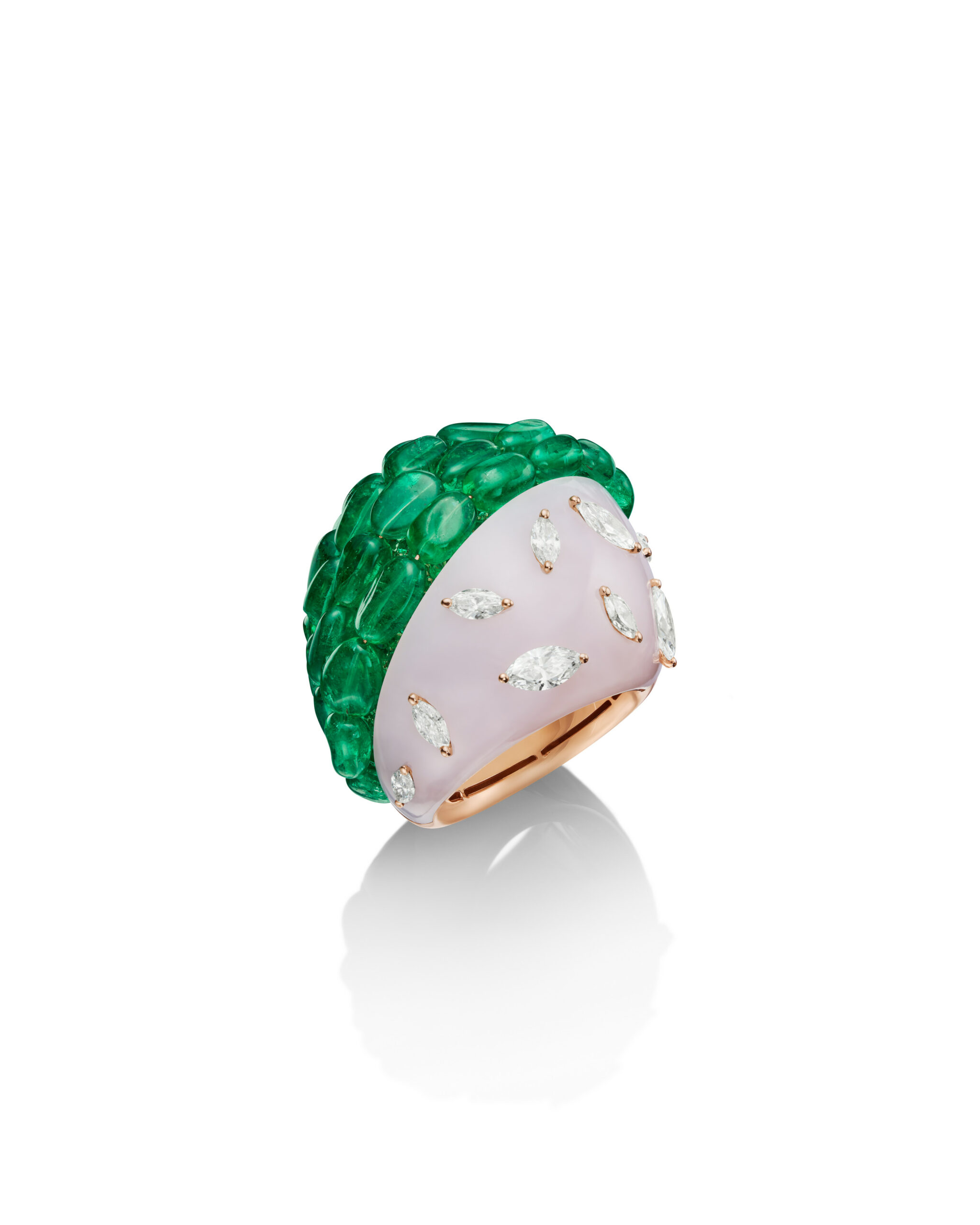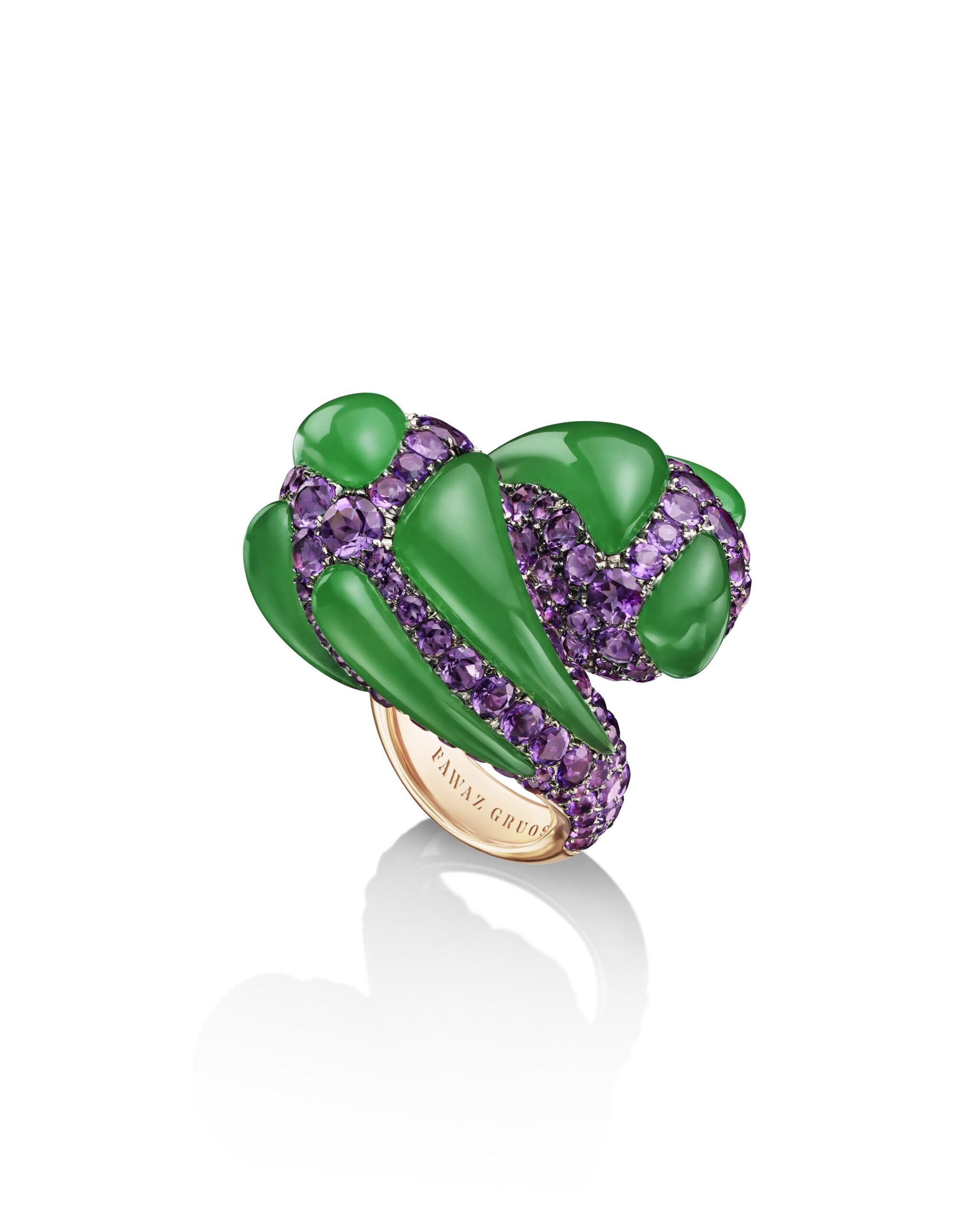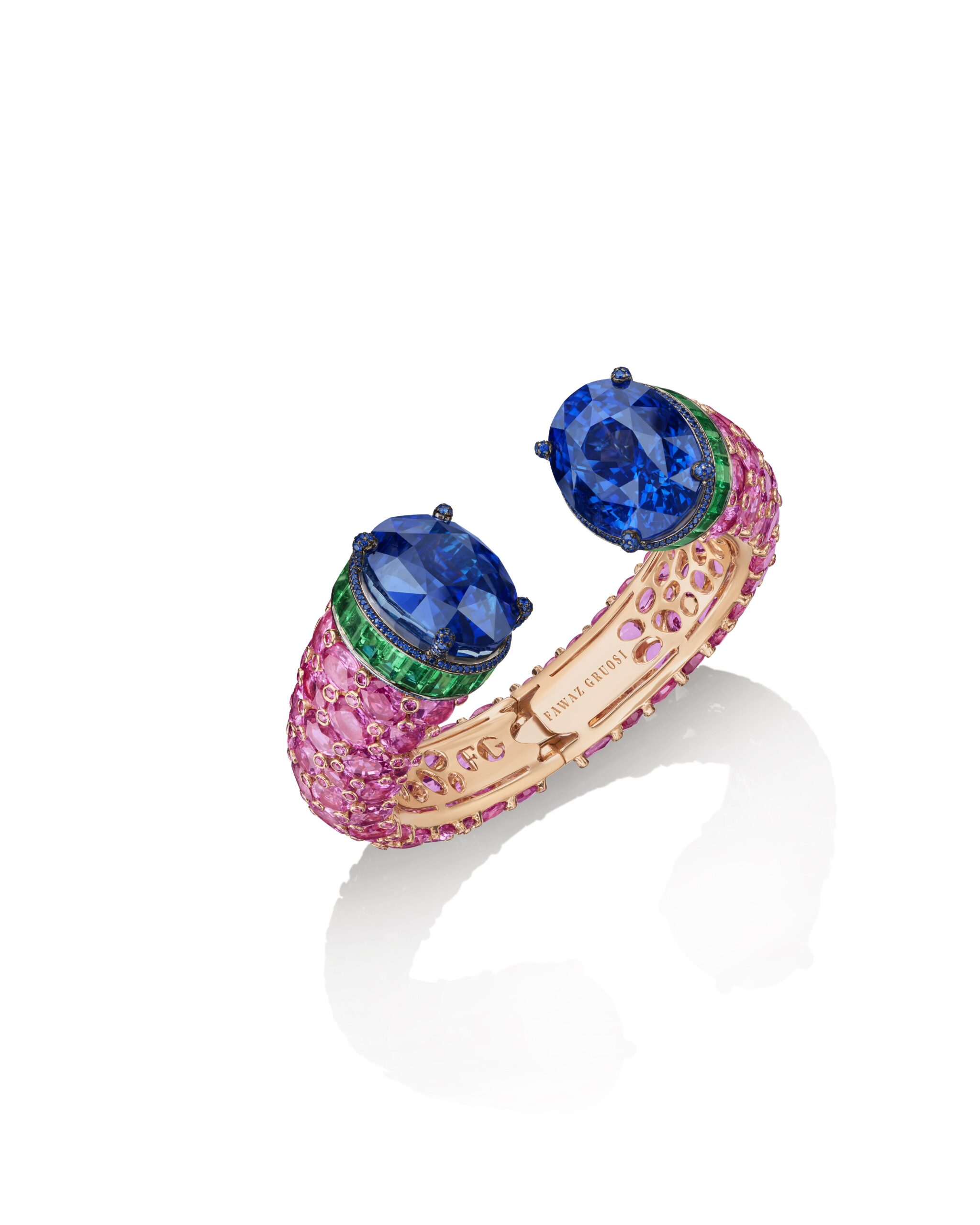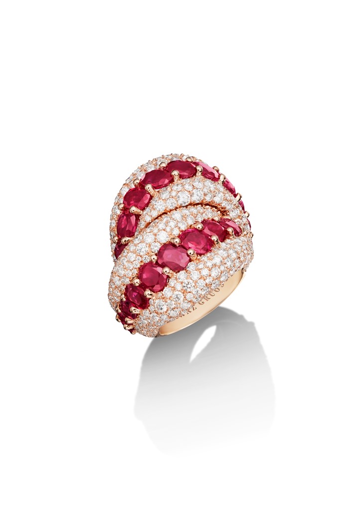 Prodigue par nature, FAWAZ GRUOSI dispense sa générosité à ses créations dont les volumes combinant force et sensualité expriment un empowerment qui ne fait allégeance qu’au glamour. Avec ses vagues au rouge soutenu alternant baguettes de rubis birmans et rubis taille brillant complètement homogène en couleur, un bracelet couronne le poignet d’un coucher de soleil incandescent. Une bague boule faisant converser l’opale rose saupoudré de marquises de diamants et trente-et-un cabochons d’émeraudes évoque une généreuse éclosion. Un volume affirmé caractérise aussi cette bague à double spirale d’or rose pavé de diamants sur lesquels court un ruban de rubis presque gourmands.