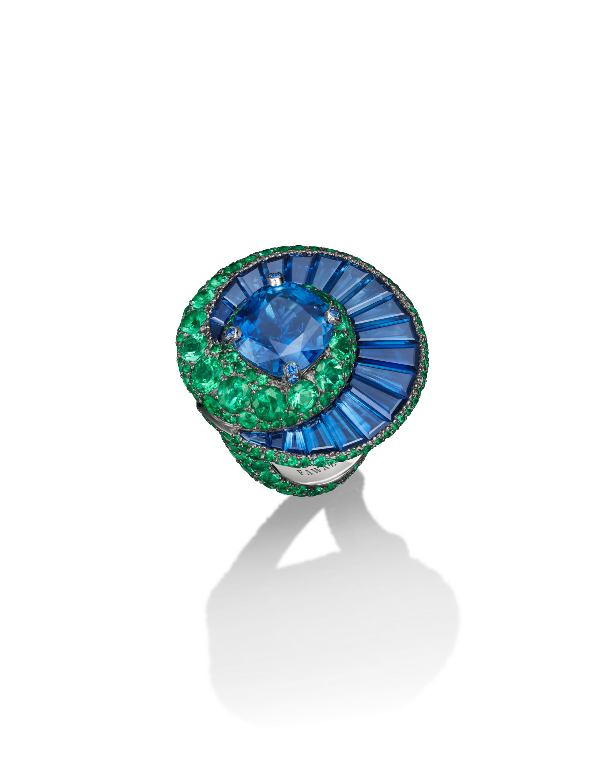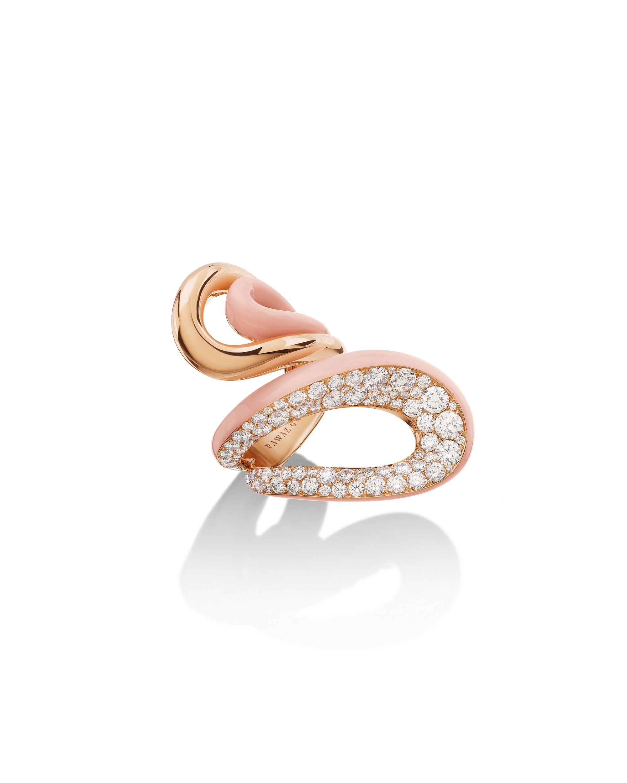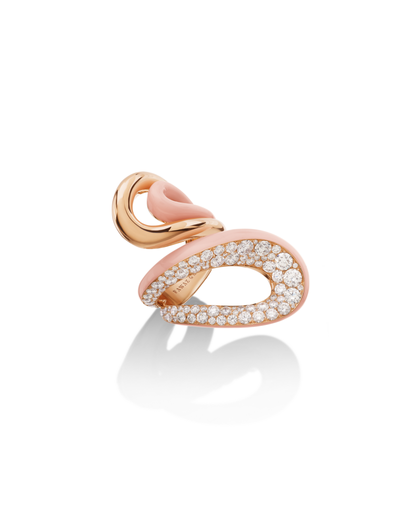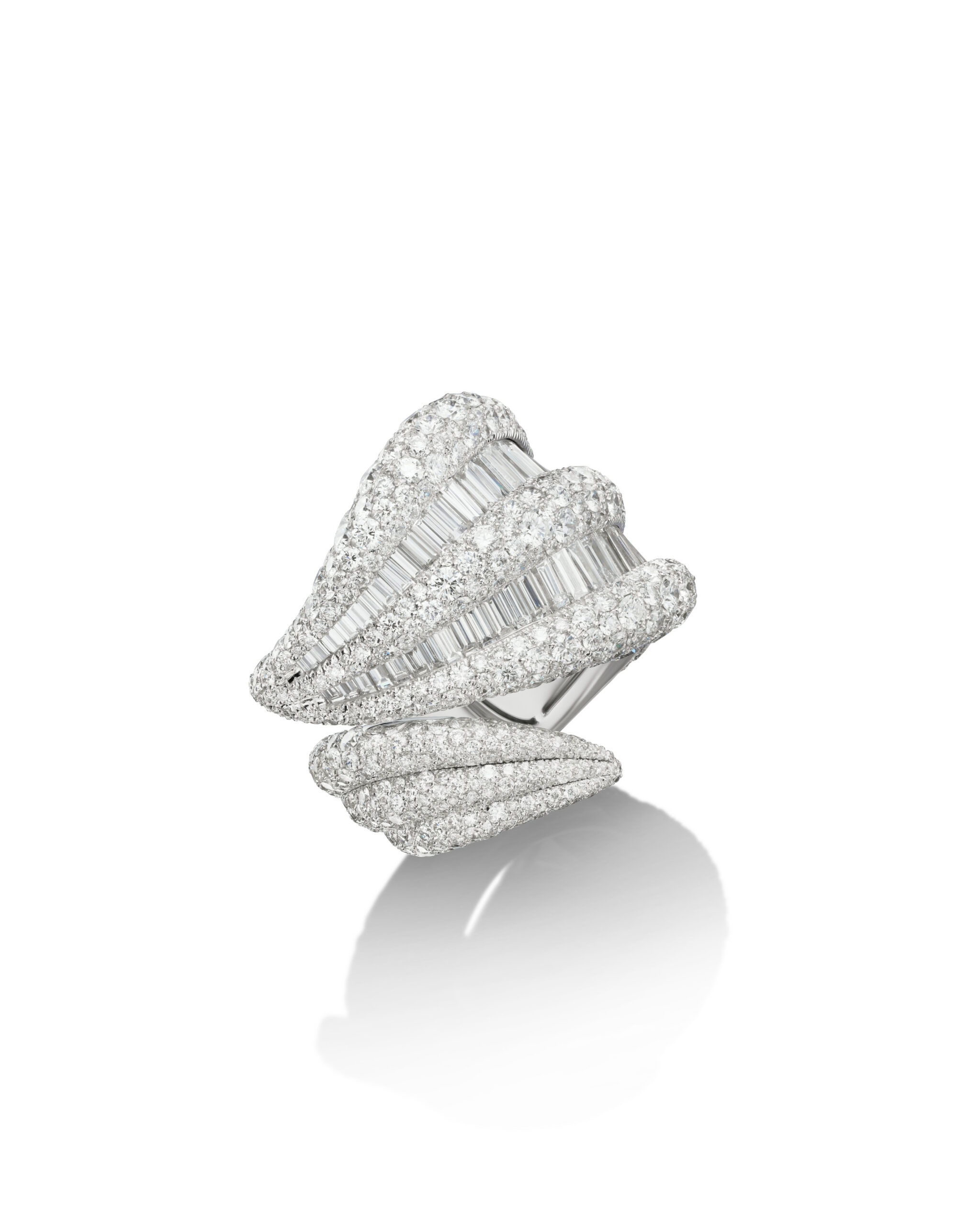 Prodigue par nature, FAWAZ GRUOSI dispense sa générosité à ses créations dont les volumes combinant force et sensualité expriment un empowerment qui ne fait allégeance qu’au glamour. Avec ses vagues au rouge soutenu alternant baguettes de rubis birmans et rubis taille brillant complètement homogène en couleur, un bracelet couronne le poignet d’un coucher de soleil incandescent. Une bague boule faisant converser l’opale rose saupoudré de marquises de diamants et trente-et-un cabochons d’émeraudes évoque une généreuse éclosion. Un volume affirmé caractérise aussi cette bague à double spirale d’or rose pavé de diamants sur lesquels court un ruban de rubis presque gourmands.