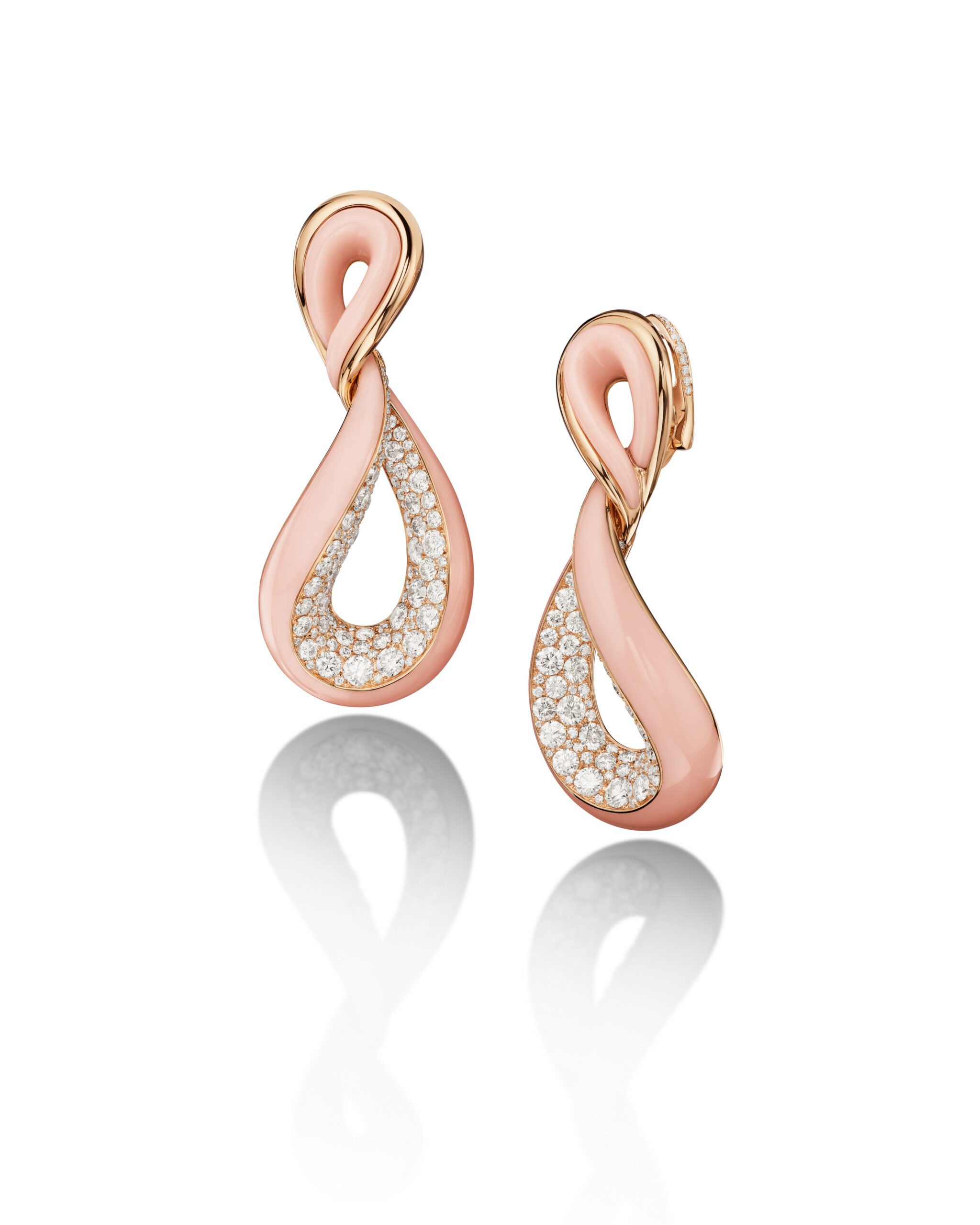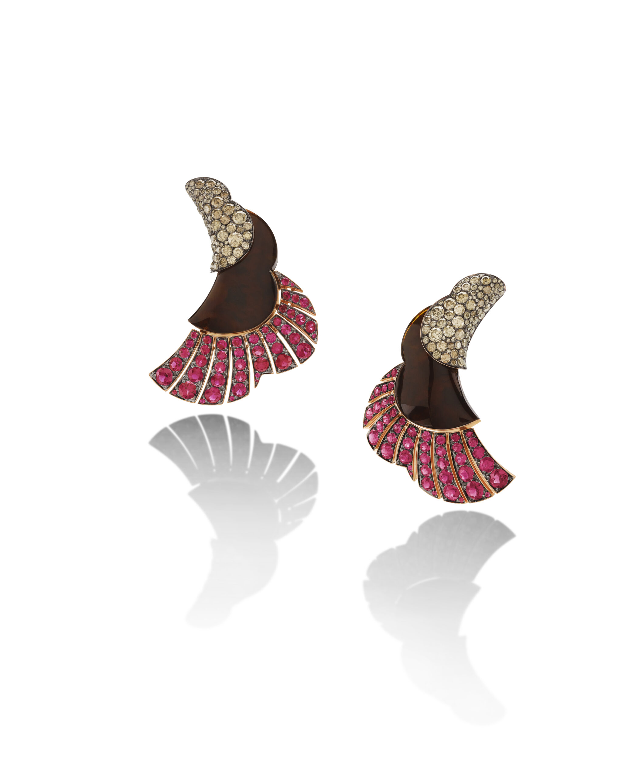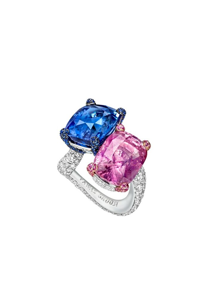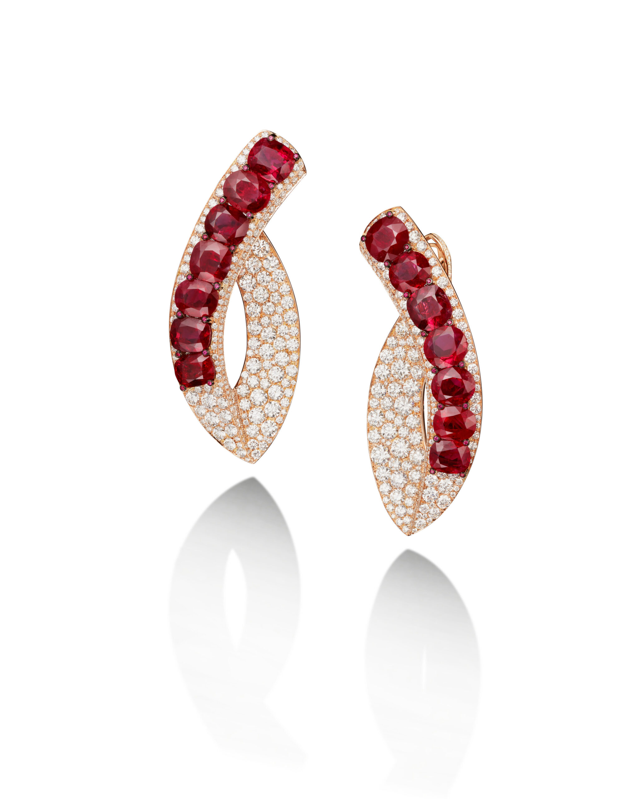 Prodigue par nature, FAWAZ GRUOSI dispense sa générosité à ses créations dont les volumes combinant force et sensualité expriment un empowerment qui ne fait allégeance qu’au glamour. Avec ses vagues au rouge soutenu alternant baguettes de rubis birmans et rubis taille brillant complètement homogène en couleur, un bracelet couronne le poignet d’un coucher de soleil incandescent. Une bague boule faisant converser l’opale rose saupoudré de marquises de diamants et trente-et-un cabochons d’émeraudes évoque une généreuse éclosion. Un volume affirmé caractérise aussi cette bague à double spirale d’or rose pavé de diamants sur lesquels court un ruban de rubis presque gourmands.