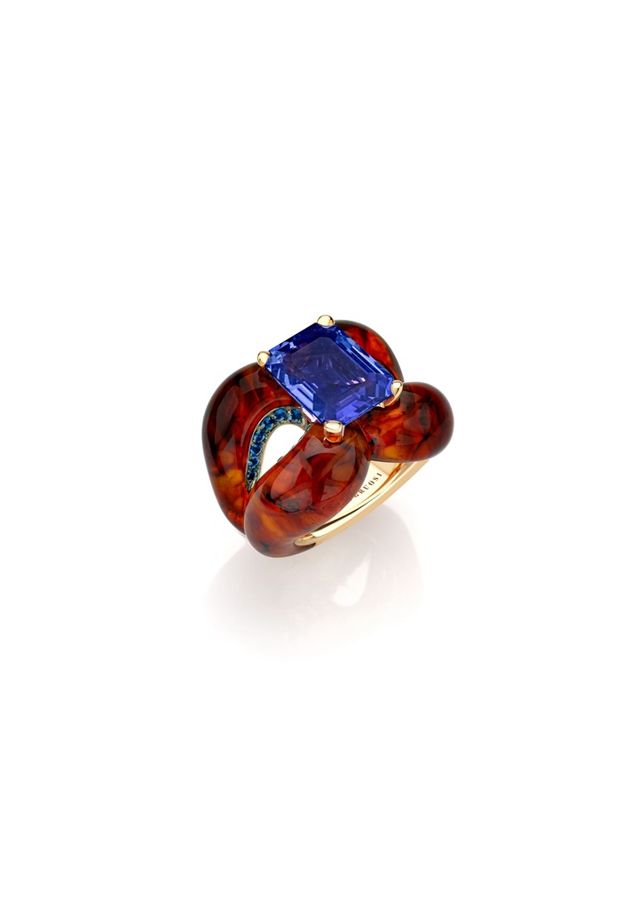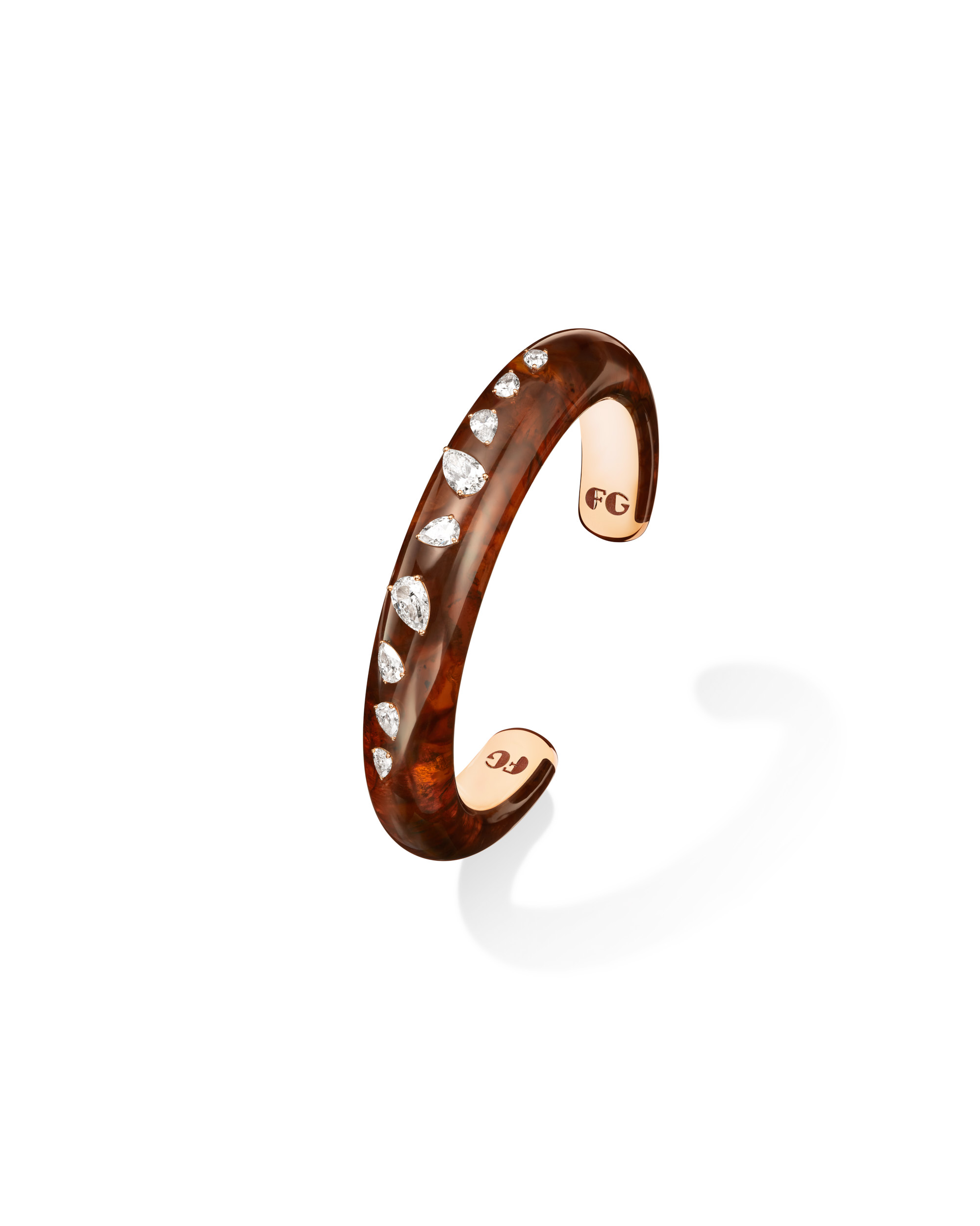 L’extrême vigilance sur la traçabilité des pierres se combine à la grande exigence des critères de sélection. Observées à la lumière du nord, qui révèle les plus belles cristallisations, les émeraudes les plus narratives viennent ain si composer de véritables manifestes de féminité. Faussement classiques, les boucles d’oreilles graphiques s’autorisent une asymétrie, tandis que le collier point d’interrogation est revisité en proposition ultra contemporaine faisant s’enlacer un serpent de diamant et un second d’émeraudes sur lequel jaillit un quintette d’émeraudes taillées à degrés. Telle une lave précieuse embrasant le décolleté, une coulée de diamants appelle quarante-quatre émeraudes de Zambie à l’appairage somptueux totalisant 87,65 carats. Choisis par le créateur pour la délicatesse de leur bleu juste traversé d’une pointe de violet, deux saphirs de Ceylan non chauffés taillés en coussin signent des girandoles du Ille millénaire. Ouvert à toute pierre qui murmure à son imaginaire, aussi iconoclaste soit-elle, FAWAZ GRUOSI donne à l’ambre ses lettres de noblesse joaillière. Première matière précieuse connue de l’homme, la gemme organique dont les pharaons se paraient volontiers offre à la haute joaillerie ses tonalités miellées. Venues des rives de la Baltique, les plus belles qualités sont ciselées en cabochons et gouttes avant d’être enrichies de motifs d’or sertis de diamants. Sur une bague à la rondeur caressante, les nuances acajou de l’ambre se marient à un saphir de Ceylan de 9,75 carats, quand un jonc fait scintiller un ballet de diamants taille poire.