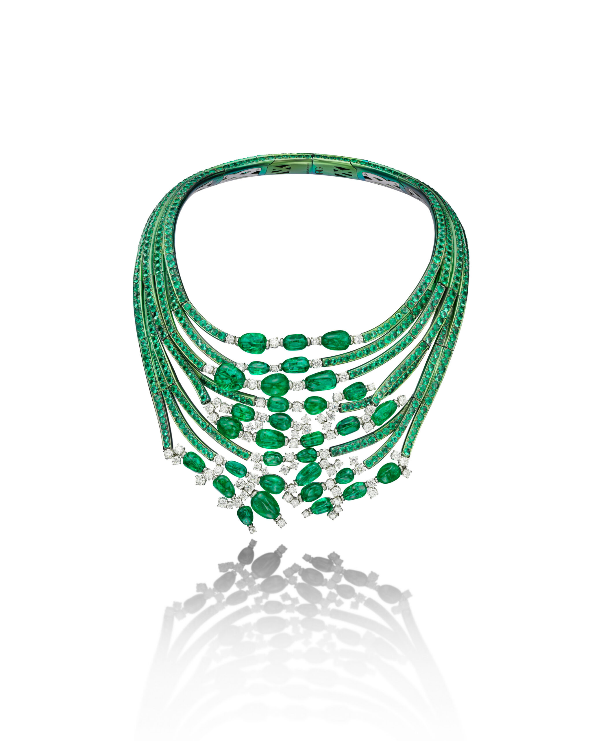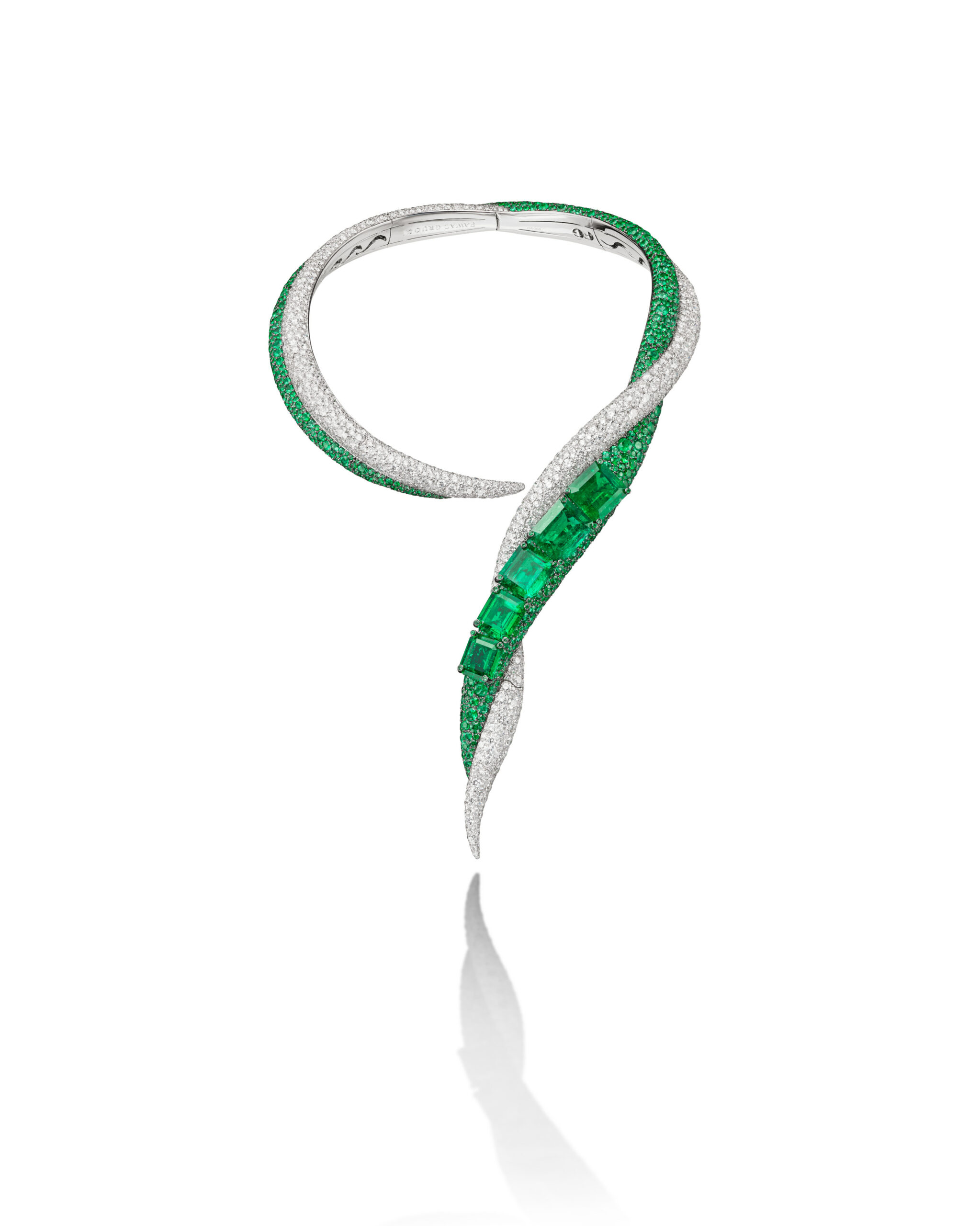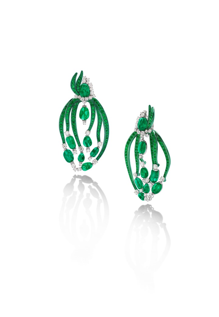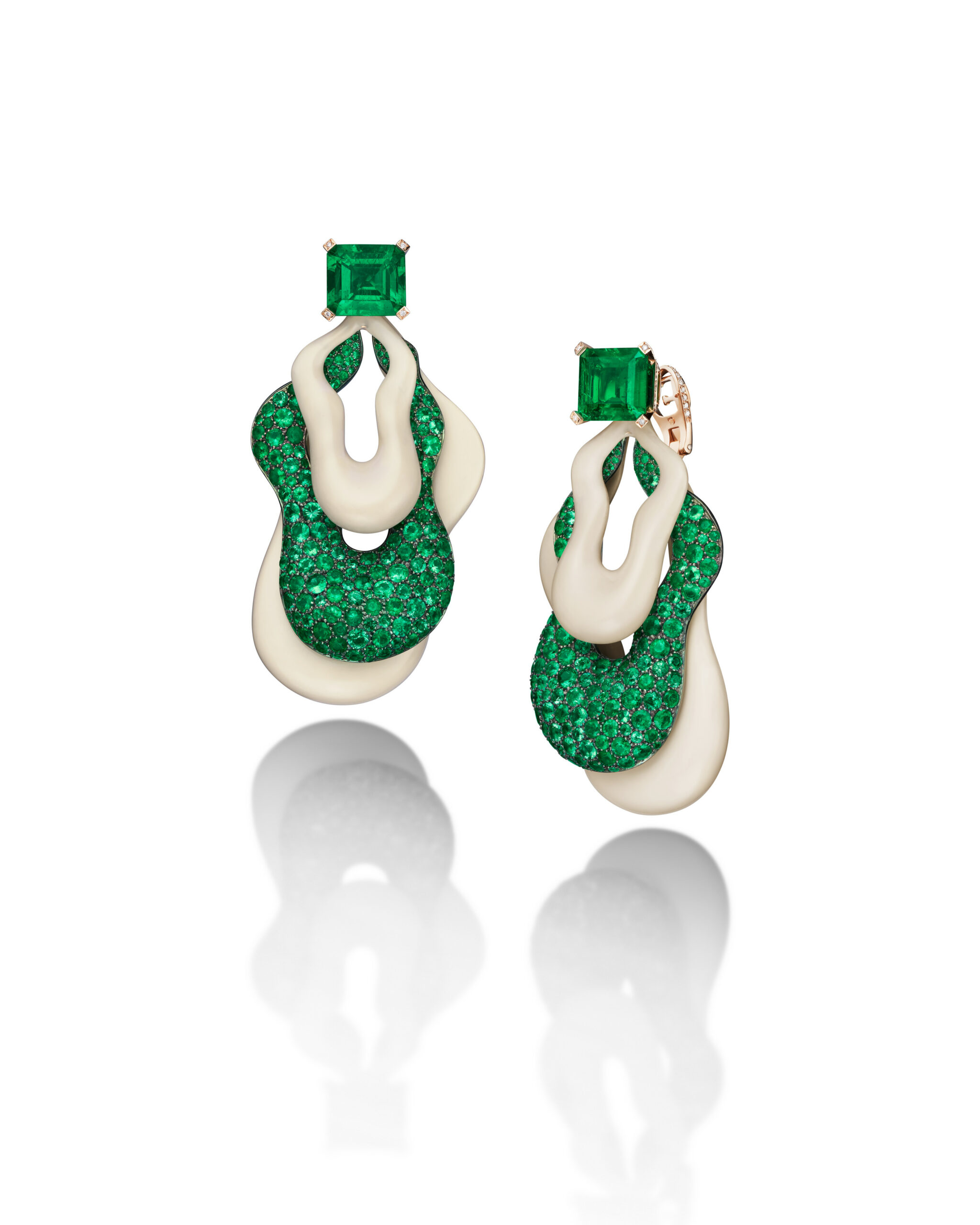 L’extrême vigilance sur la traçabilité des pierres se combine à la grande exigence des critères de sélection. Observées à la lumière du nord, qui révèle les plus belles cristallisations, les émeraudes les plus narratives viennent ain- si composer de véritables manifestes de féminité. Faussement classiques, les boucles d’oreilles graphiques s’autorisent une asymétrie, tandis que le collier point