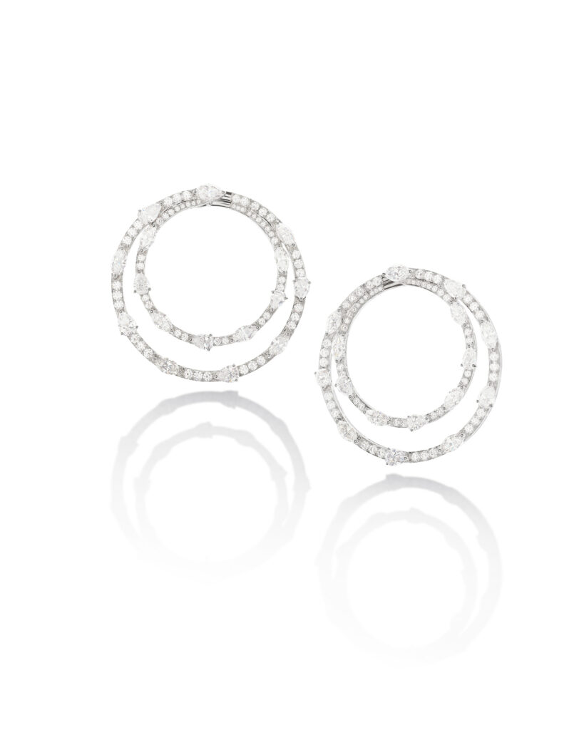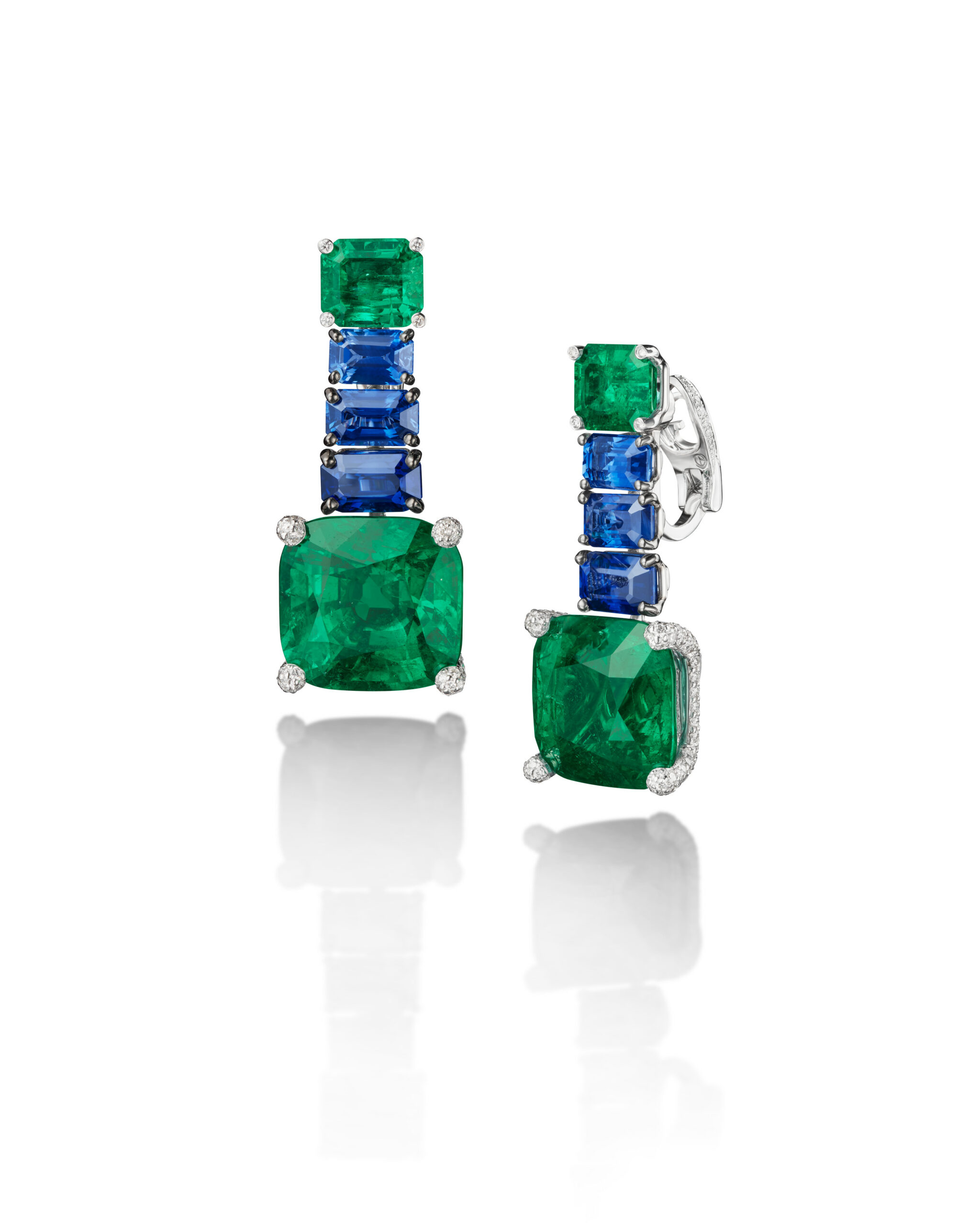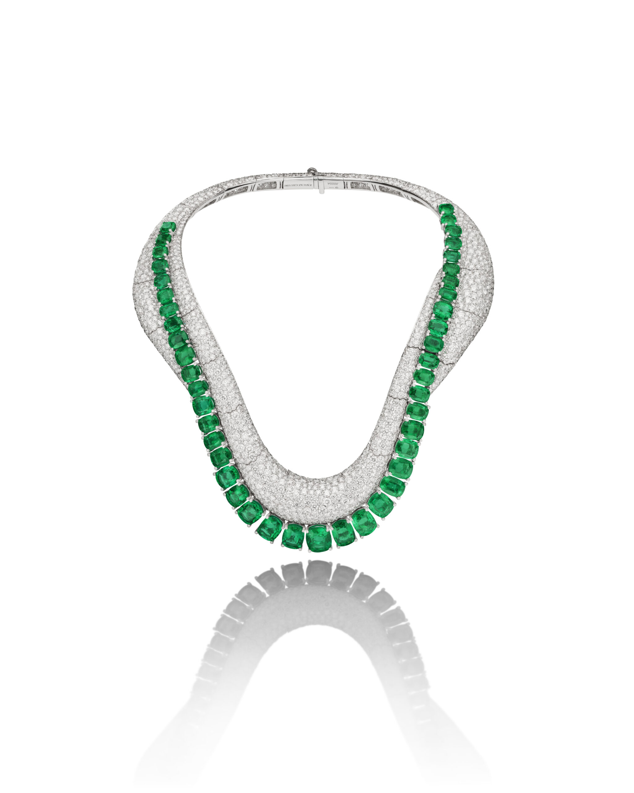 L’extrême vigilance sur la traçabilité des pierres se combine à la grande exigence des critères de sélection. Observées à la lumière du nord, qui révèle les plus belles cristallisations, les émeraudes les plus narratives viennent ain- si composer de véritables manifestes de féminité. Faussement classiques, les boucles d’oreilles graphiques s’autorisent une asymétrie, tandis que le collier point