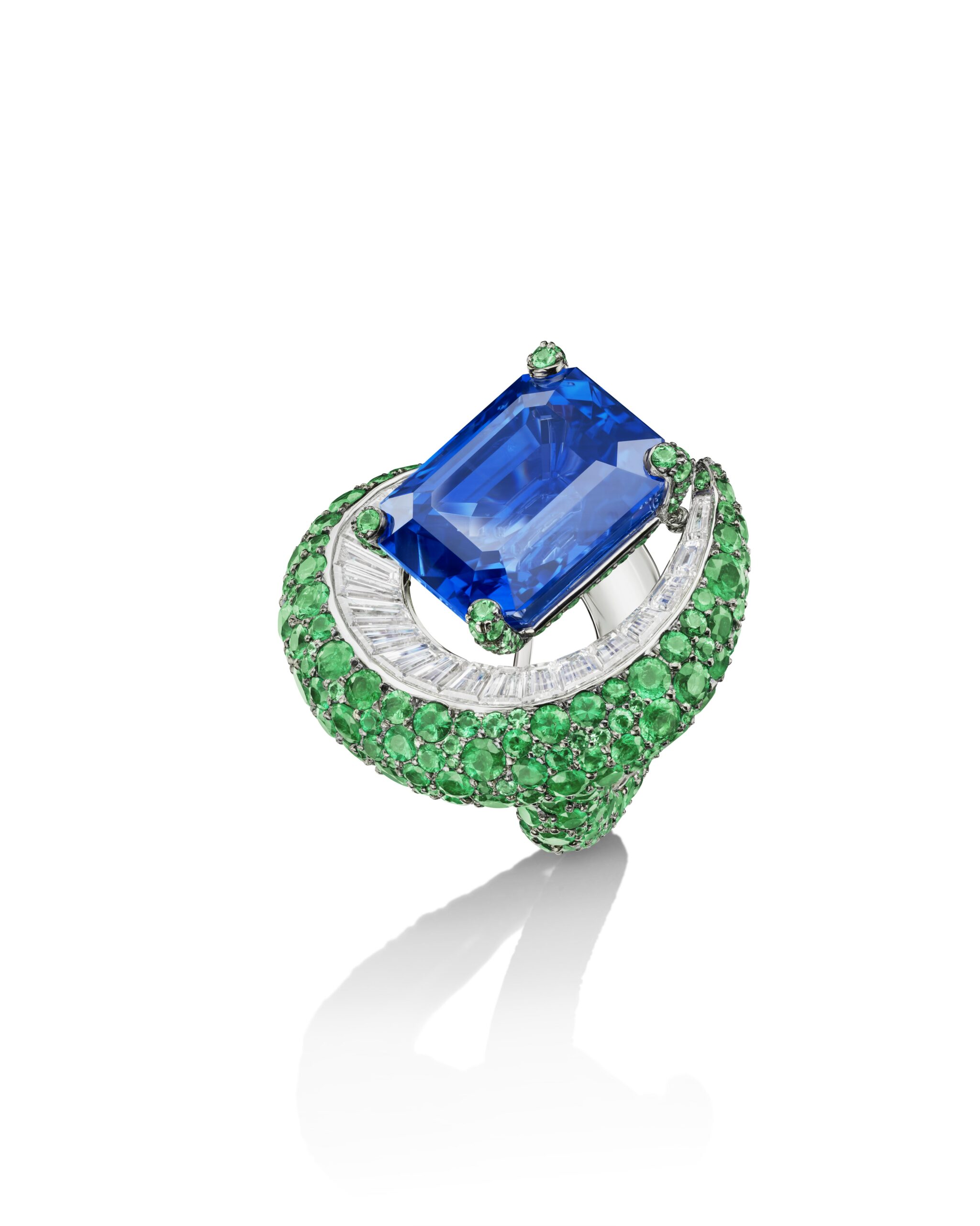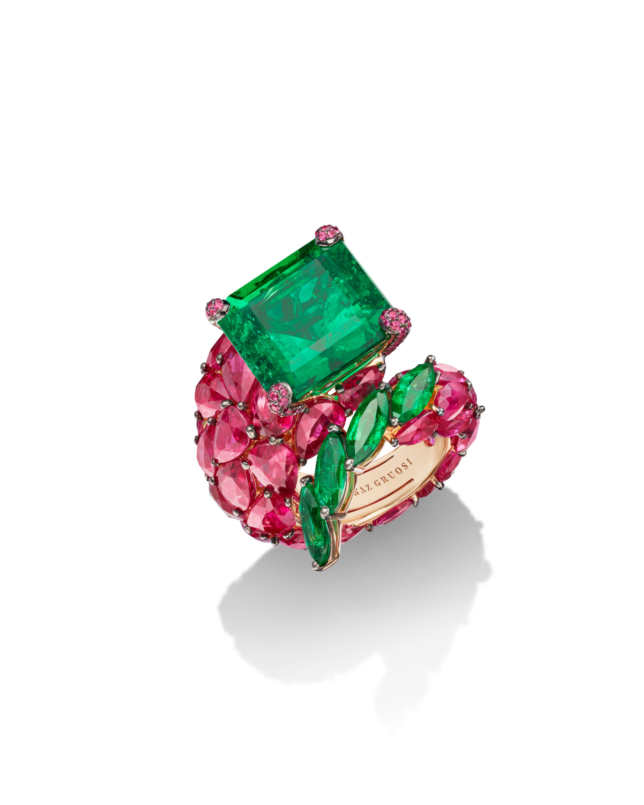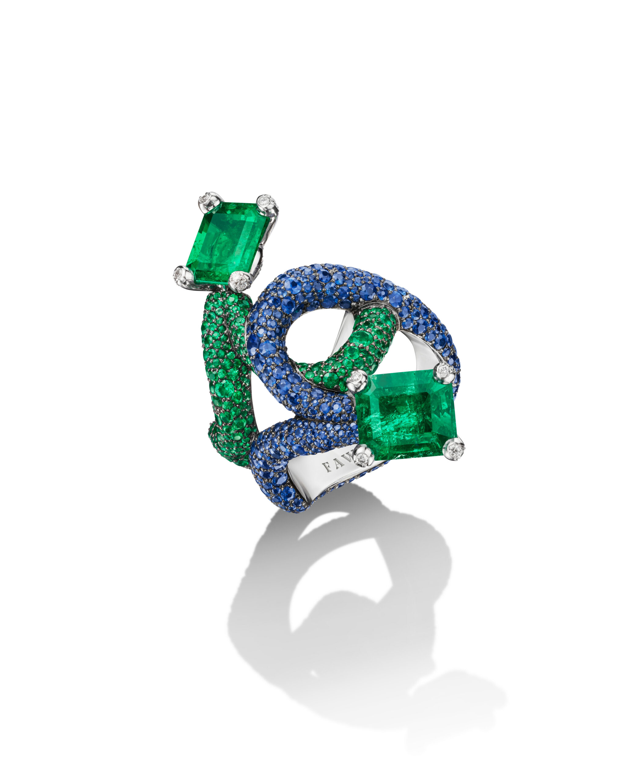 En 2020 s’est ouvert un nouveau chapitre avec le lancement de la maison FAWAZ GRUOSI. L’inauguration d’une boutique londonienne, à Berkeley Square, consacre une créativité haute en couleur qui se nourrit de principes immuables. L’émotion née de la rencontre entre le créateur et les pierres en constitue le fondement premier. Dans le langage joaillier qu’invente FAWAZ GRUOSI, chaque gemme a sa place. La beauté, la couleur et la personnalité priment sur la valeur. Seules celles capables d’inspirer et de séduire ont droit d’atelier. « Je veux créer des bijoux qui procurent autant d’émotion à celles qui les portent qu’à celles et ceux qui les admirent. » Les nouvelles pièces de haute joaillerie le confirment. À l’image de cette bague reptilienne à tête en émeraude de Colombie taille carrée de 15,04 carats au vert velouté dense posée sur un corps de rubis.