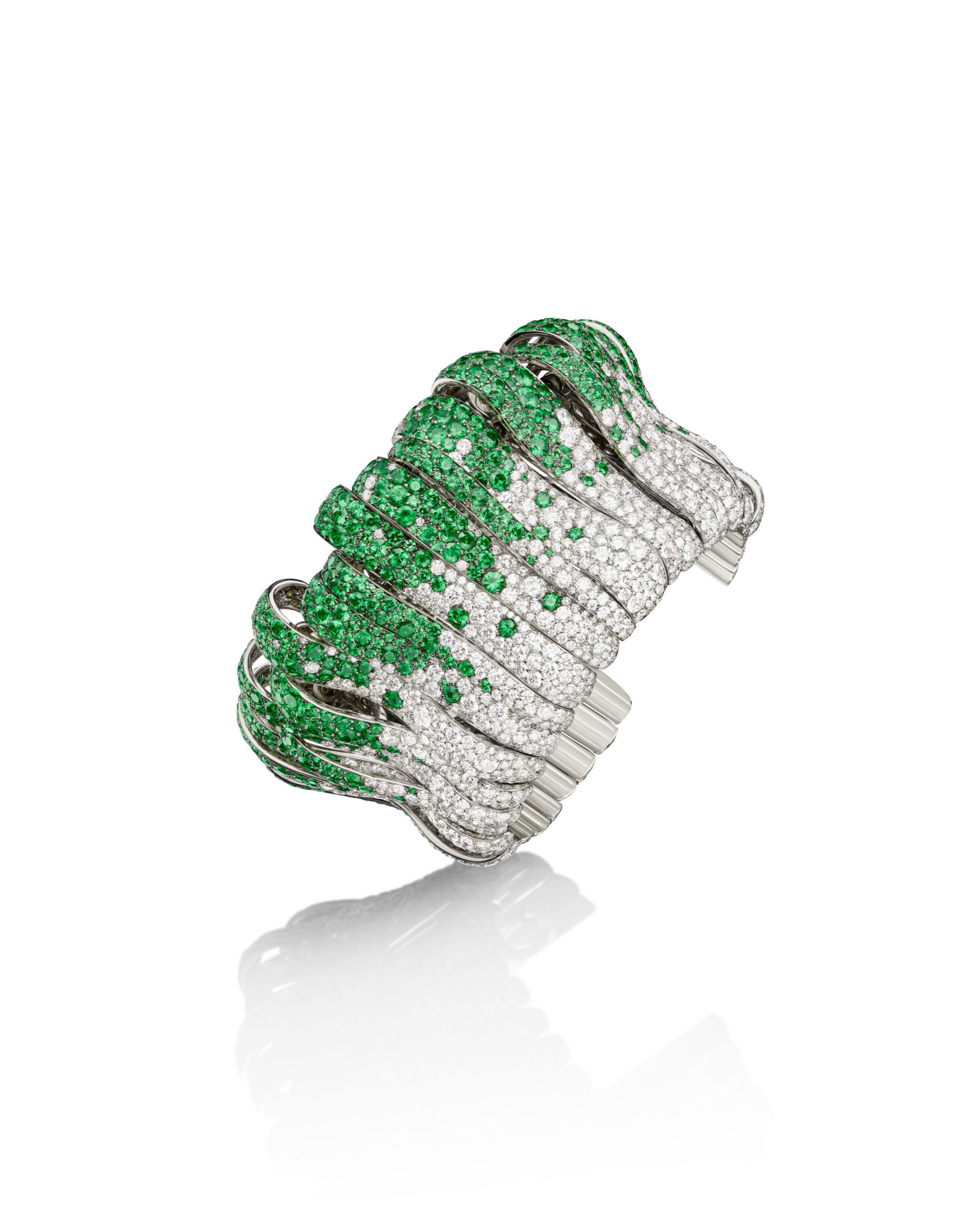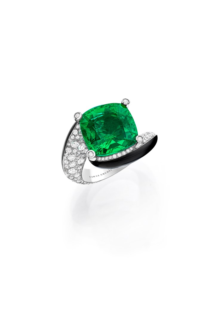 Dans l’atelier basé à Genève, les artisans cultivent un savoir faire joaillier où les gestes ancestraux se frottent aux dernières nées de la technologie. La virtuosité des appairages, la délicatesse des sertissages, à commencer par le serti signature de la maison, deux grains par pierre, la technicité d’un fermoir ou d’une articulation, chaque geste, chaque innovation a sa raison d’être, tous concourent à la beauté et au confort de la pièce. C’est le cas de ce collier spectaculaire à huit rangs sertis d’émeraudes sur lequel dansent 115,55 carats de cabochons d’émeraudes faisant se rencontrer bijou de maharani et d’executive. Sur une manchette, la beauté du sertissage de plus de deux mille sept cents diamants et tsavorites vient évoquer les touches animées d’un piano mécanique, tandis que le titane marié à l’or rose donne naissance à des boucles d’oreilles légères comme des ailes d’oiseau. Le titane se marie également à la céramique ivoire façonnée en courbes résonnant avec les émeraudes sur des boucles d’oreilles organiques. La fluidité caractérise aussi ces pendants d’oreilles faisant cascader des calices sertis de diamants et d’émeraudes. De la première esquisse à la rencontre avec celle qui le choisira, un bijou FAWAZ GRUOSI est plus qu’un bel objet précieux. Il est un confident entré dans l’intimité de celle qui le porte, un signe de force sur lequel s’appuyer, un hommage à la femme du XXIe siècle, à la fois épouse, mère, fille…..