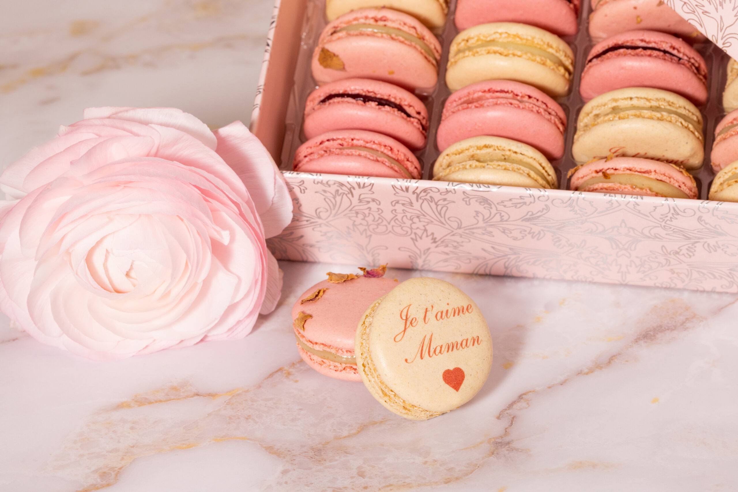 Coffret Arabesque rose 20 macarons assortiment fête des mères – 57 €